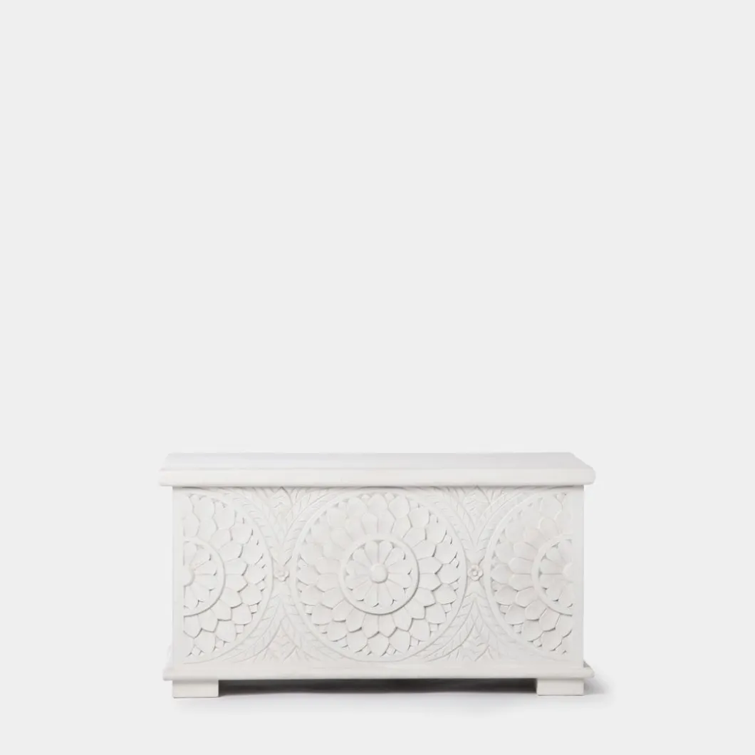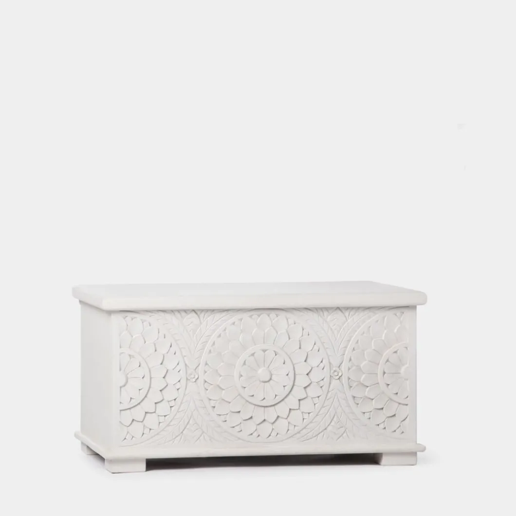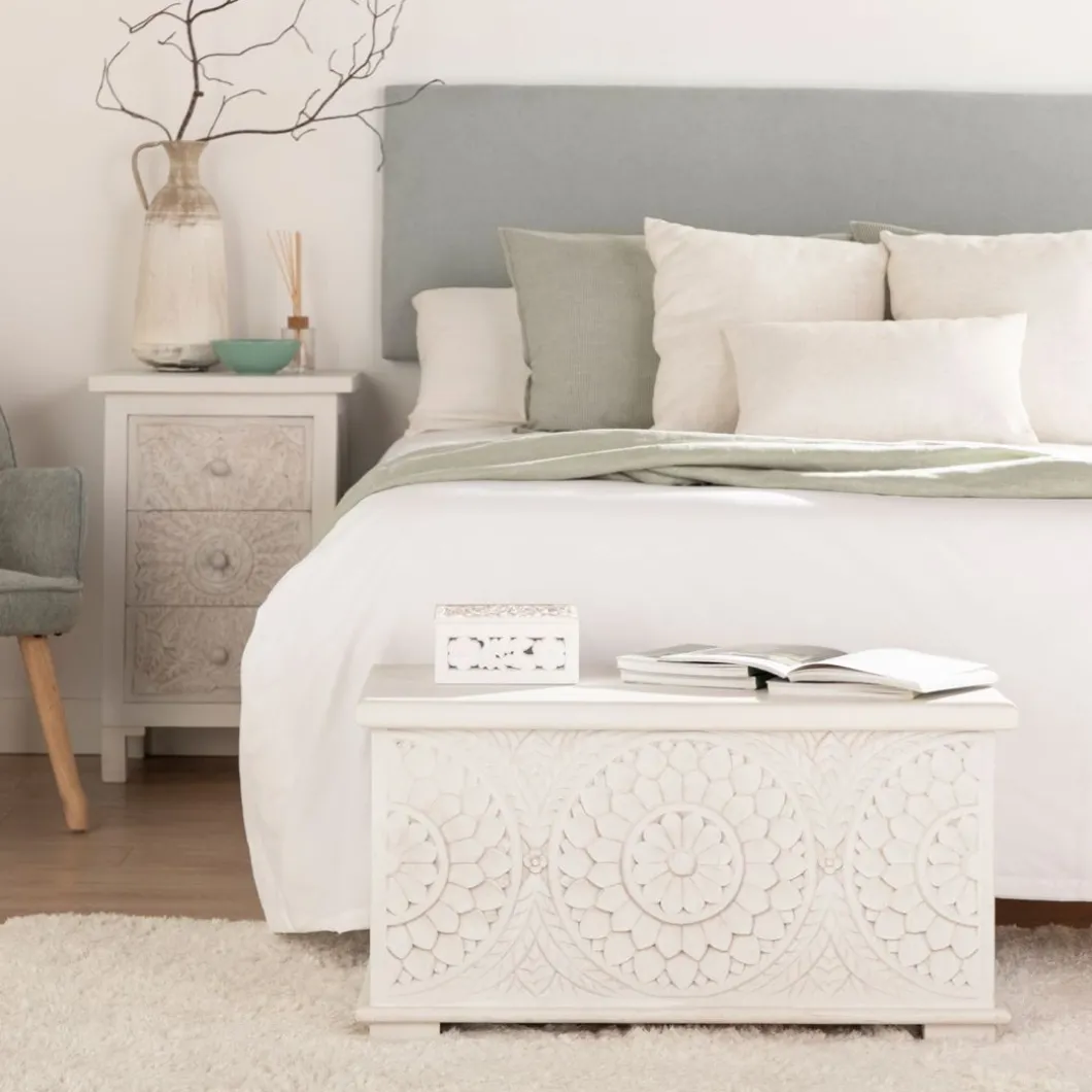 El baúl en blanco vintage Aday es una pieza única que no pasará desapercibida en tu hogar. Puedes colocarlo en el salón, el recibidor o el dormitorio y conseguir un extra de almacenaje. Ha sido fabricado artesanalmente, por lo que cada pieza es única.