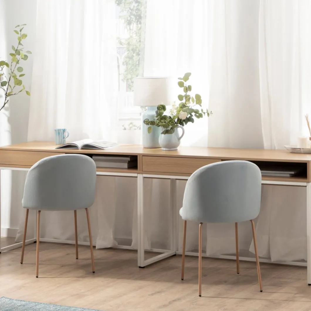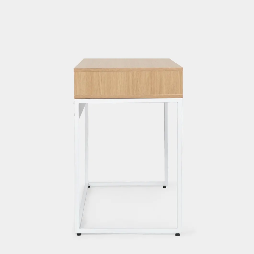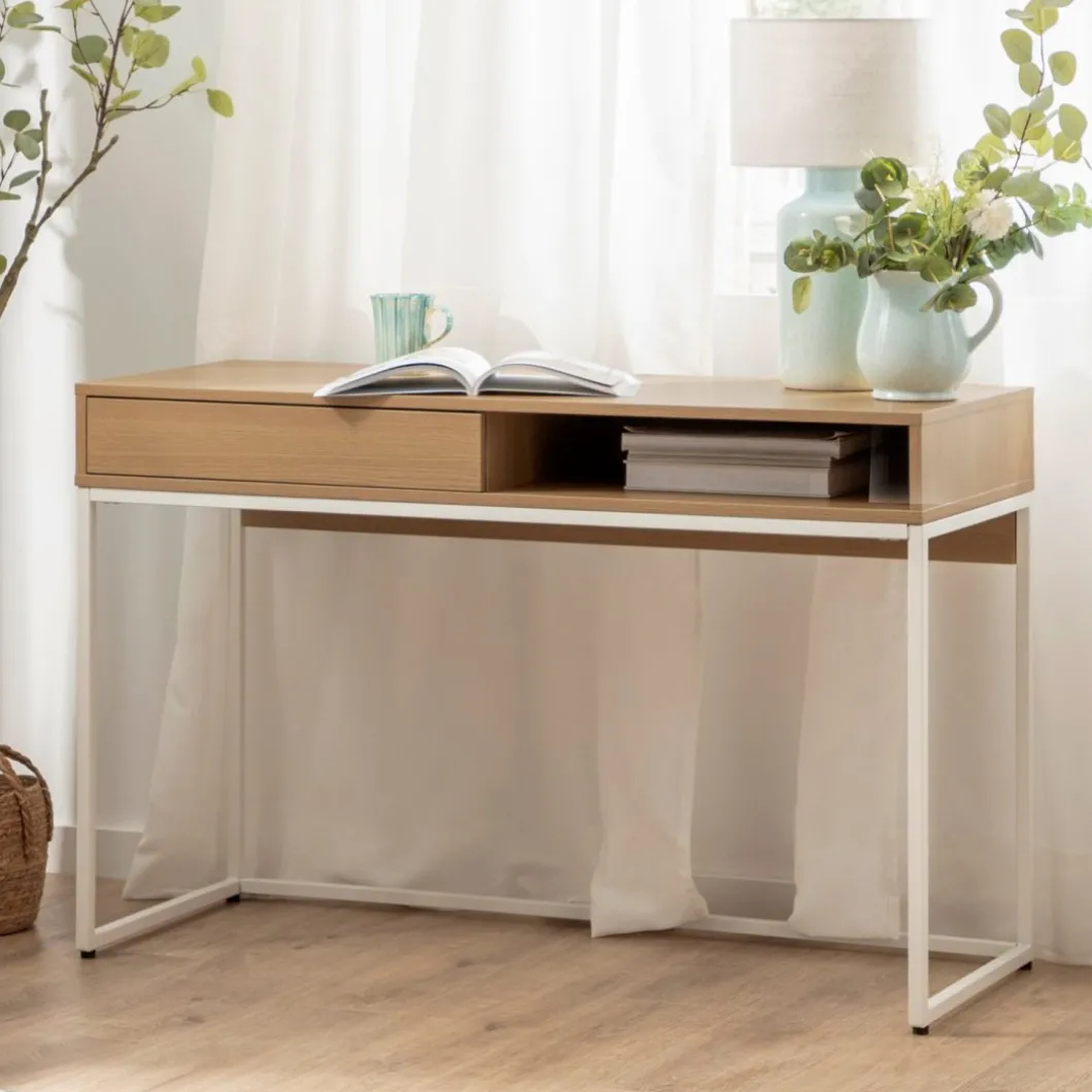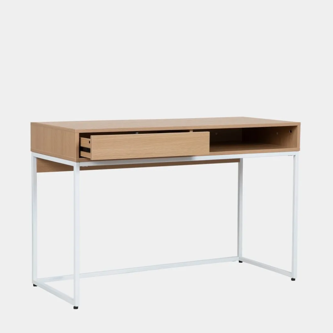 El escritorio Aidan en madera color natural con pata metálica blanca ofrece funcionalidad y estilo a cualquier espacio. Equipado con un cajón y un hueco superior, proporciona una organización eficiente para tus necesidades diarias. Aidan combina calidez y frescura en un diseño que potencia la productividad con elegancia y simplicidad.