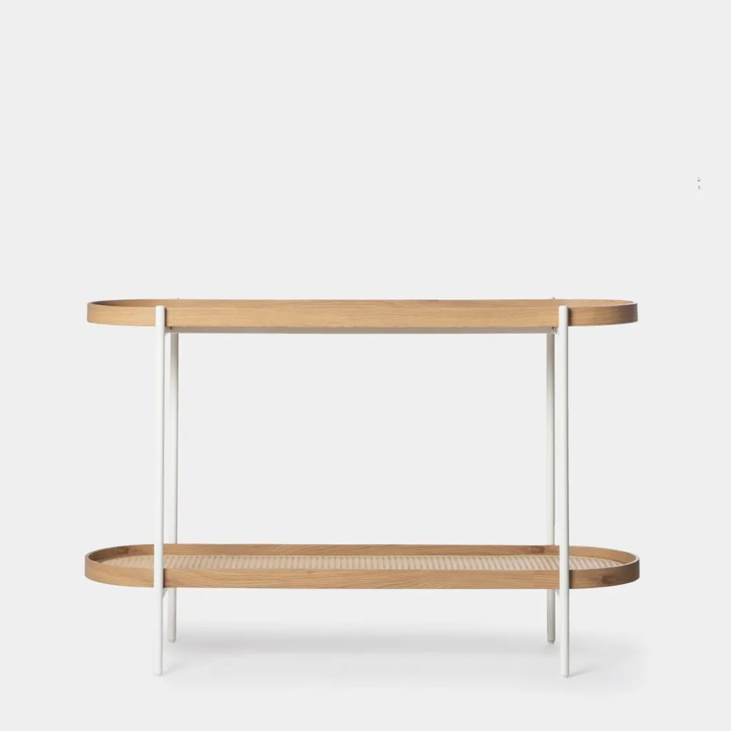 Dale un toque nórdico a tu hogar con la consola en madera color natural y ratán con pata metálica blanca Aleis. Esta versátil pieza se adapta fácilmente a diferentes espacios, puedes utilizarla en la entrada como un elegante recibidor o en el salón, como una estantería baja en la que puedes exhibir tus objetos decorativos con estilo y mantener la organización de tu hogar impecable.