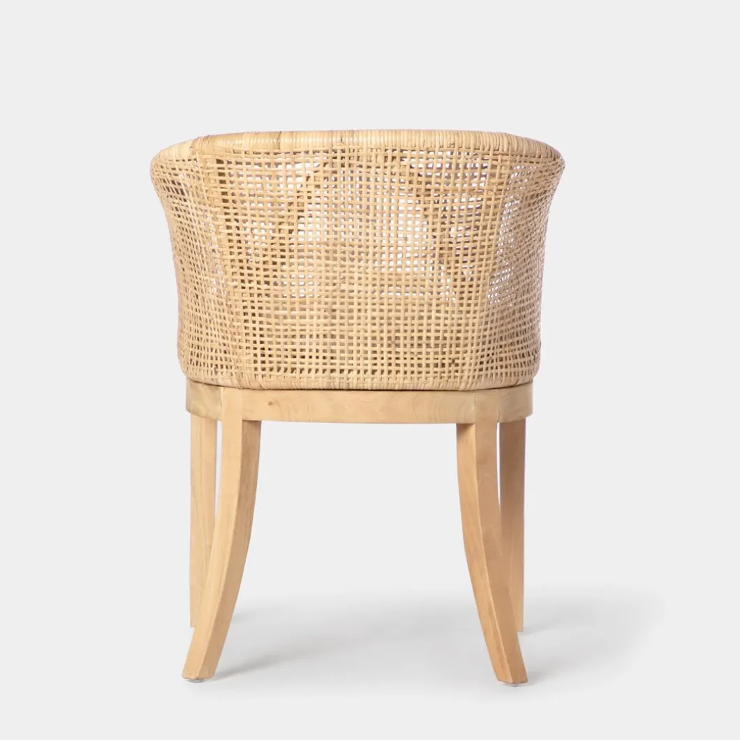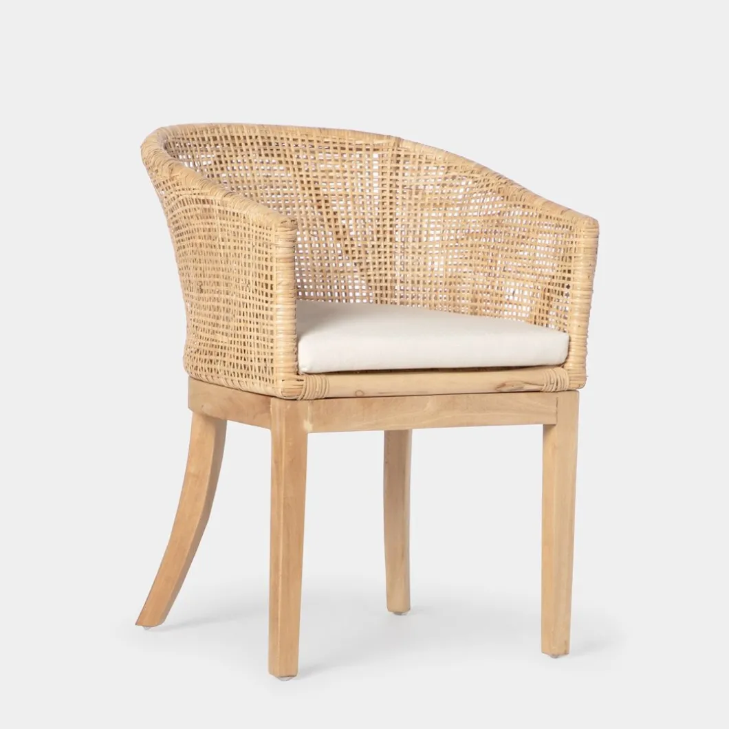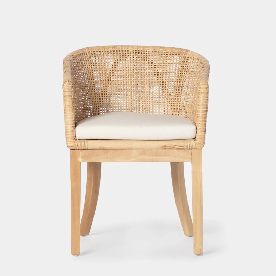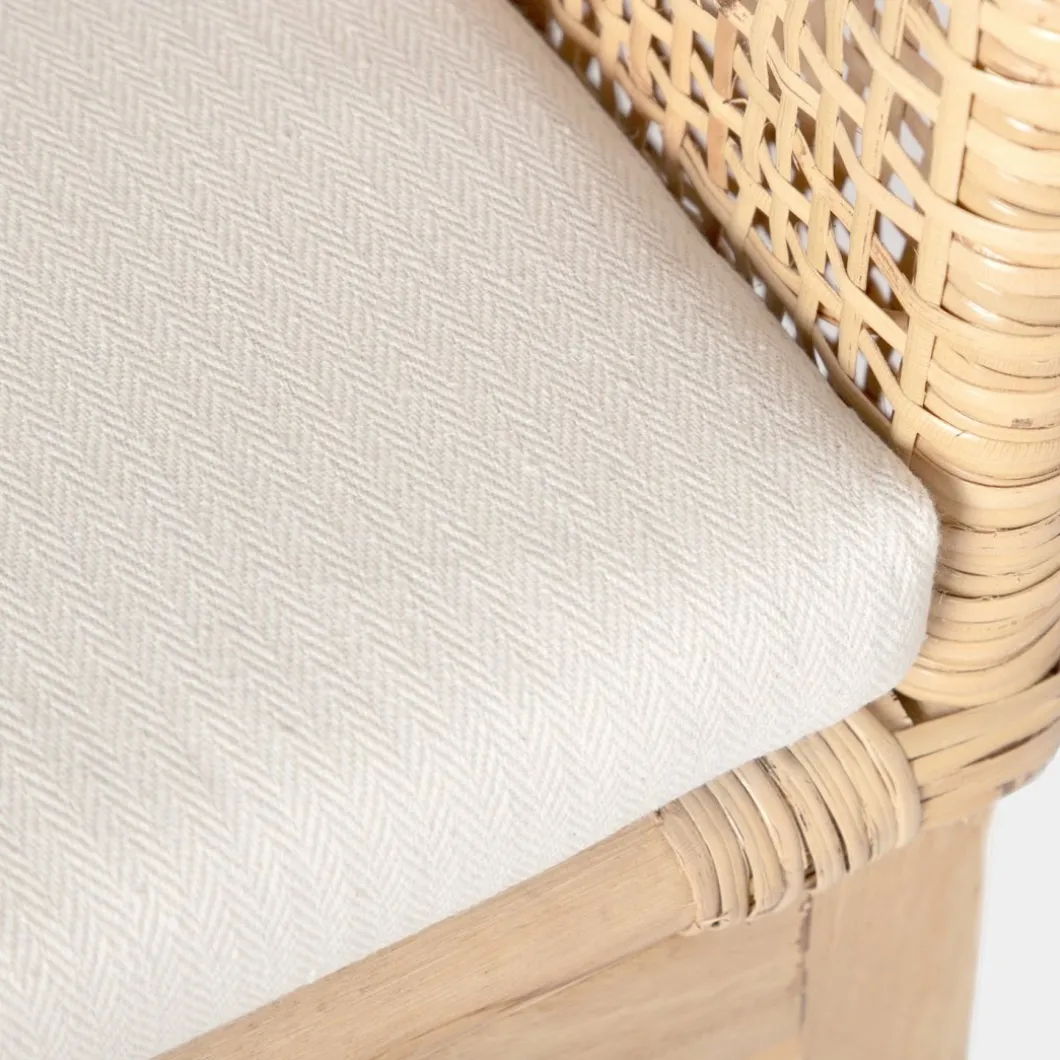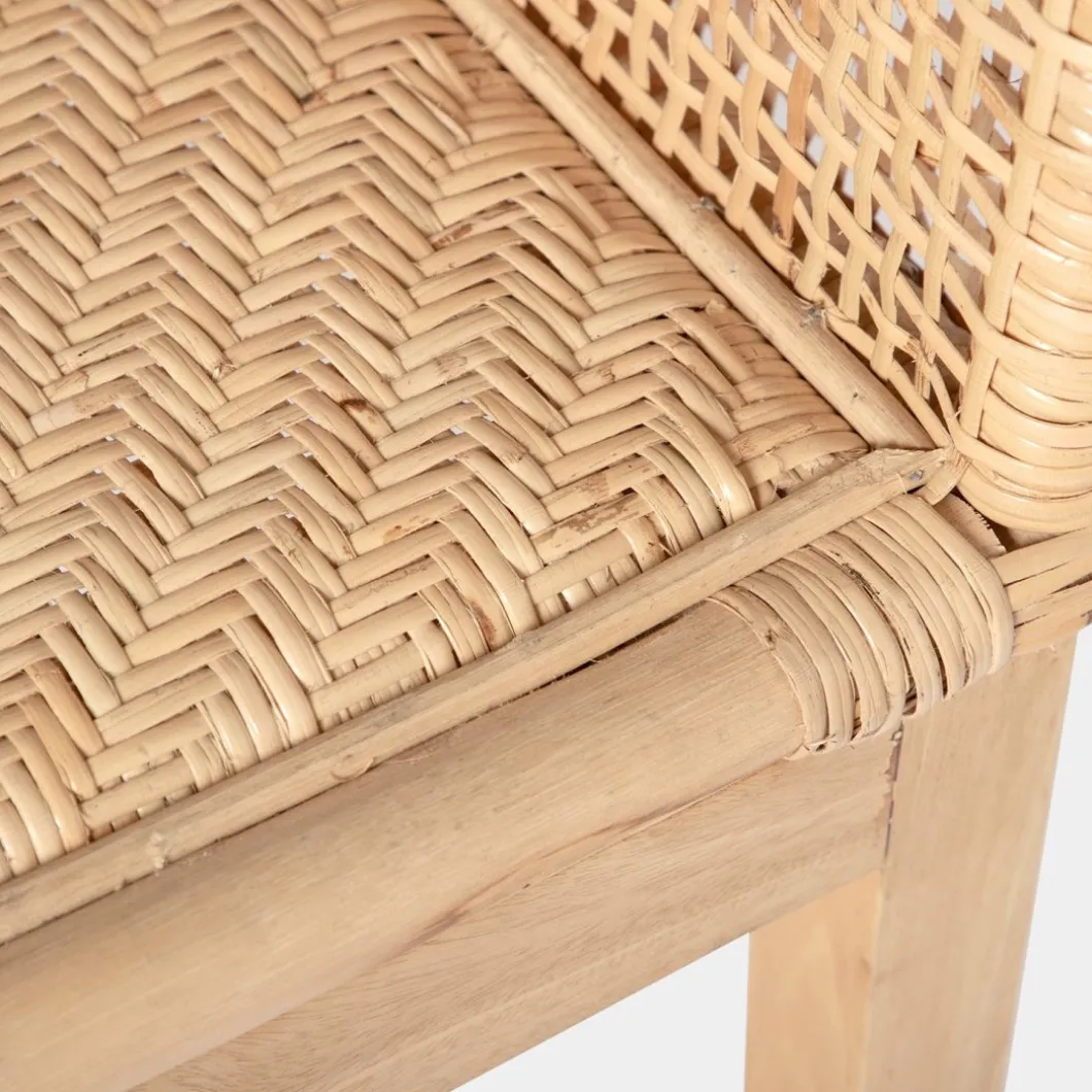 Con la silla de comedor Alen, aportarás un toque cálido y natural a tu comedor, salón o cocina. Fabricada con ratán natural y madera de mindi, esta silla destaca por su calidez y estilo natural. Cada silla es una pieza única, elaborada artesanalmente por expertos, por lo que puede presentar ligeras irregularidades propias de la naturaleza del material, que contribuyen a su encanto singular. Incluye un cojín desenfundable para mayor comodidad.