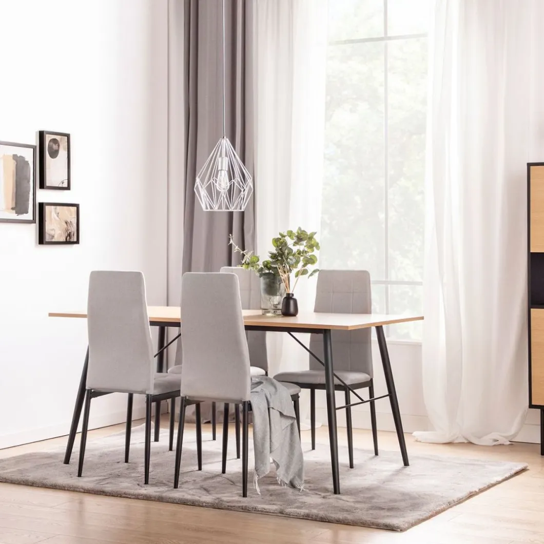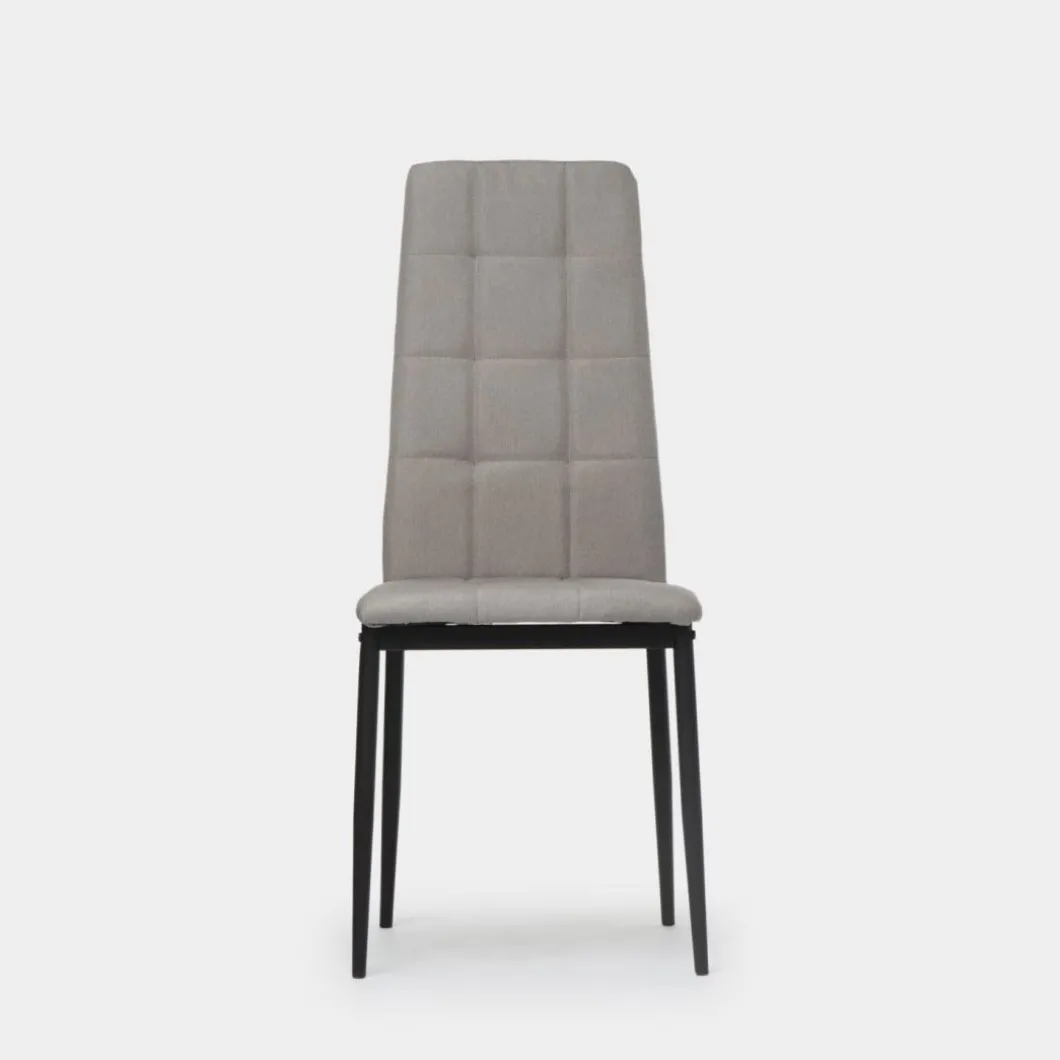 La silla de comedor tapizada Anne con patas metálicas negras se trata de una pieza ideal para los amantes del interiorismo y la decoración más exigentes. Sus diseño con respaldo alto tapizado en poliéster se encuentra disponible en 2 colores, elige entre uno de ellos para aportar un aire moderno a tu comedor.