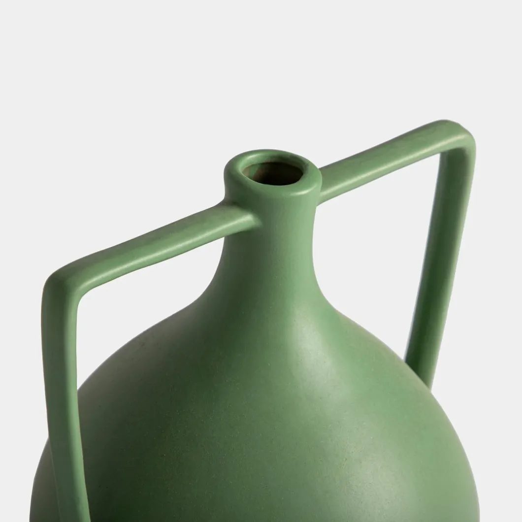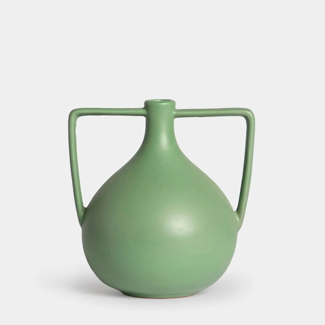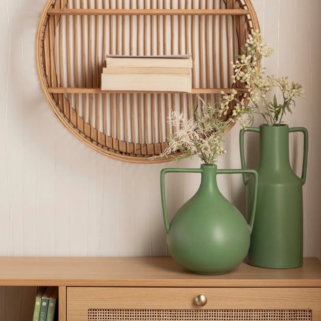 Este encantador jarrón de gres en color verde es una pieza única que aporta un toque de elegancia rústica a cualquier espacio. Su diseño en forma de jarra, con dos asas funcionales, evoca una estética tradicional y atemporal. El acabado esmaltado en verde profundo destaca por su vibrante color y su suave brillo, mientras que las asas proporcionan un detalle distintivo y práctico. Perfecto para exhibir flores frescas o ramas decorativas, este jarrón es un complemento versátil que realza tanto interiores modernos como clásicos.
