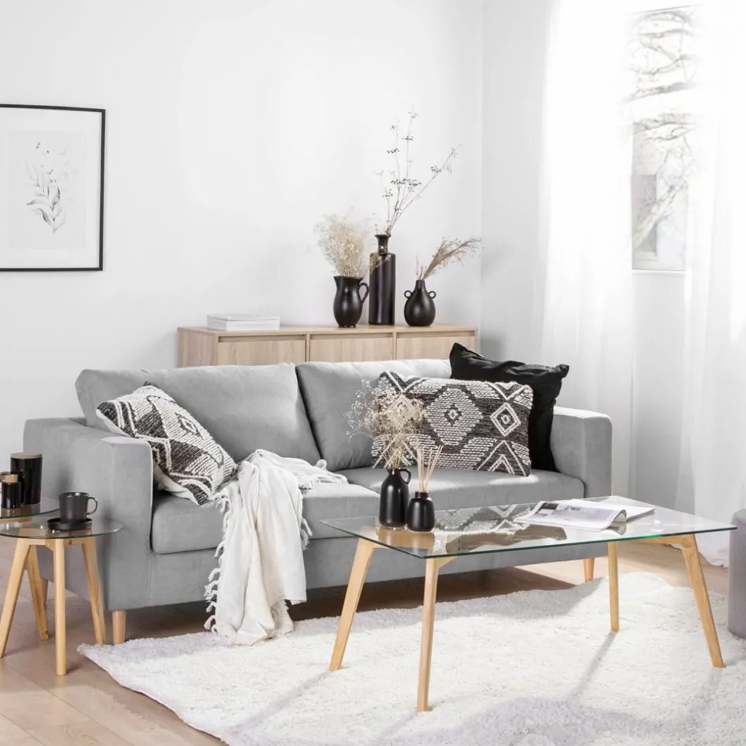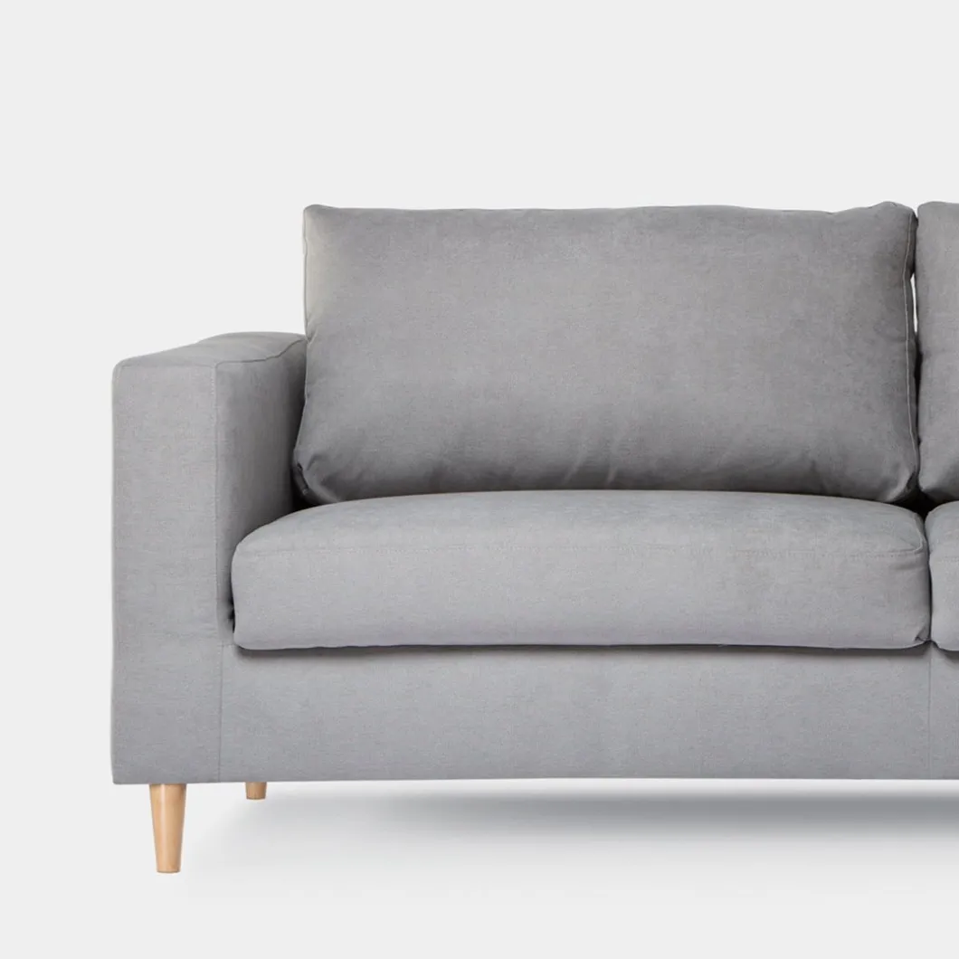El sofá tres plazas Beth en color gris es cómodo y estiloso. Su patita en madera despuntada proporcionará un look nórdico a tu salón. Lo encontrarás también disponible en color beige.