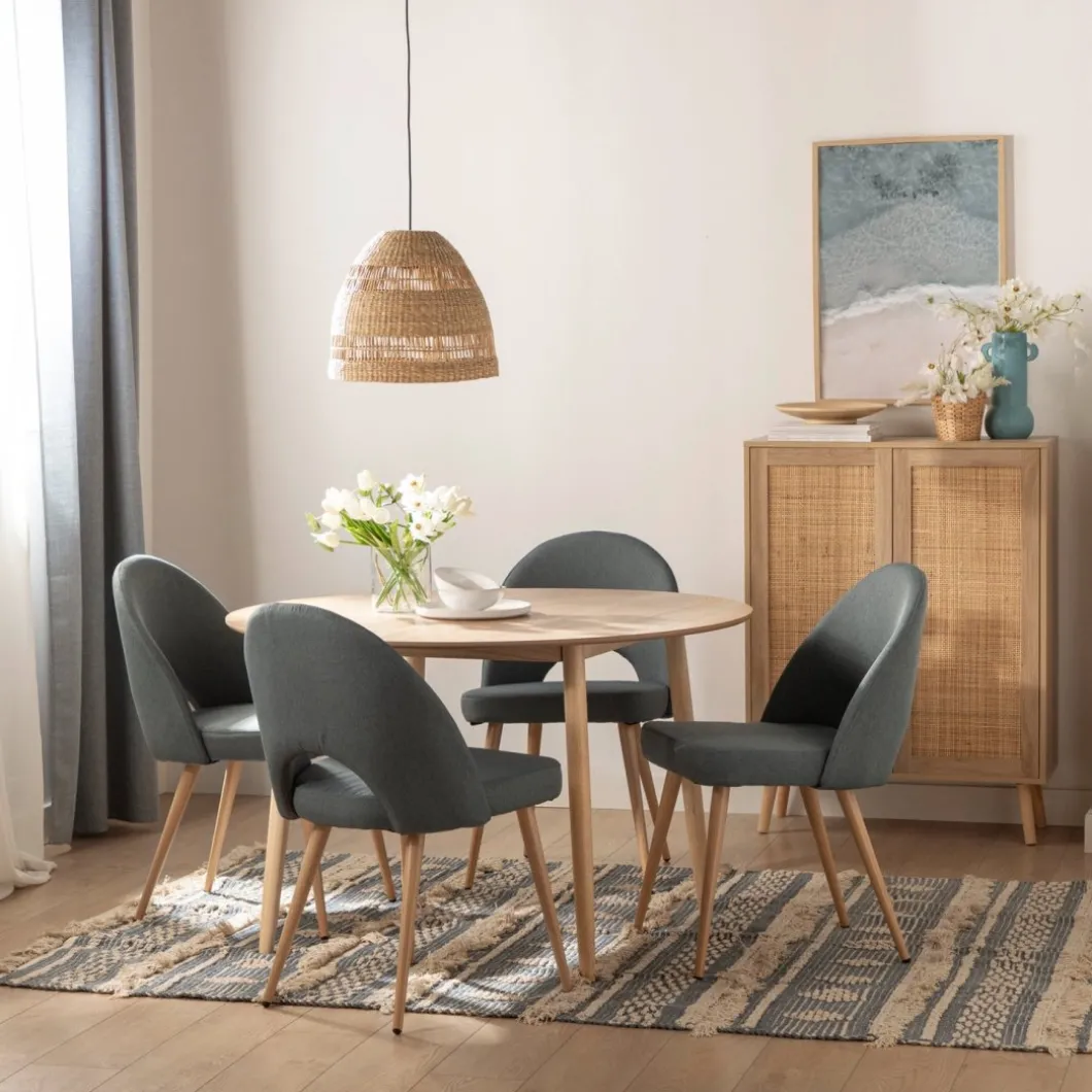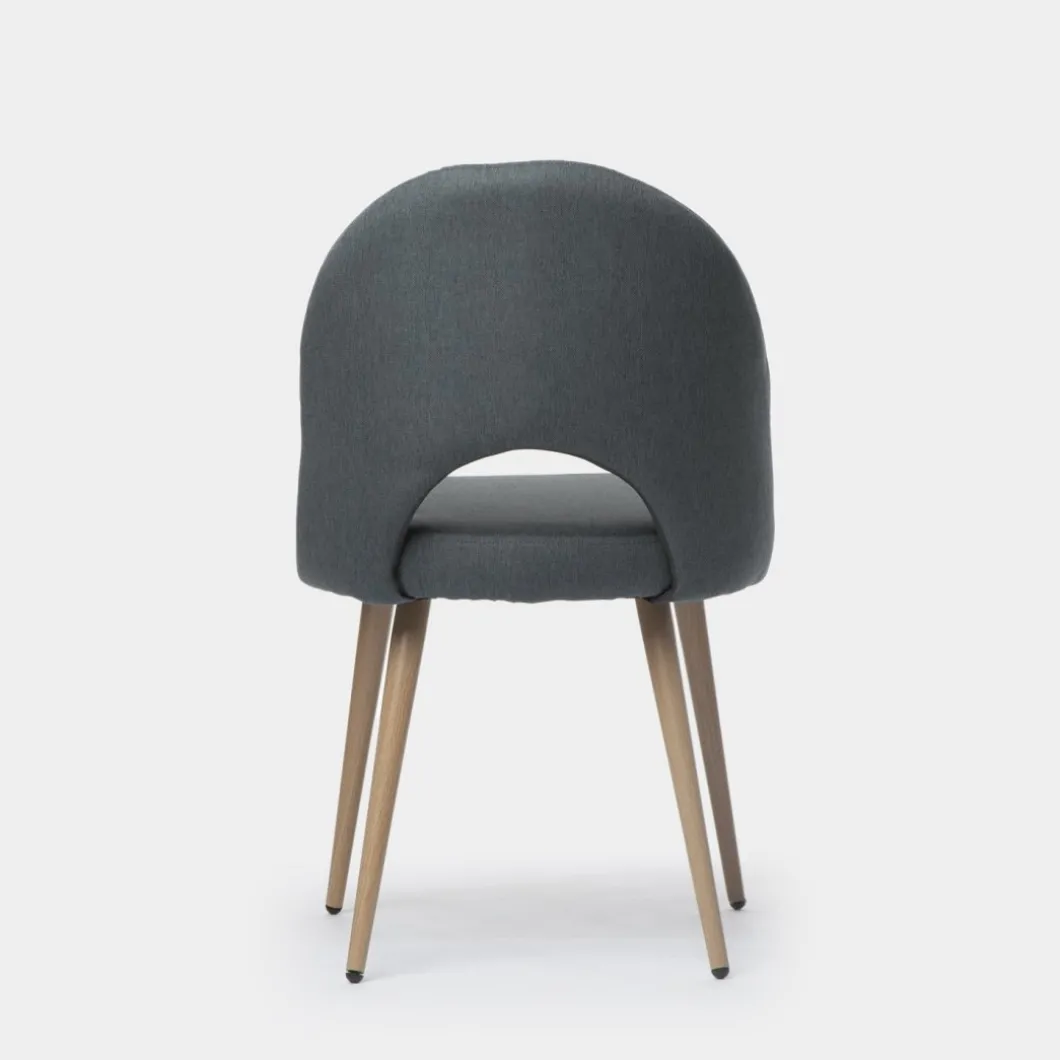 La silla de comedor tapizada Blair es una preciosa silla con respaldo ergonómico y apertura central fabricado en poliéster, lo que le aporta una sentada realmente confortable. Sus patas metálicas en efecto madera hacen de esta silla es una opción que encandilará a los amantes del diseño nórdico más actual. Elige entre los 4 colores disponibles en nuestra web y para darle un toque elegante a tu comedor.