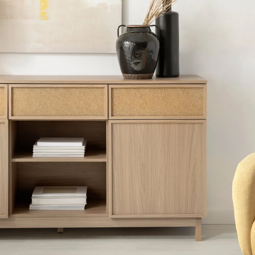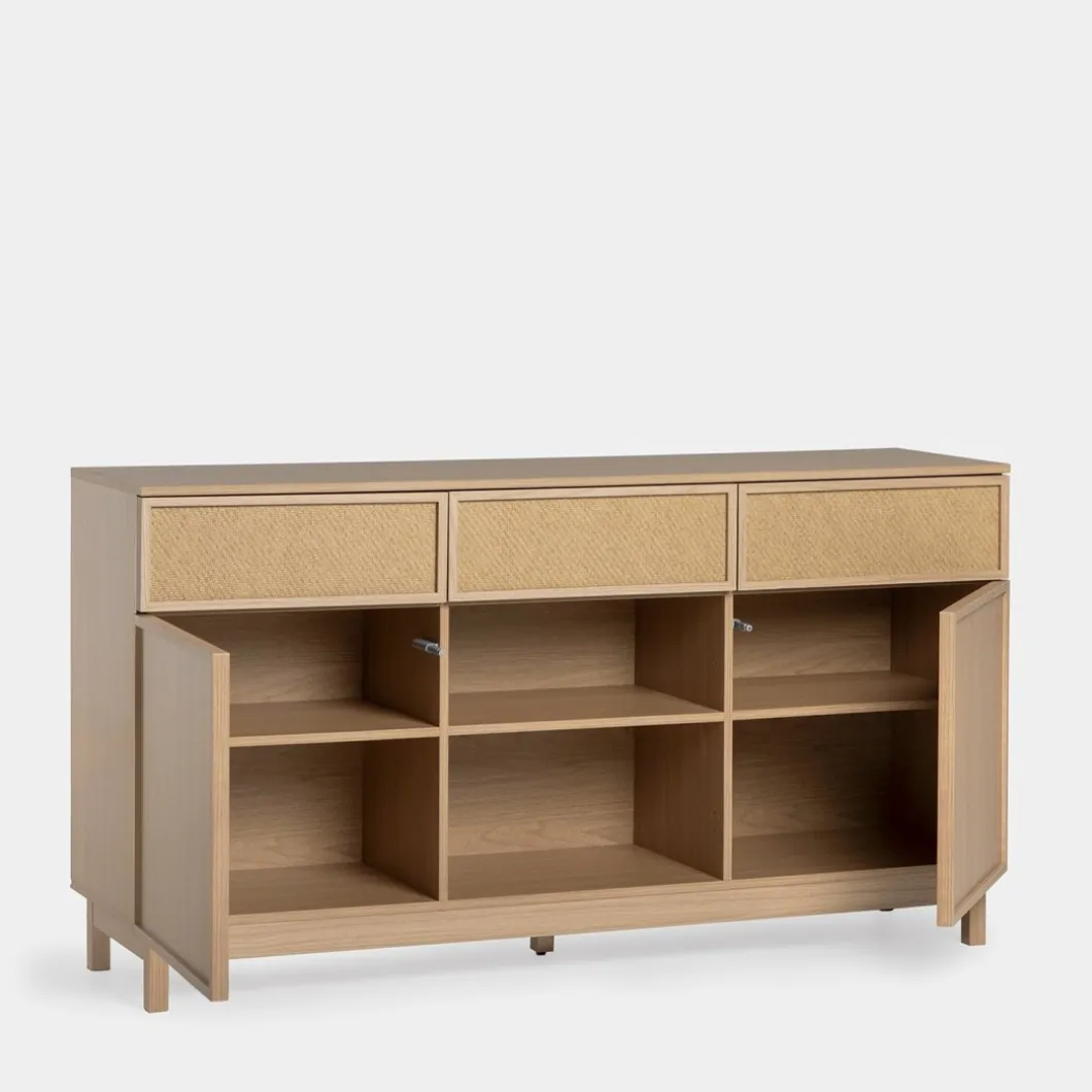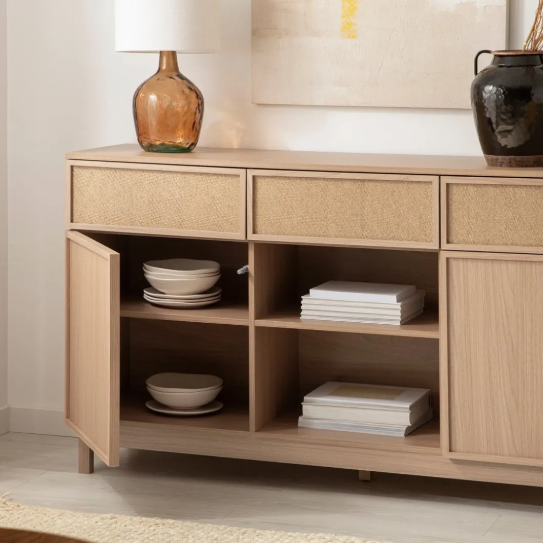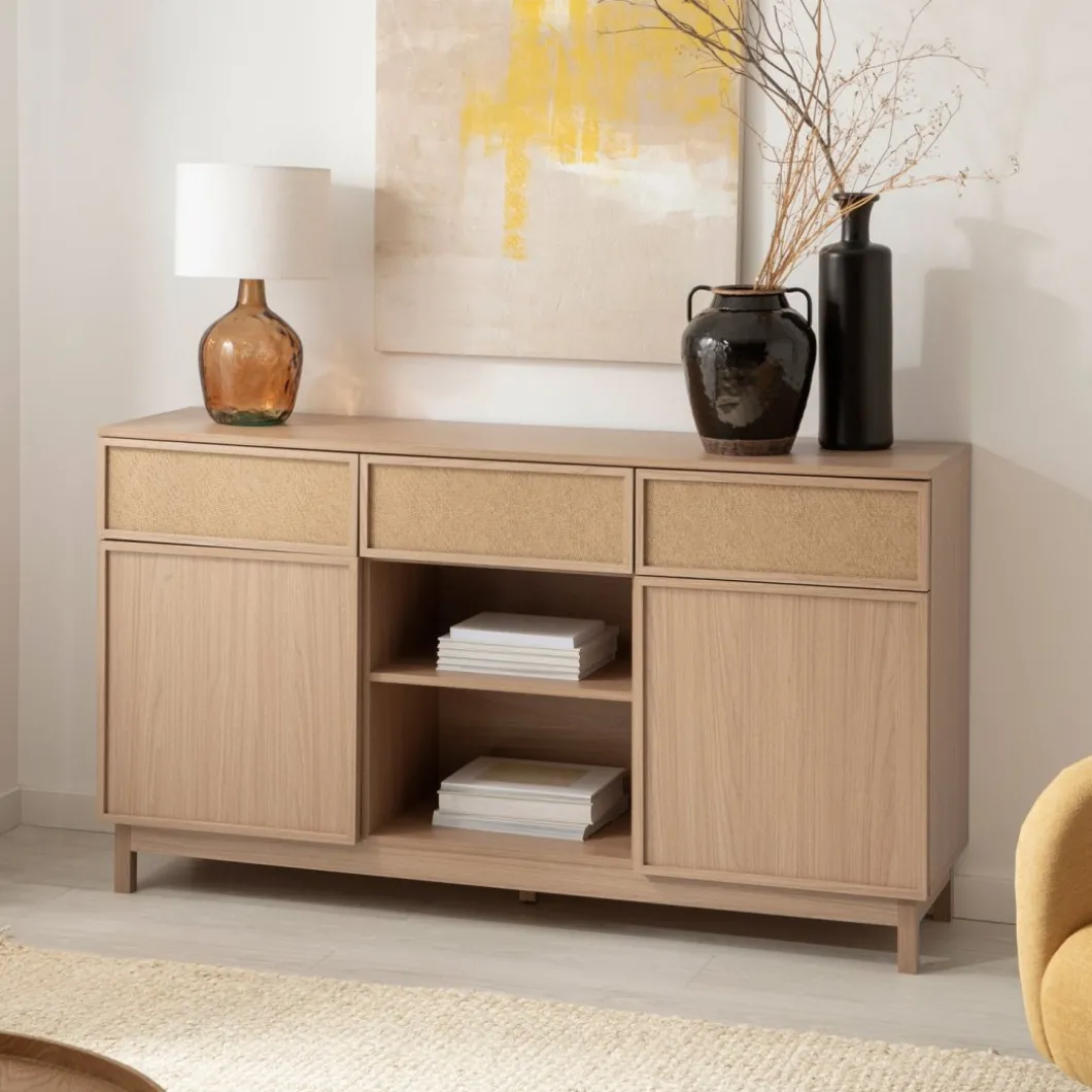 Agrega un toque de funcionalidad y estilo a tu hogar con el aparador Bora, elaborado en madera color natural y fibra natural. Este versátil mueble cuenta con tres amplios cajones y dos puertas, proporcionando un generoso espacio de almacenamiento para la vajilla, cubiertos y otros menajes del hogar. Completa la decoración de tu hogar con otros muebles de la colección Bora y logra un ambiente armonioso y lleno de estilo.