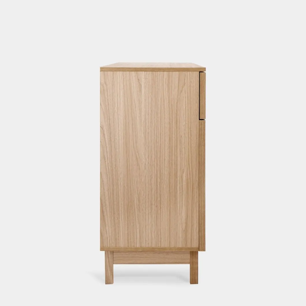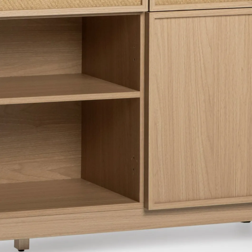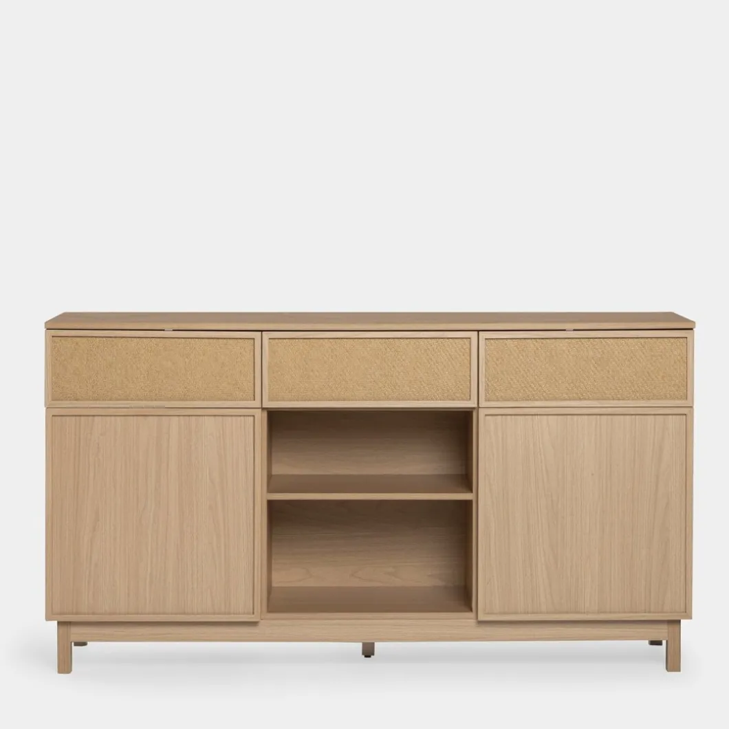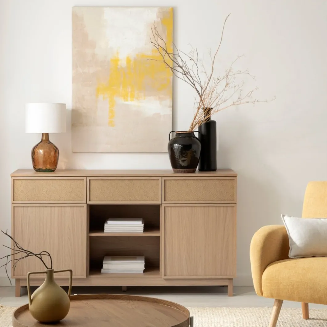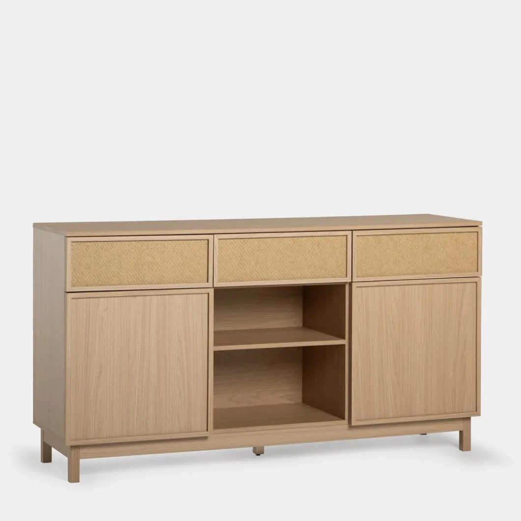 Agrega un toque de funcionalidad y estilo a tu hogar con el aparador Bora, elaborado en madera color natural y fibra natural. Este versátil mueble cuenta con tres amplios cajones y dos puertas, proporcionando un generoso espacio de almacenamiento para la vajilla, cubiertos y otros menajes del hogar. Completa la decoración de tu hogar con otros muebles de la colección Bora y logra un ambiente armonioso y lleno de estilo.