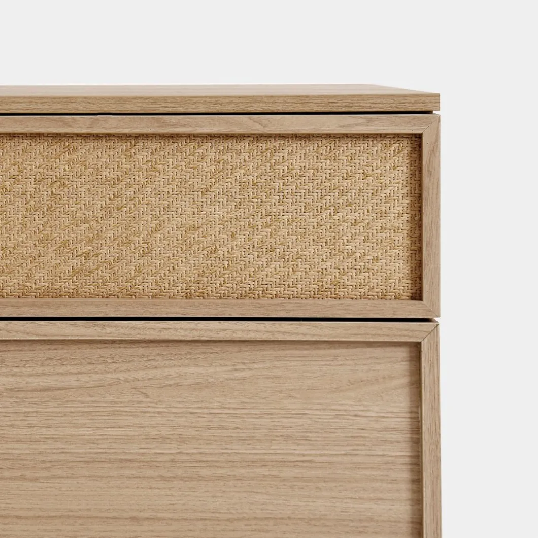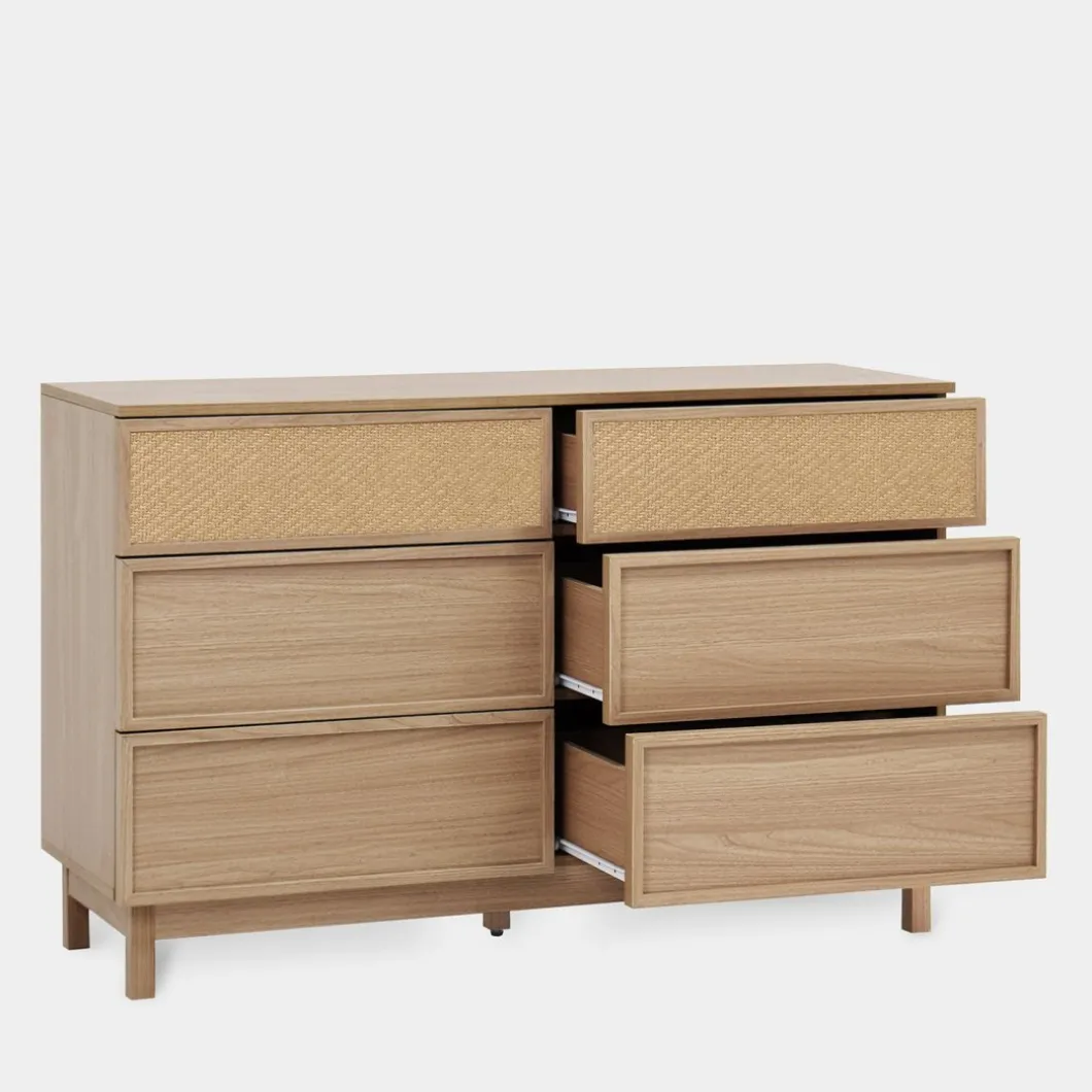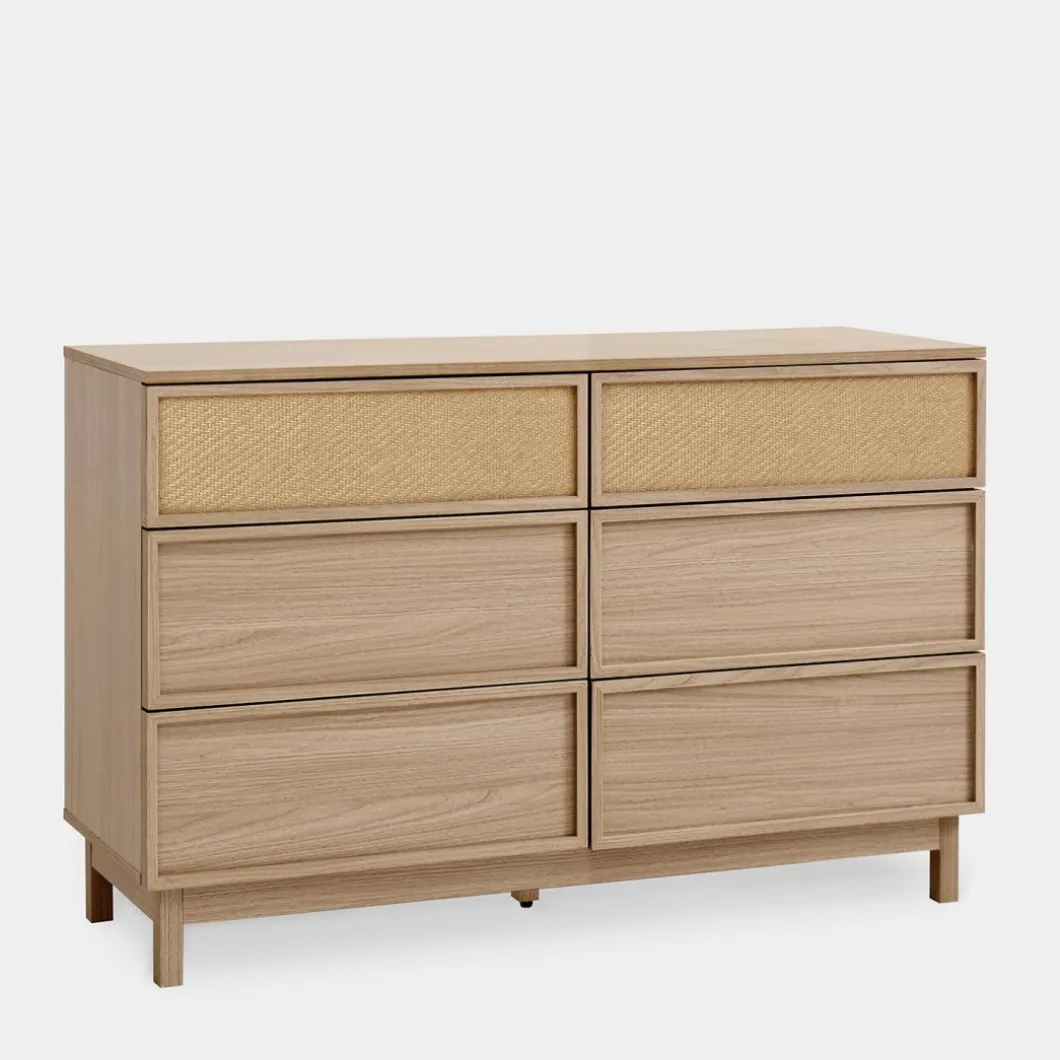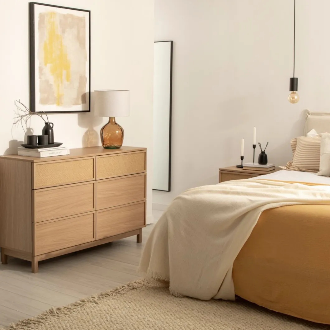 La cómoda de 6 cajones Bora, diseñada en madera color natural y fibra natural, es la elección perfecta para aportar un toque de calidez y estilo a tu dormitorio. Cuenta con seis amplios cajones ideales para organizar tu ropa, accesorios y otros objetos personales. Su diseño elegante y funcional se integra armoniosamente con el resto de los muebles de la colección, permitiéndote crear un ambiente armonioso y acogedor en tu hogar.