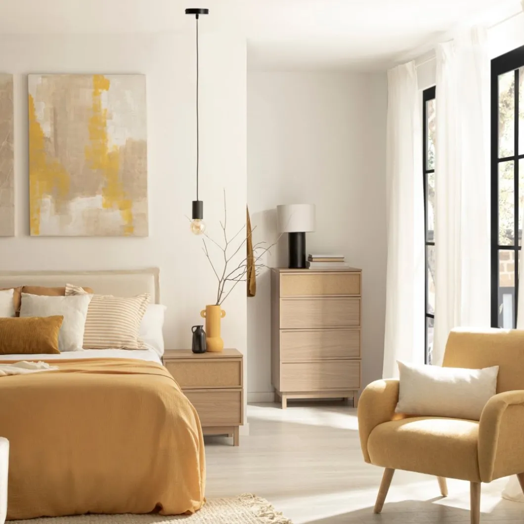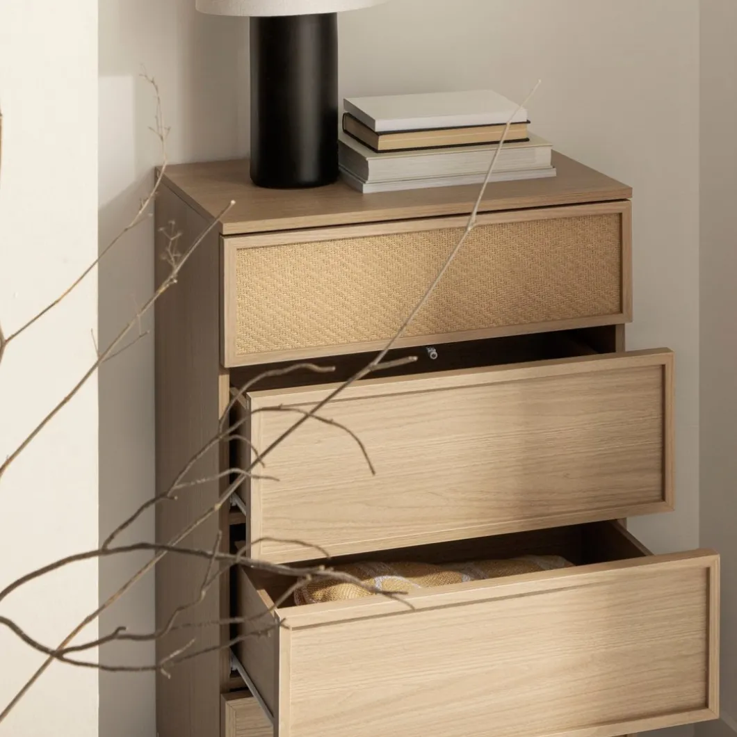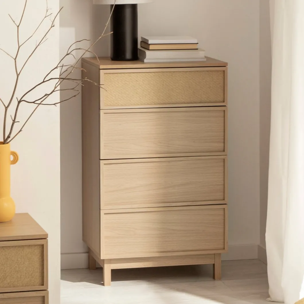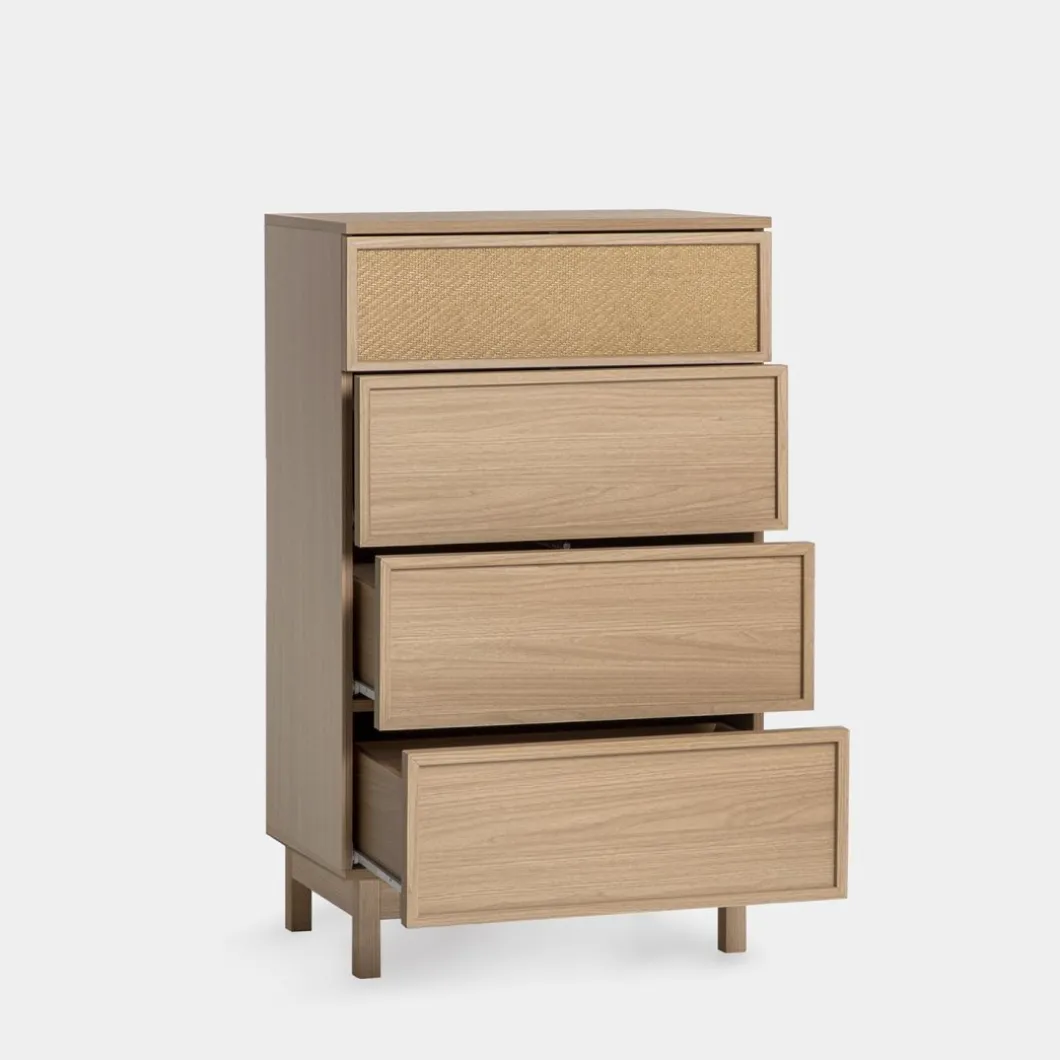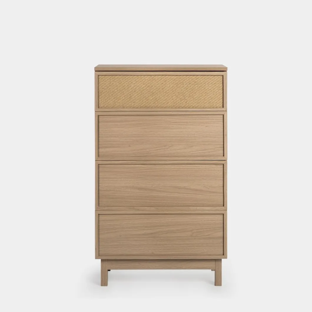 El sinfonier de 4 cajones Bora, elaborado en madera color natural y fibra natural, es ideal para añadir estilo y funcionalidad a tu dormitorio. Sus cuatro cajones espaciosos proporcionan un amplio almacenamiento para ropa, accesorios y objetos personales, manteniendo todo ordenado y al alcance. Combínalo con otros muebles de la colección Bora y crea un look completo y armonioso.