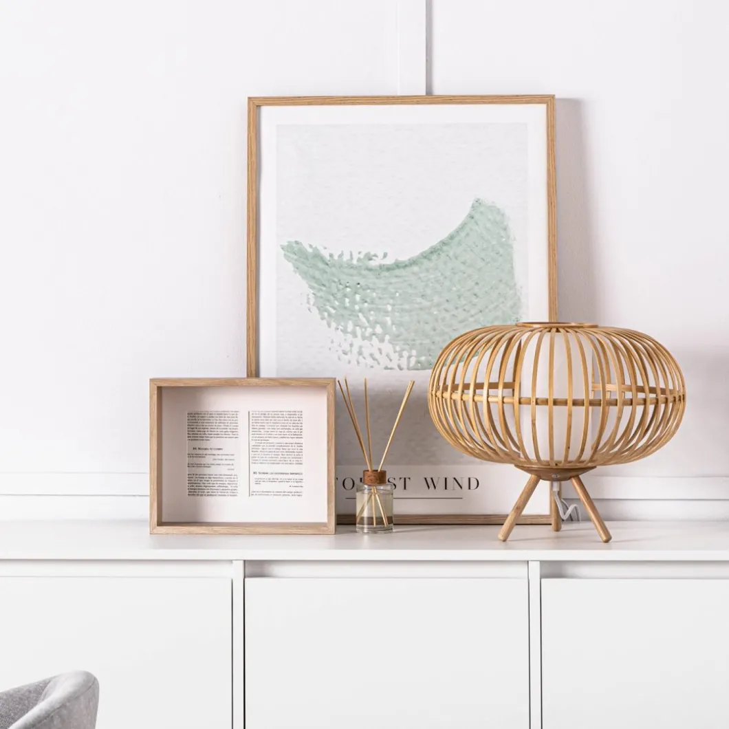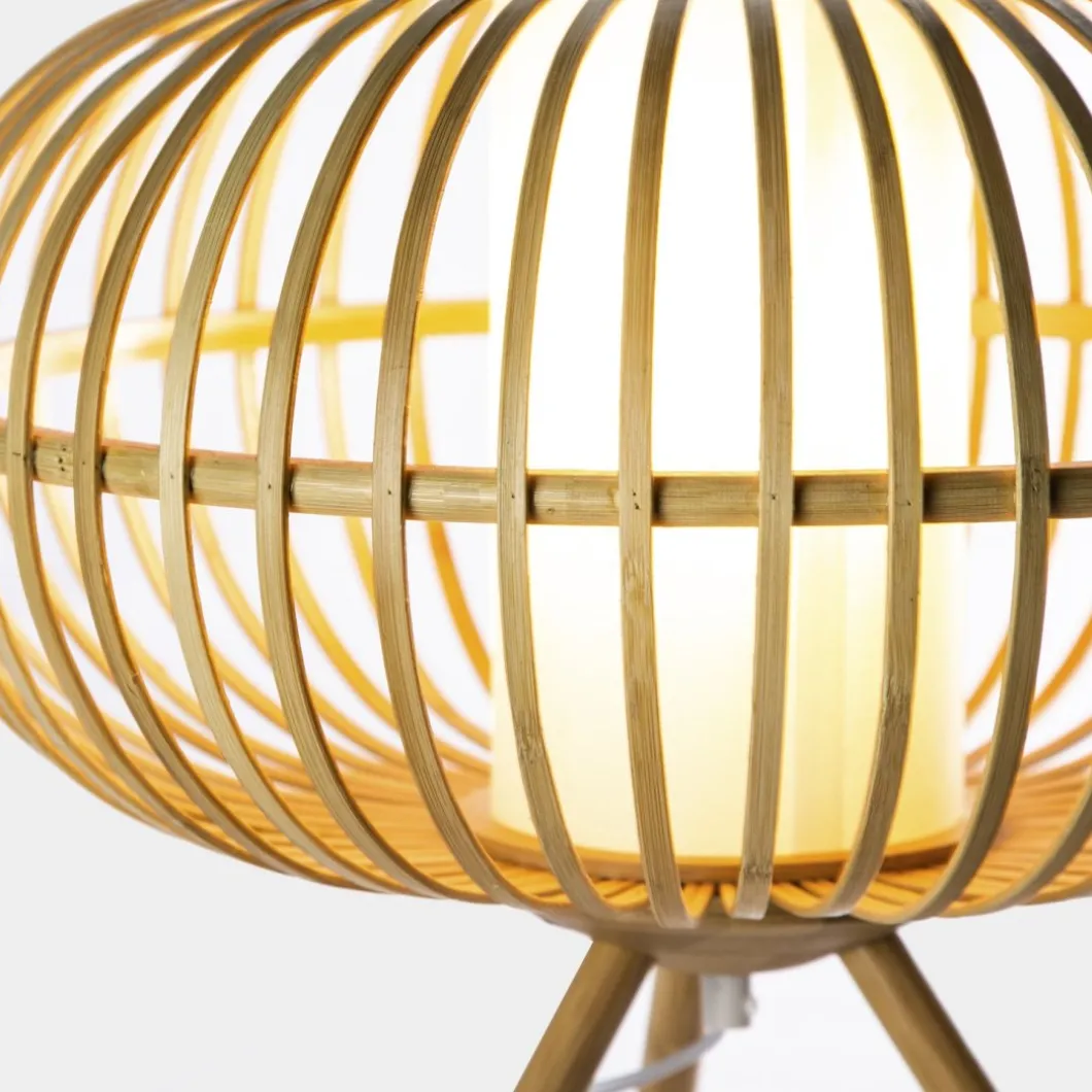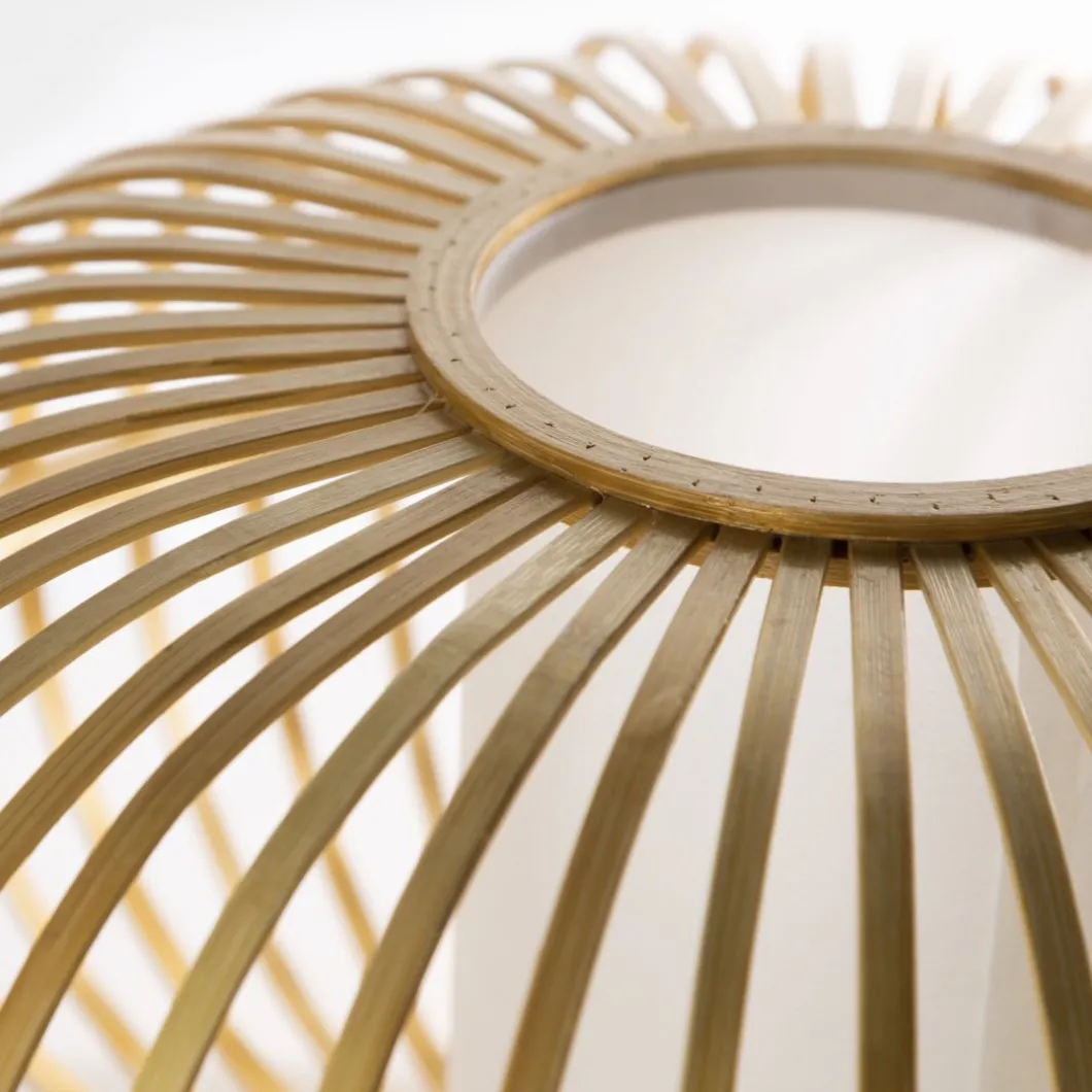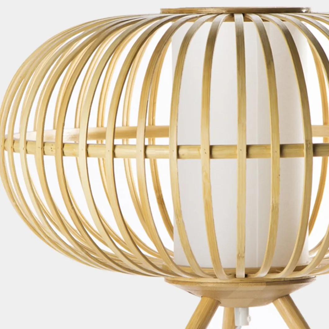 La lámpara de mesa Bur fabricada en bambú nos aporta la calidez que nos ofrecen las fibras naturales. Sus originales patas de madera denotan personalidad y estilo único. Es ligera y permite que la luz atraviese los huecos de la fibra por lo que genera una luz muy acogedora.No incluye bombilla.