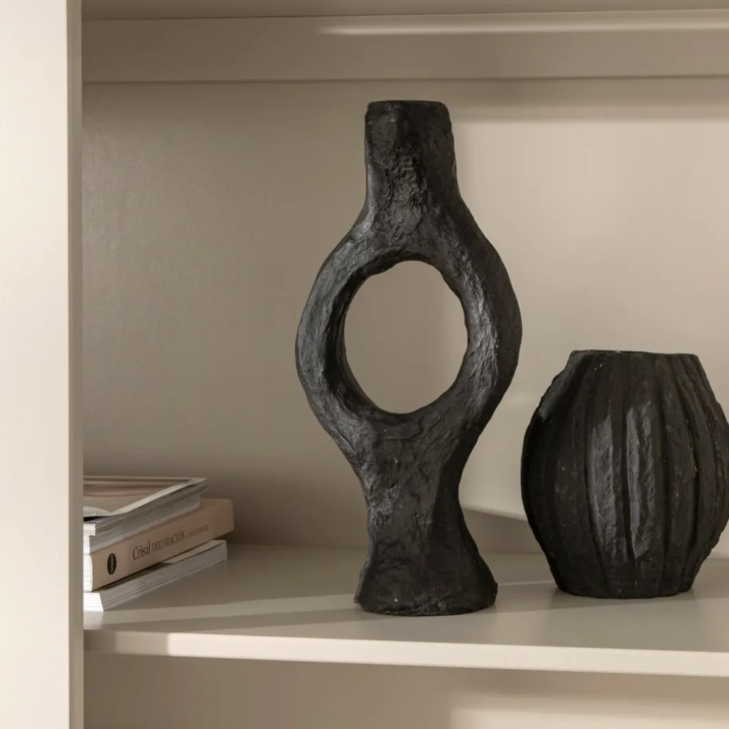 El jarrón de papel maché color negro Cauro es una pieza decorativa hecha artesanalmente con la técnica del papel maché. Tiene un acabado negro mate, elegante y sofisticado, y una estructura ligera pero resistente. Su diseño moderno lo convierte en un complemento perfecto para cualquier espacio, ya sea como jarrón para flores secas o como objeto ornamental.