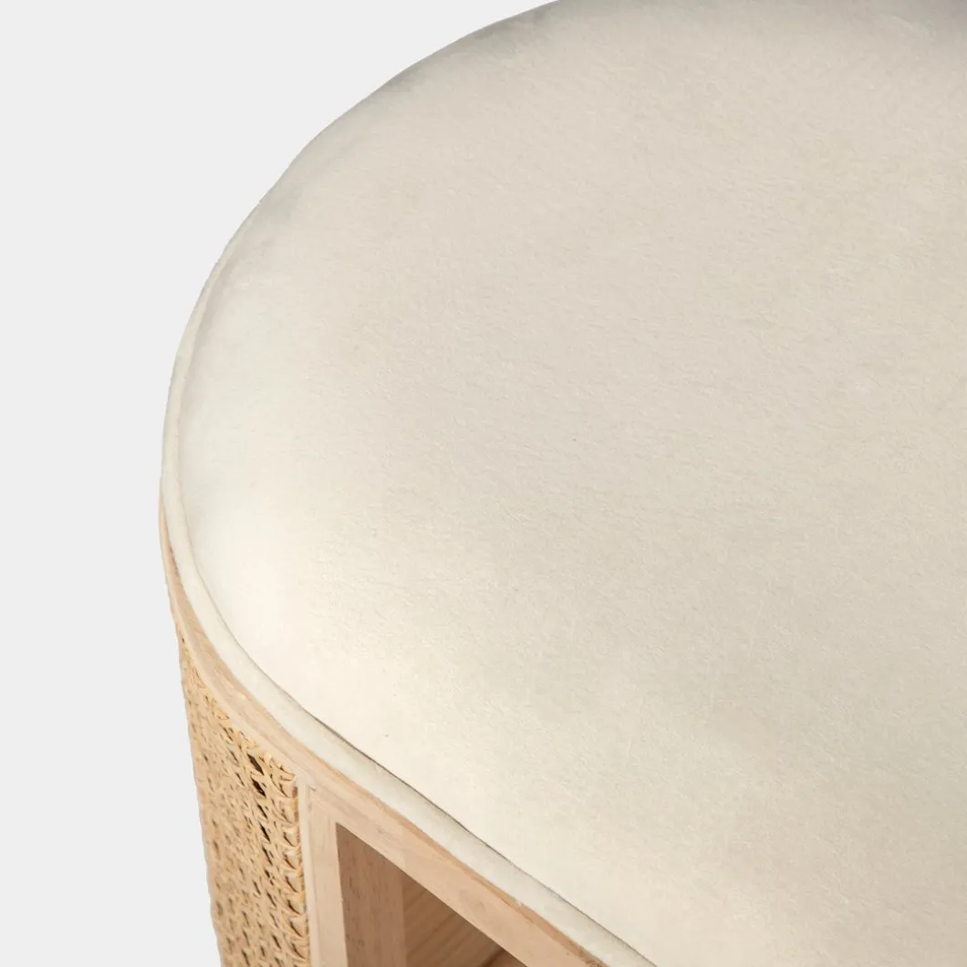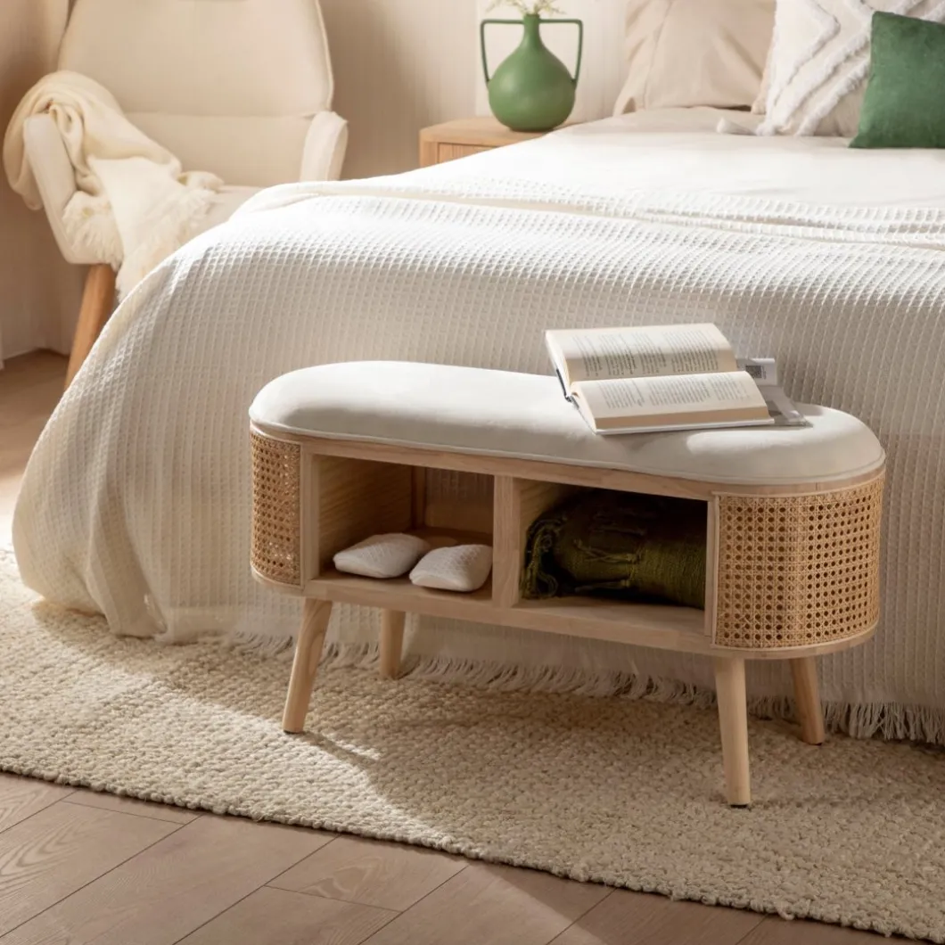 Embellece tu hogar con el banco Chela, tapizado en terciopelo beige y con detalles en ratán natural. Esta combinación aporta calidez a cualquier ambiente. Versátil y elegante, es ideal como pie de cama o asiento adicional en tu sala de estar. Además, cuenta con dos huecos centrales para almacenar zapatos, teniéndolos siempre a mano.