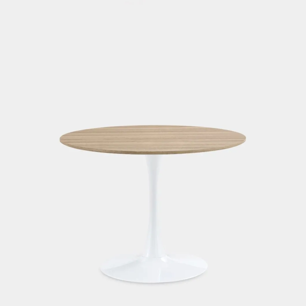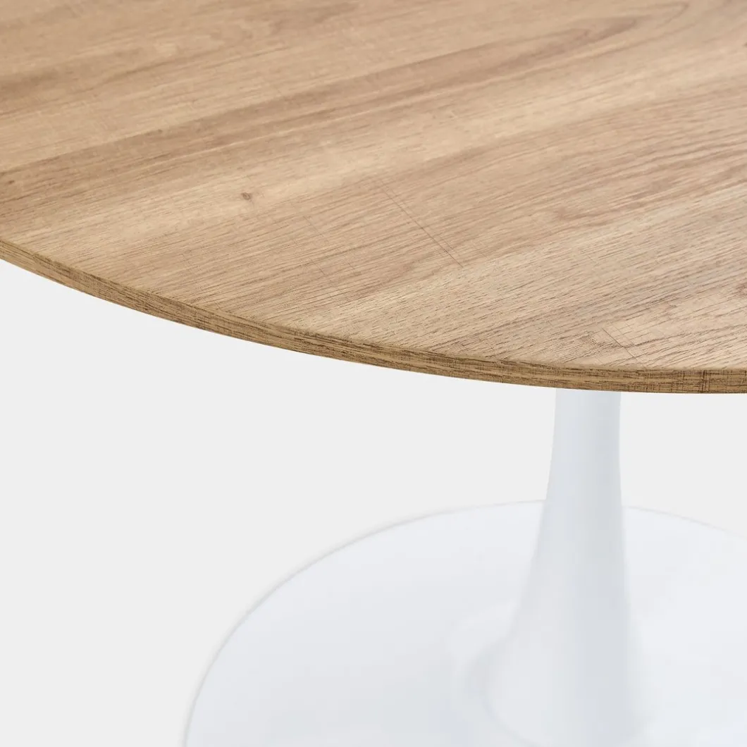 La mesa de comedor redonda Cory mezcla el encanto vintage con un diseño moderno y sofisticado. Su sobre en madera color natural y sus curvas retro añaden luz y amplitud a cualquier entorno. La pata central en forma de tulipa facilita la disposición de cuatro sillas, lo que la convierte en una opción ideal para el comedor, la cocina, bar o restaurante. Su tamaño compacto ofrece gran versatilidad.