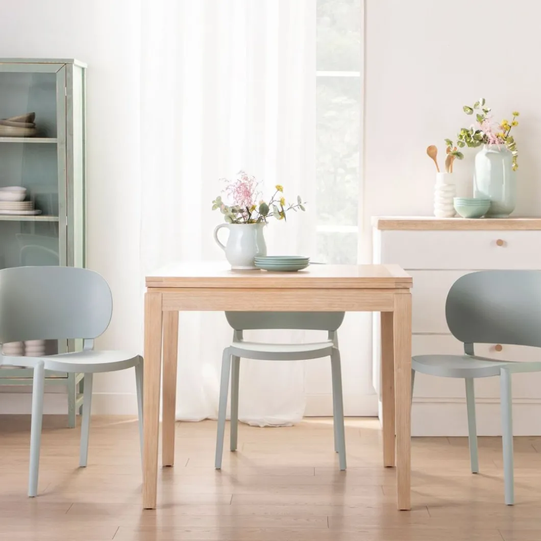 La mesa de comedor cuadrada extensible Dina en madera color blanco es perfecta para salones, comedores y cocinas de espacio reducido. Su sistema de apertura en forma de libro permite duplicar la longitud de la mesa, pasando de 90 a 180 cm. En cuestión se convierte en una mesa de hasta 8 comensales. También está disponible en blanco.