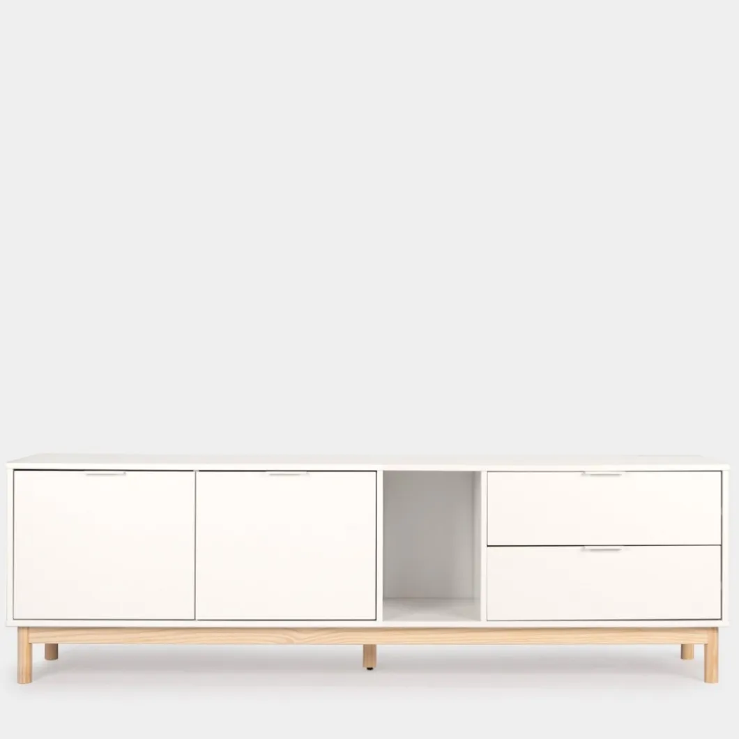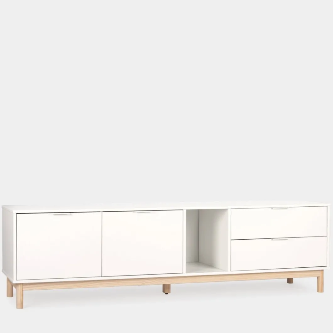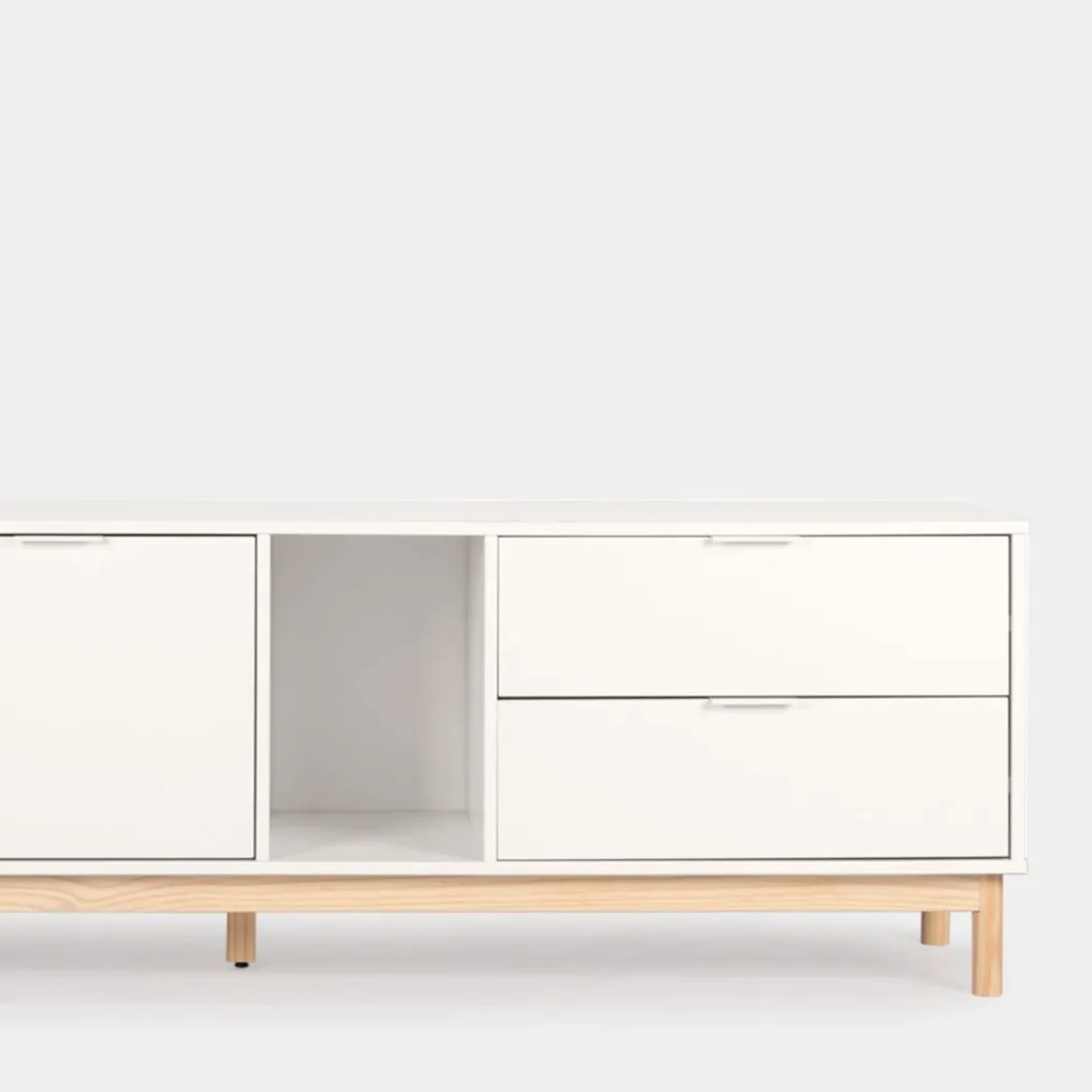 El mueble de TV lacado en color blanco Elian es perfecto para añadir un toque nórdico y acogedor a tu hogar. Sus dos puertas, hueco y cajones te ofrecen la posibilidad de almacenar tus objetos de manera ordenada y accesible, manteniendo tu salón limpio y organizado. Combínalo con otros muebles de la colección para conseguir un look completo y armonioso.