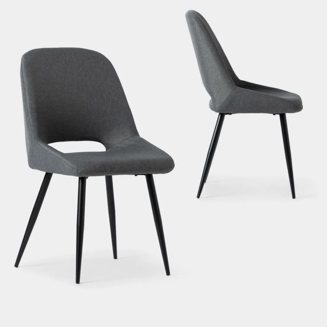 ¡Aprovéchate de este pack! La silla de comedor Emily en tapizado gris oscuro con asiento de respaldo alto y forma ergonómica es uno de nuestros diseños con más personalidad. Cualquiera de sus 3 tonalidades de sus acabados, junto a sus patas metálicas negras, aportará un aire sofisticado y elegante a tu comedor.