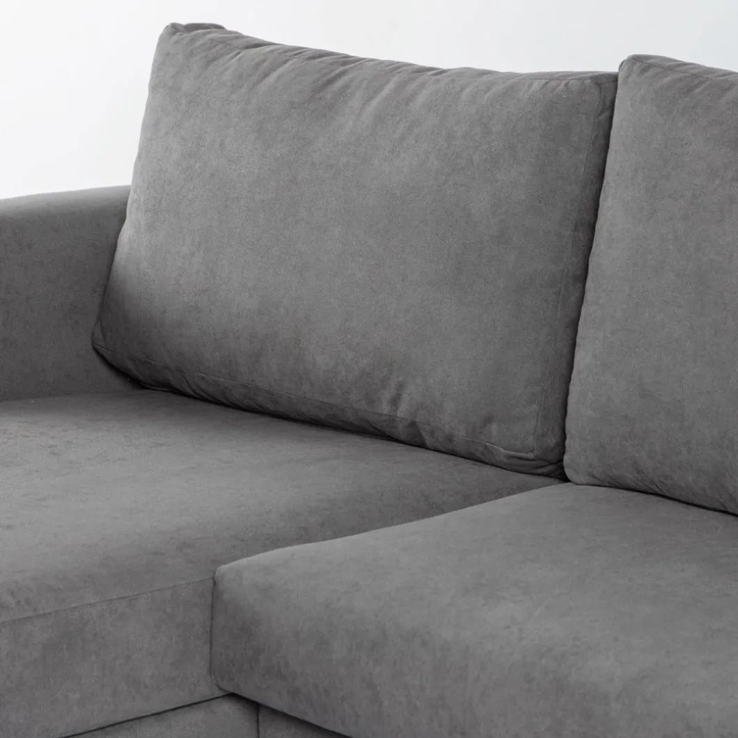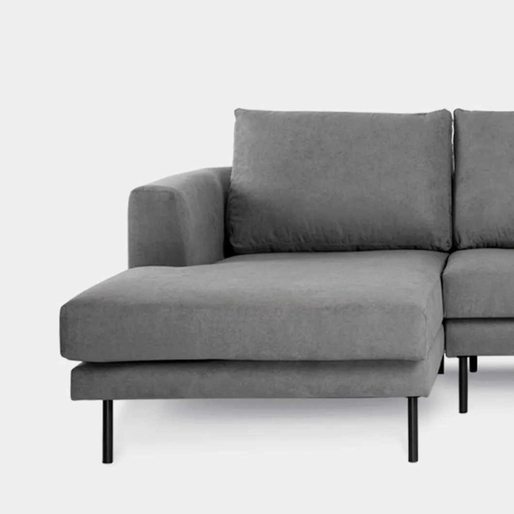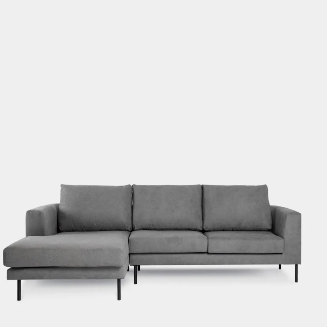 El sofá chaise longue tres plazas gris Emma es ideal para completar tu salón. Es cómodo, práctico y muy de tendencia. También lo puedes encontrar disponible en color beige. La chaise longue, al mirar de frente el sofá, queda ubicada a la izquierda.