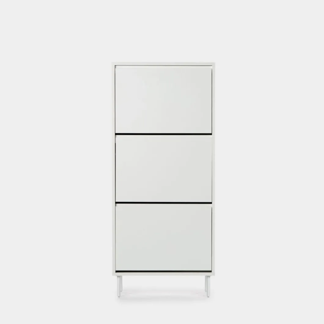 Aporta luminosidad y serenidad a tu hogar con el zapatero estrecho en madera color azul Esben. Sus tres puertas permiten almacenar hasta 11 pares de zapatos. Cada contenedor tiene un separador regulable y extraíble que permite almacenar calzado de mayor volumen. La talla máxima de zapatos que admite es el número 43. Su tamaño compacto lo hace ideal para zonas de pasillo, recibidores o dormitorios. Para mayor estabilidad del mueble, aconsejamos su anclaje a la pared. Visita el resto de la colección y completa el look.