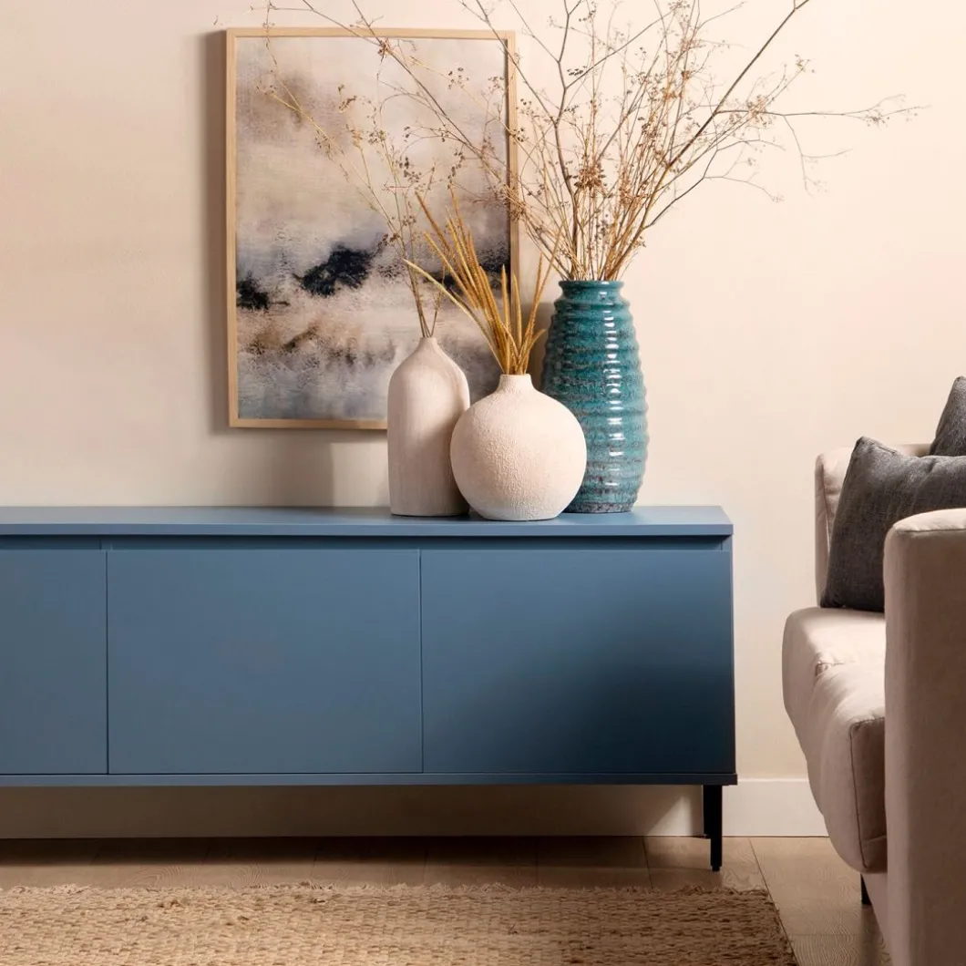 Aporta personalidad y color a tu hogar con el mueble TV 160 en madera color azul Esben. Cuenta con tres puertas con tirador uñero integrado que permiten optimizar al máximo el espacio y mantener tus accesorios multimedia bien organizados. Combínalo con otras piezas de la colección y consigue el look completo.