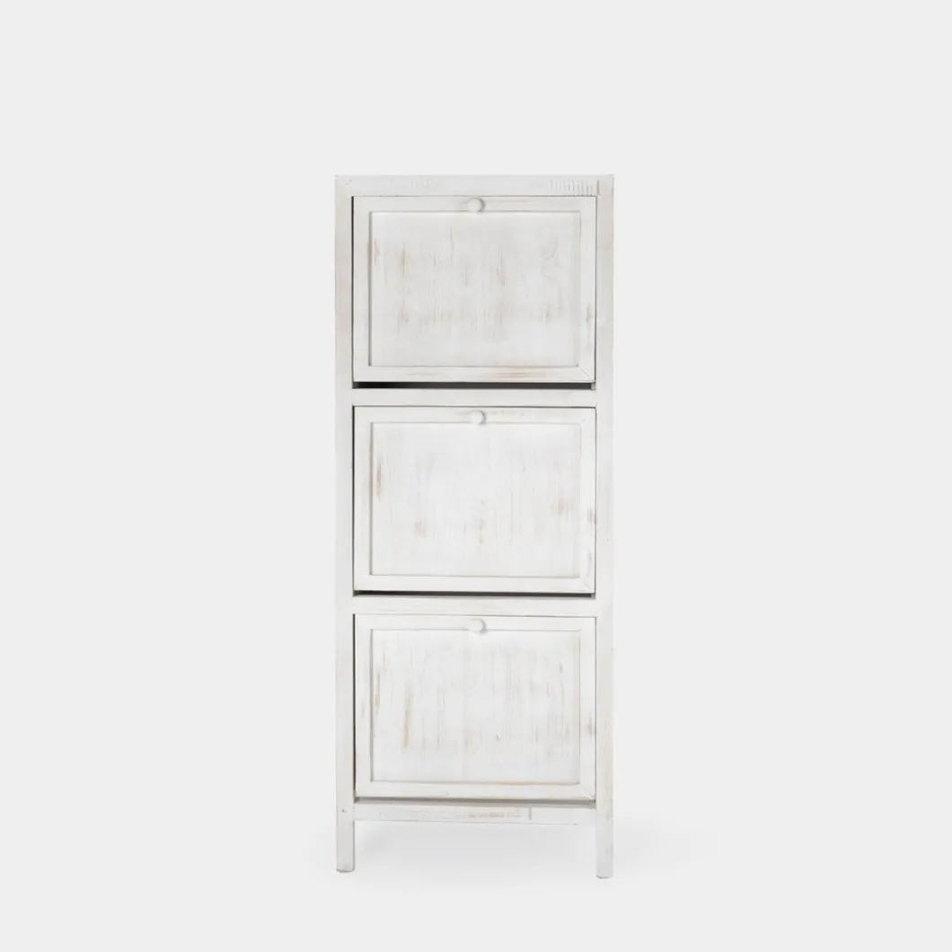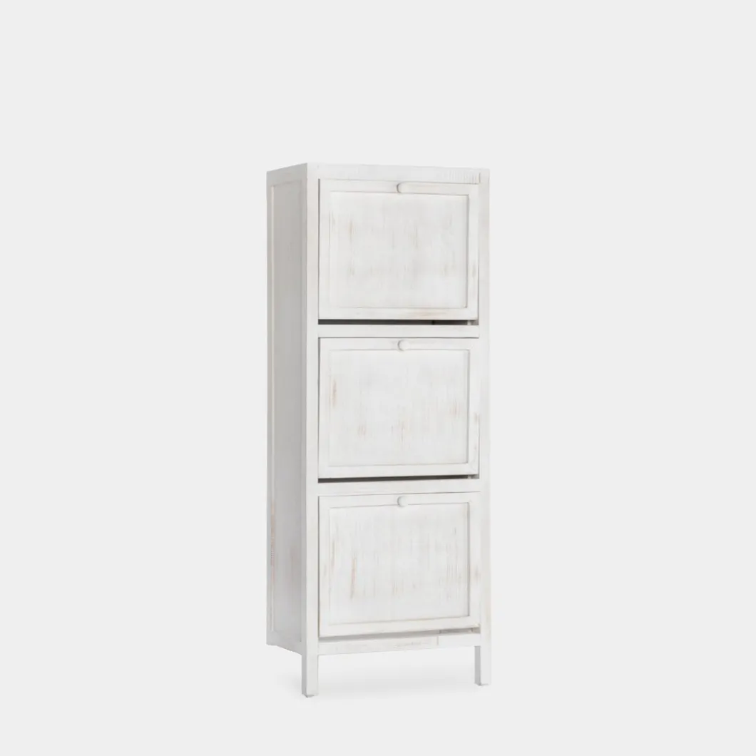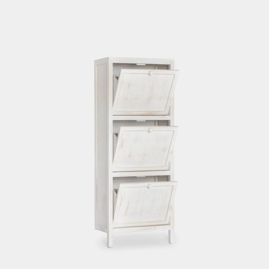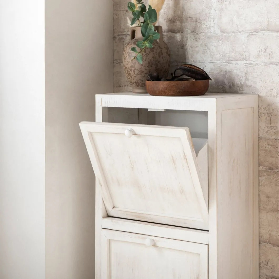 El zapatero Folk, fabricado en madera reciclada libre de tratamientos químicos, fusiona la belleza del estilo natural con la sostenibilidad del upcycling. Cada pieza, elaborada artesanalmente, cuenta una historia única a través de sus imperfecciones y aporta carácter a cualquier estancia. Su tamaño compacto lo hace ideal para zonas de pasillo, recibidores o dormitorios. Dispone de 3 puertas y tiene una capacidad para 6 pares de zapatos. La talla máxima de zapatos que admite es el número 43. No es apto para botas. Requiere anclaje a pared.