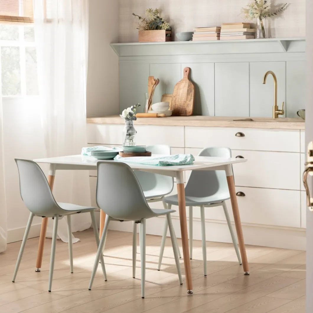 La mesa de comedor rectangular Gless es de estilo nórdico y minimalista. Se convierte en la elección segura si eres un apasionado del diseño escandinavo y tienes un espacio reducido.De líneas rectas, con sobre blanco y patas en acabado natural, esta mesa se convierte en la protagonista de tu salón comedor. Es apta para 4 comensales por lo que podrás vivirla y compartila con familiares y amigos en estancias como la cocina, el comedor o incluso convertila en una mesa de despacho.