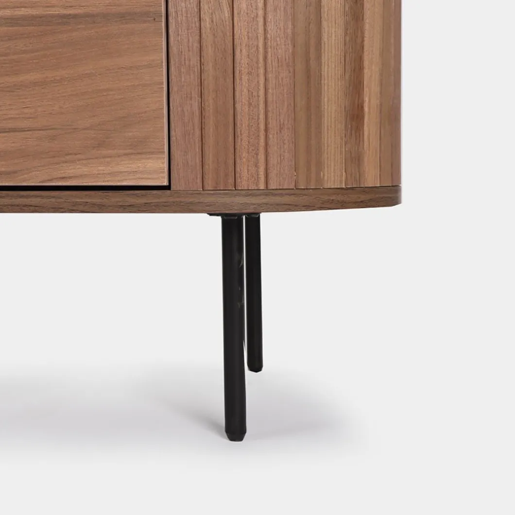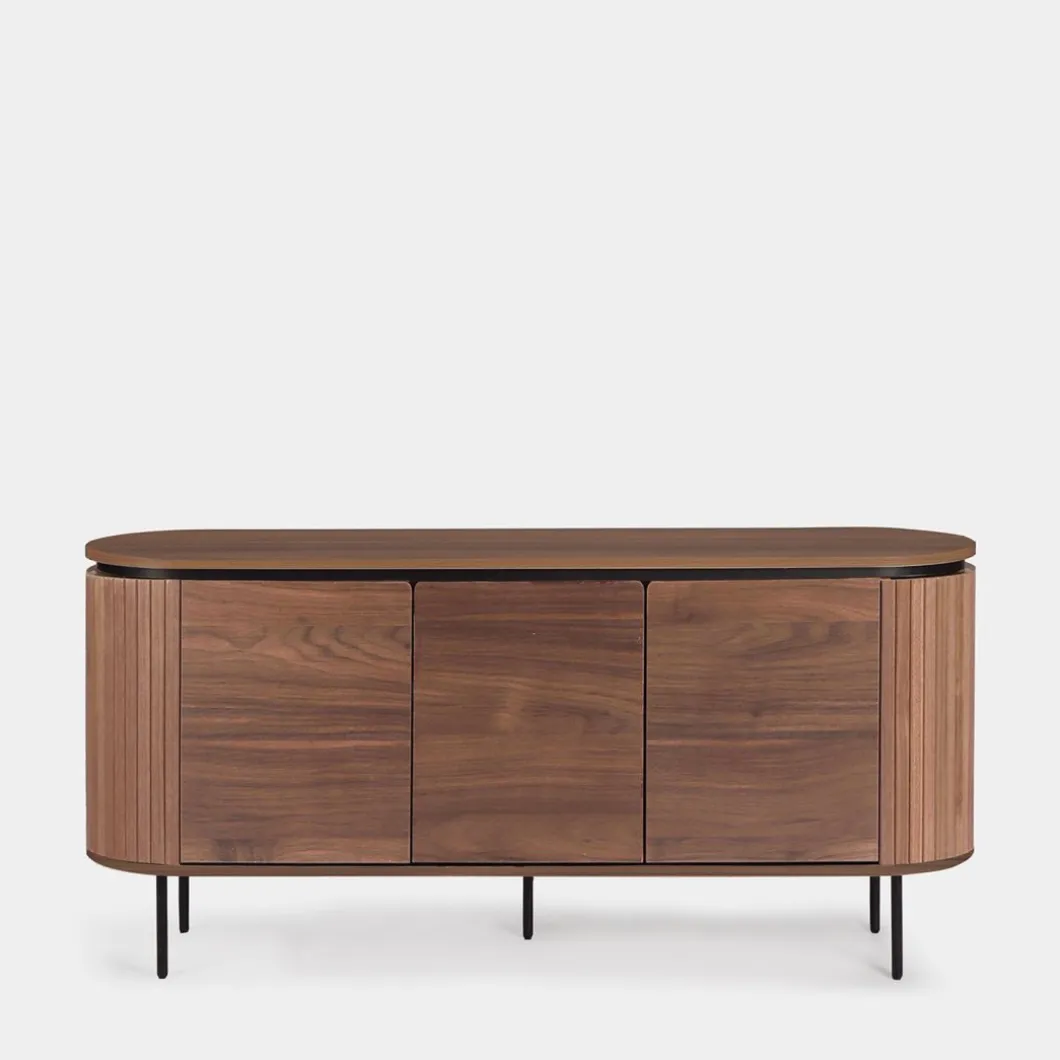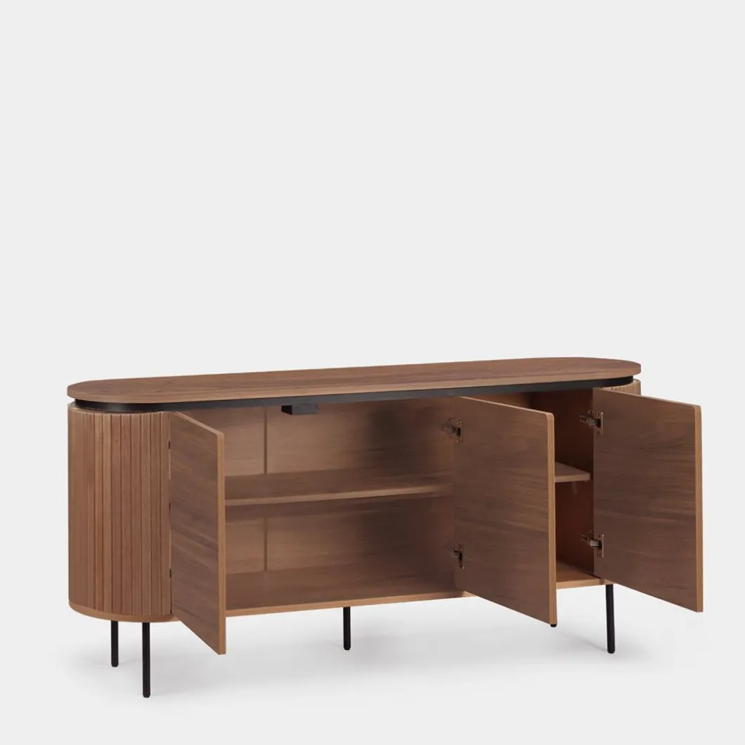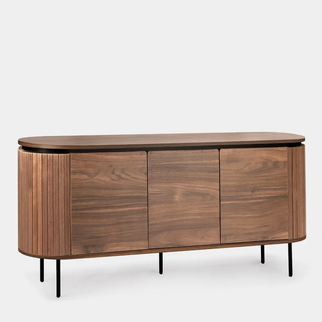 El aparador Helios en madera color nogal fusiona elegancia y funcionalidad con su diseño de líneas suaves y forma redondeada. Sus tres puertas ocultan un amplio espacio de almacenamiento interno, perfecto para mantener todo en orden y al alcance de la mano. Ideal para cualquier habitación, este aparador se integra a la perfección con el resto de la colección para lograr un look armonioso y estilizado.