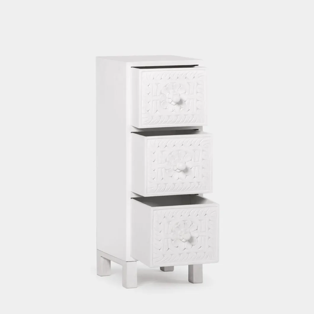 Con la mesita de noche estrecha de 3 cajones en blanco vintage Iraya conseguirás darle personalidad y carácter a tu dormitorio. Sus tres cajones que te ayudarán a organizar y mantener en orden tu hogar. Ha sido tallada a mano, por lo que puede presentar ligeras variaciones que la convierten en una pieza única.