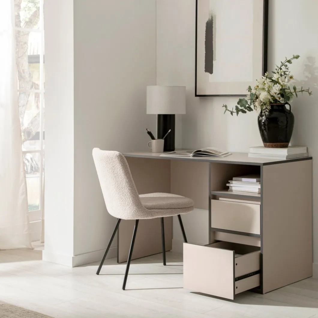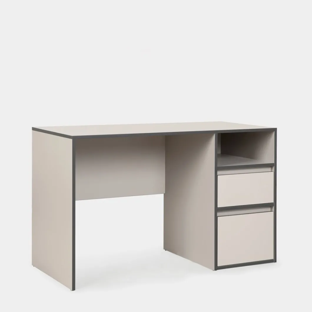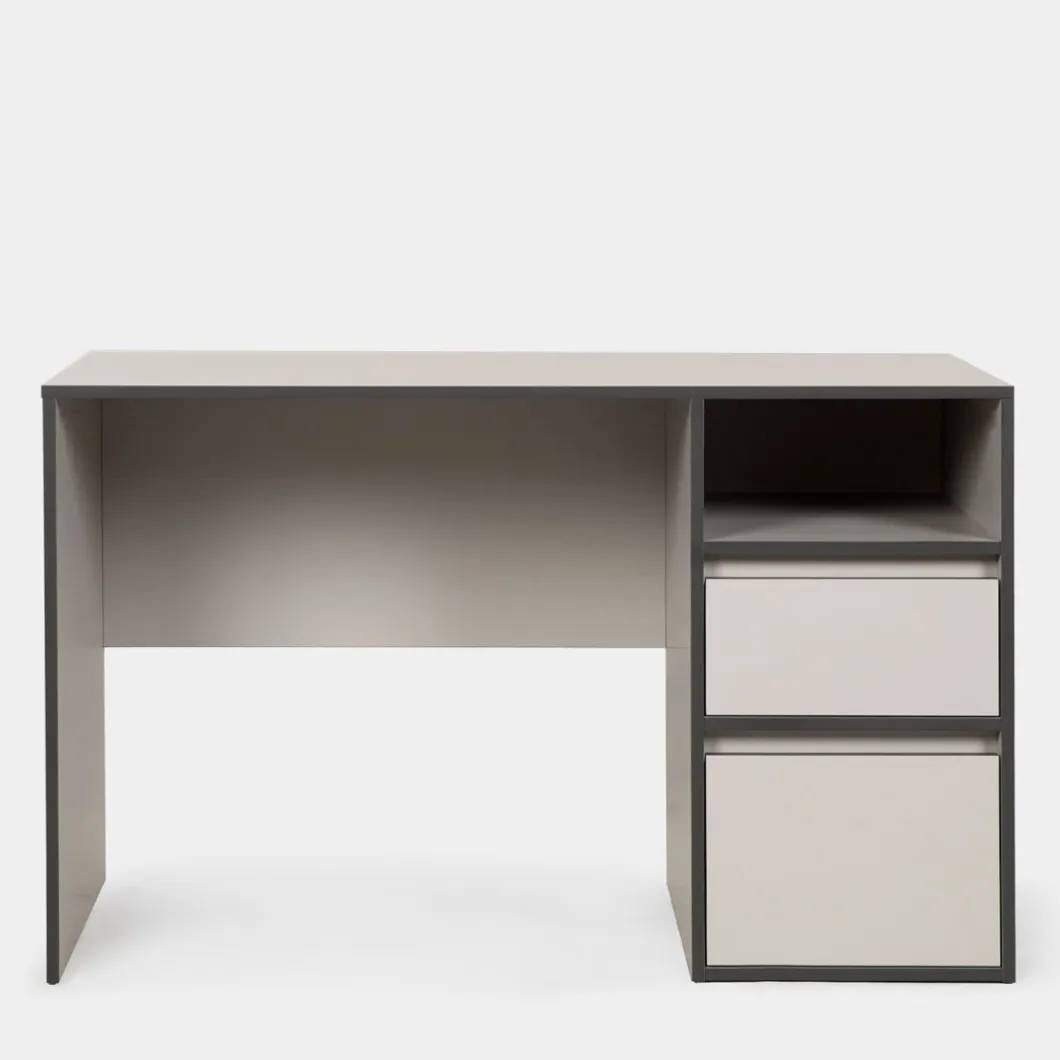 Aprovecha al máximo cada día de trabajo con el escritorio Kamila. Equipado con un hueco superior y dos cajones espaciosos, proporciona la organización ideal para accesorios y documentos. Su acabado en gris perla aporta luminosidad, mientras que sus cantos en gris oscuro añaden un contraste sofisticado. Perfecto para oficinas en casa y estudios, Kamila combina funcionalidad con un estilo moderno.