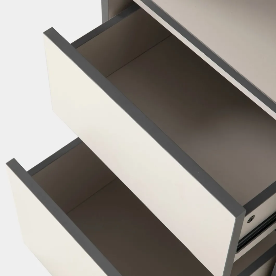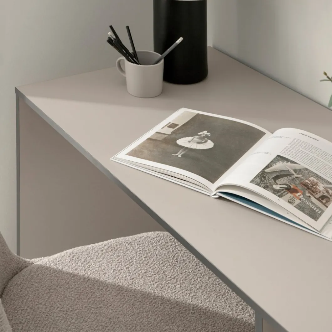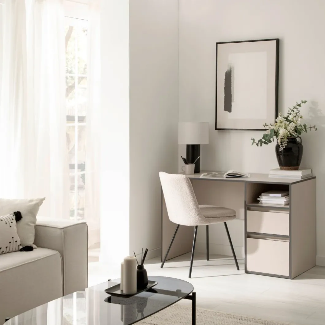 Aprovecha al máximo cada día de trabajo con el escritorio Kamila. Equipado con un hueco superior y dos cajones espaciosos, proporciona la organización ideal para accesorios y documentos. Su acabado en gris perla aporta luminosidad, mientras que sus cantos en gris oscuro añaden un contraste sofisticado. Perfecto para oficinas en casa y estudios, Kamila combina funcionalidad con un estilo moderno.
