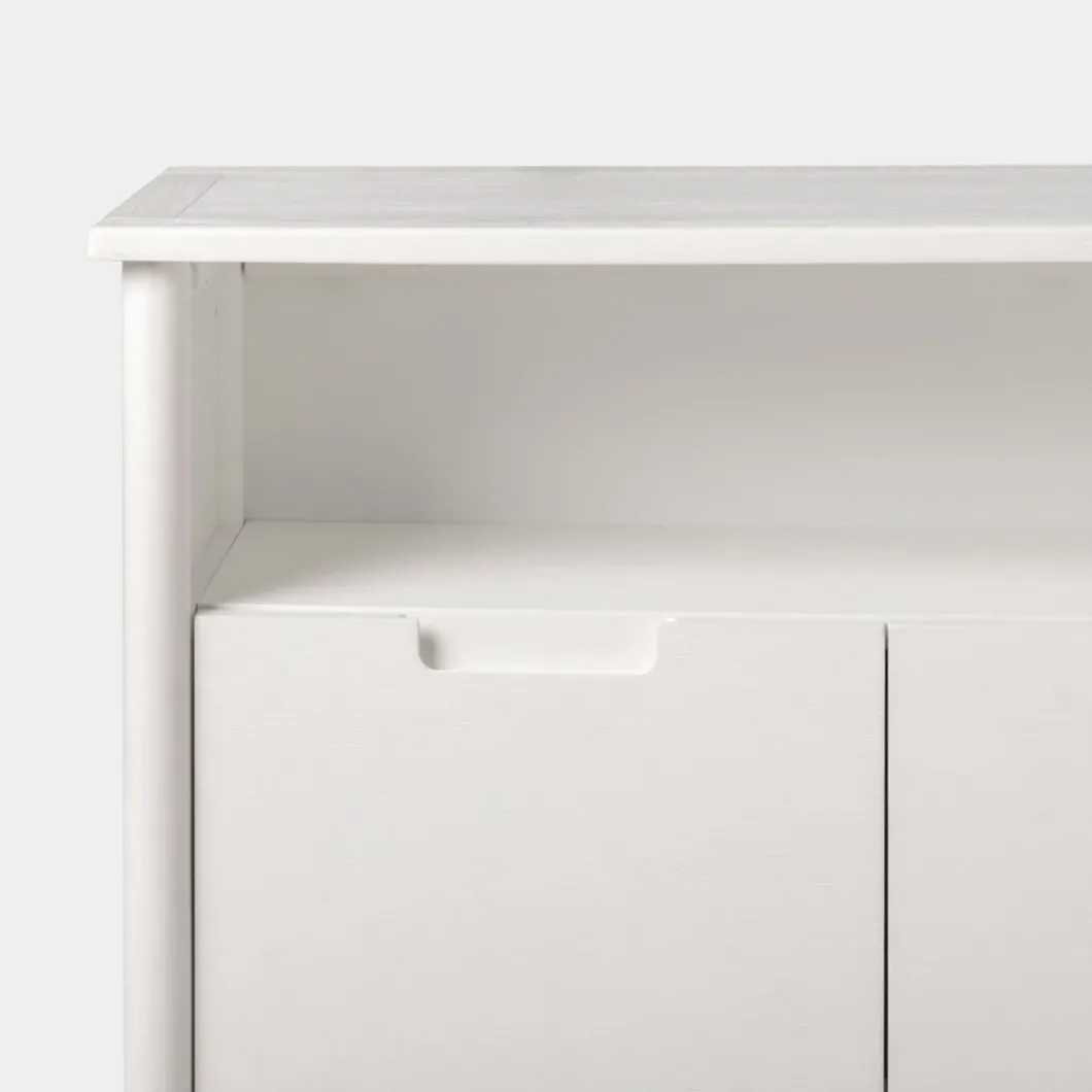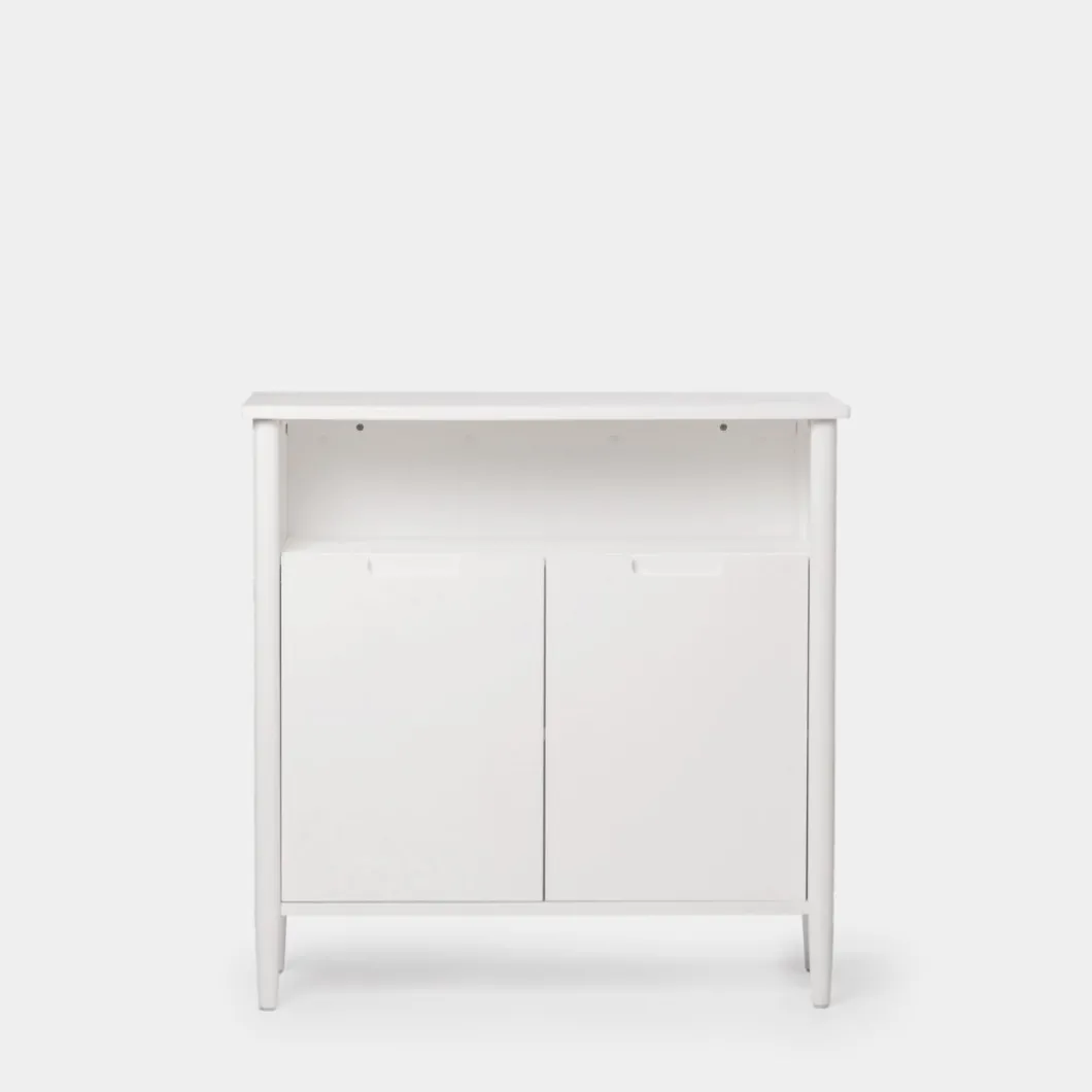 El mueble recibidor blanco en chapa de pino y madera de abedul Kenan ofrece una solución ideal para obtener almacenaje adicional en el salón, comedor u oficina. Su estante visible es perfecto para exhibir libros o elementos decorativos mientras que sus dos puertas permiten almacenar aquello que no quieres tener a la vista. Para mayor estabilidad del mueble, aconsejamos su anclaje a pared.
