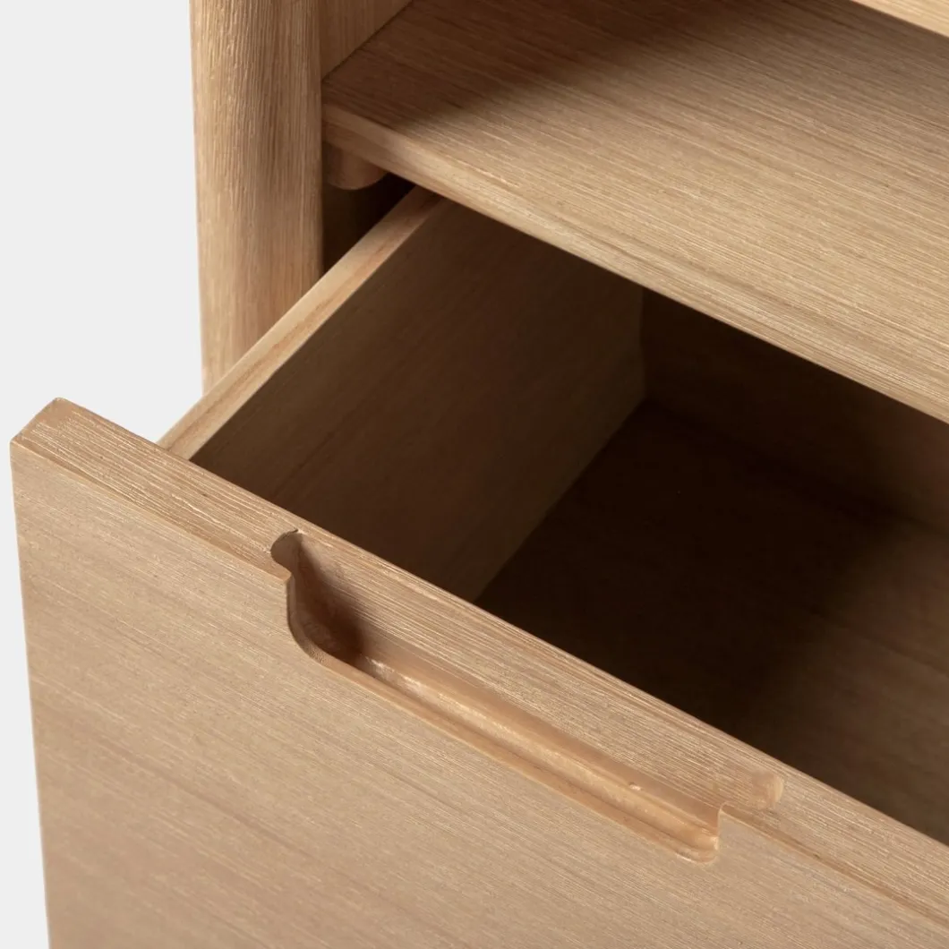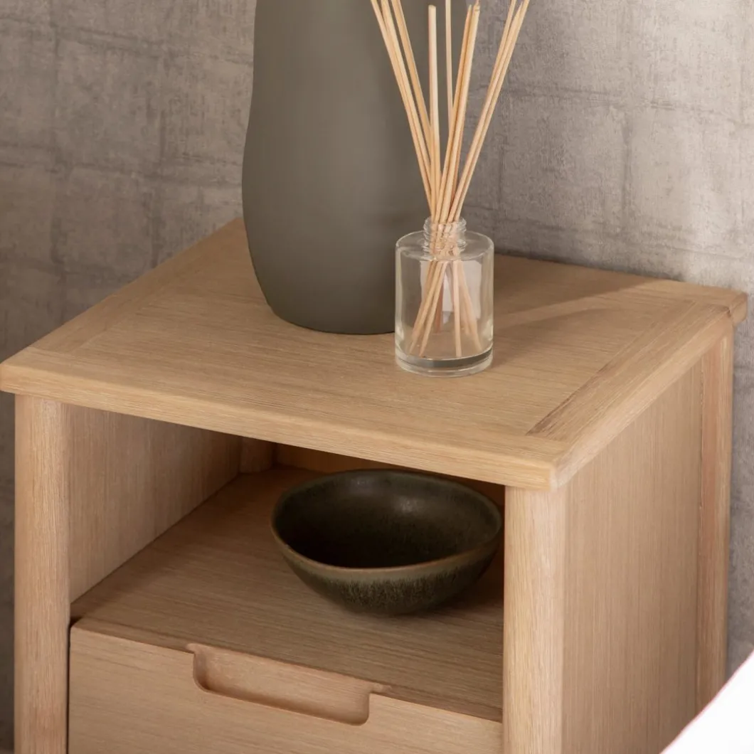 La mesita de noche en chapa de pino y madera de abedul Kenan es una pieza atemporal y funcional perfecta para el dormitorio. Cuenta con un amplio cajón y un hueco en el que podrás guardar tus objetos personales y mantenerlos al alcance de tu mano durante la noche. Su diseño sencillo y atemporal encaja en cualquier estilo decorativo. Disponible en varios acabados, escoge el que más te guste.