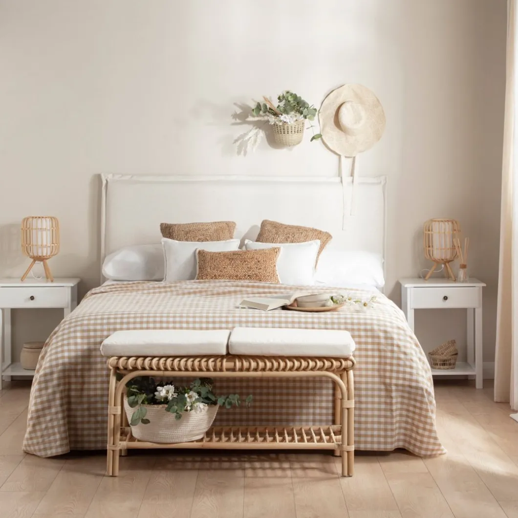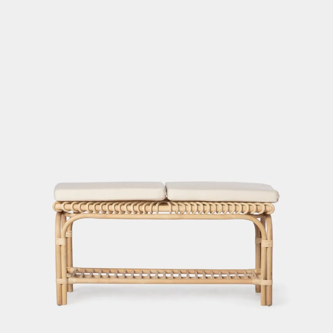 El banco en ratán natural Kina aporta frescura y calidez a cualquier estancia. Se puede usar como pie de cama o como banqueta en la zona de la entrada. Incluye dos cojines desenfundables que aportan un extra de comodidad. Está fabricado a mano con ratán natural, por lo que puede presentar irregularidades propias de su elaboración y ligeras variaciones en la tonalidad respecto al color que se muestra en la imagen.