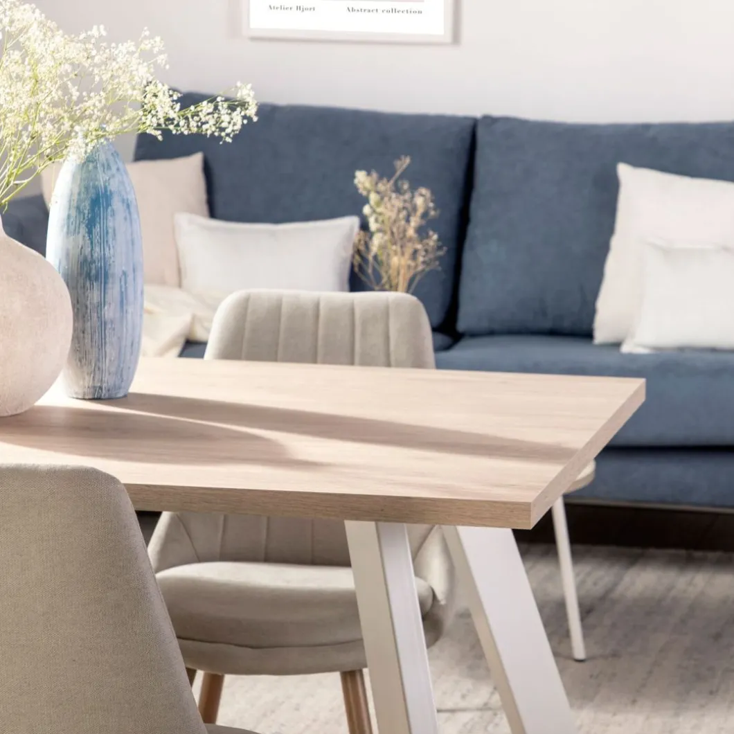 La mesa de comedor rectangular Laina en acabado natural y patas metálicas blancas encaja que en cualquier estilo decorativo. Es apta para 6 comensales, lo que la hace ideal para recibir amigos o familiares en casa. También es la elección perfecta para la hostelería.