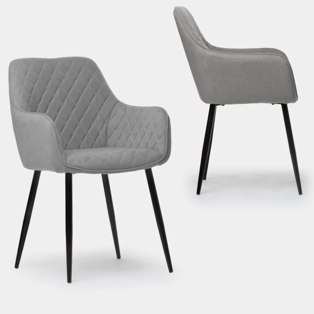 ¡Aprovéchate de este pack! Las silla de comedor tapizada Lizel con pata metálica negra es una apuesta por el confort gracias a su forma ergonómica con reposabrazos integrado. Su acabado en poliéster con dibujo en rombos está disponible en 2 colores, elige entre uno de ellos para darle un toque de modernidad y sofisticación a tu salón.