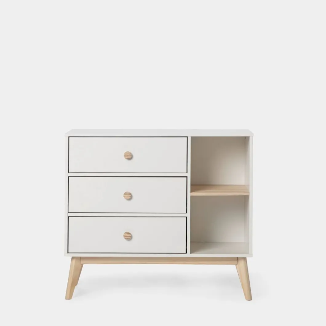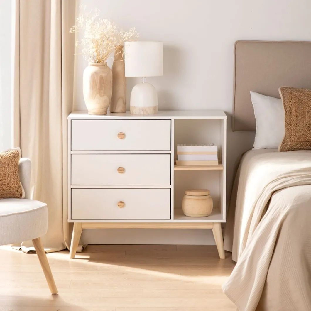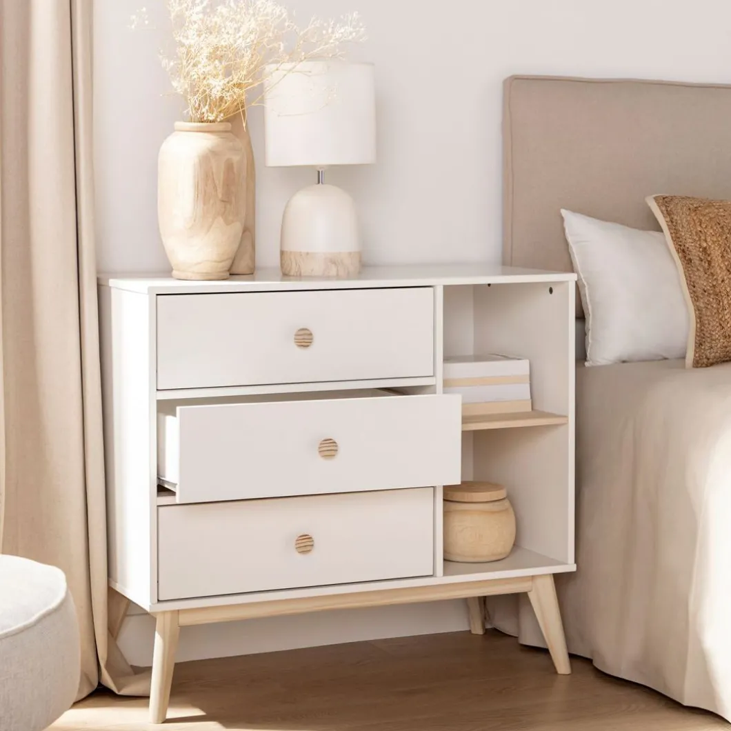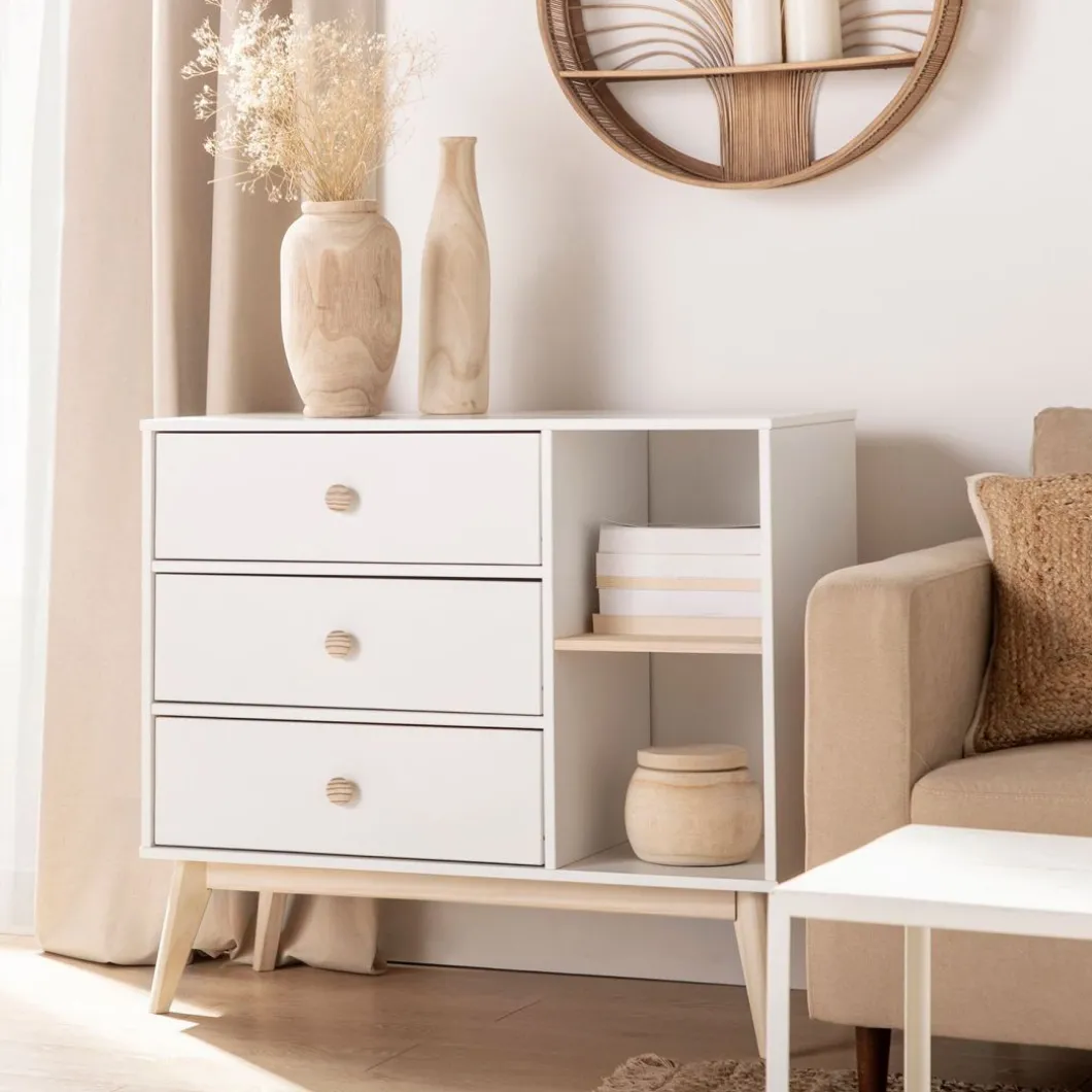 La cómoda lacada en blanco Luke es una buena solución para los problemas de almacenaje en el hogar. Cuenta con tres cajones de amplia capacidad y dos estantes en los que guardar objetos que queremos tener a la vista. Además, cuenta con dos opciones de tiradores: uno en madera de pino y otro en blanco. ¡Escoge el que más te guste!