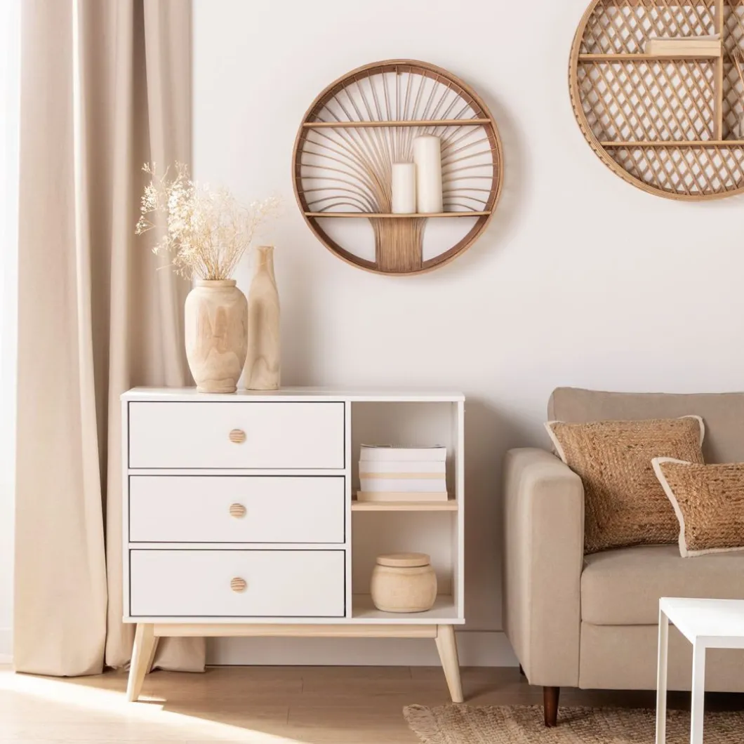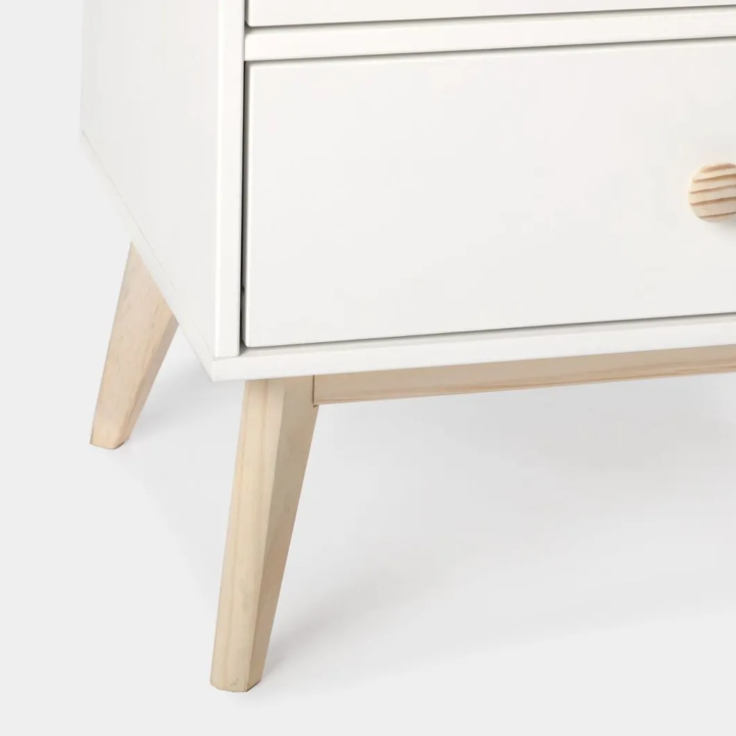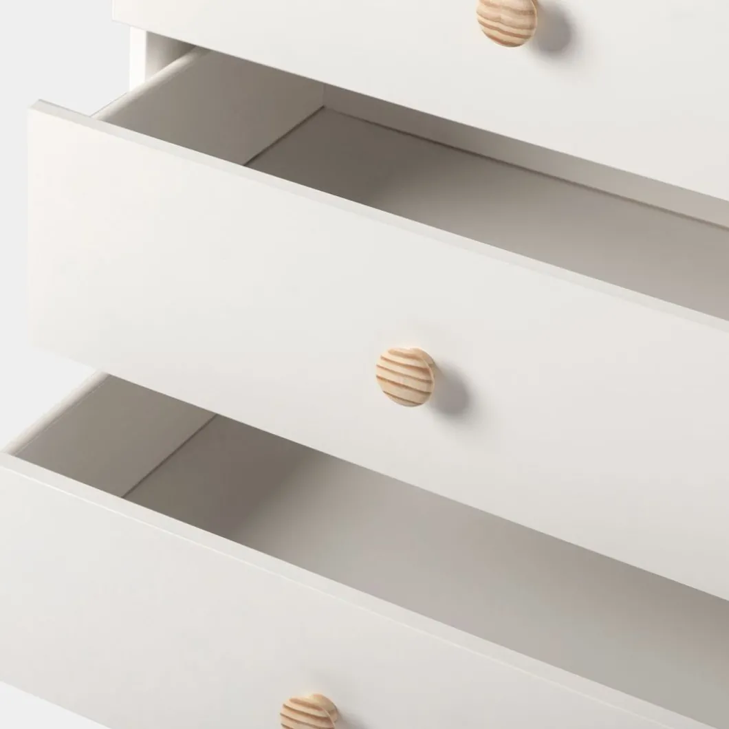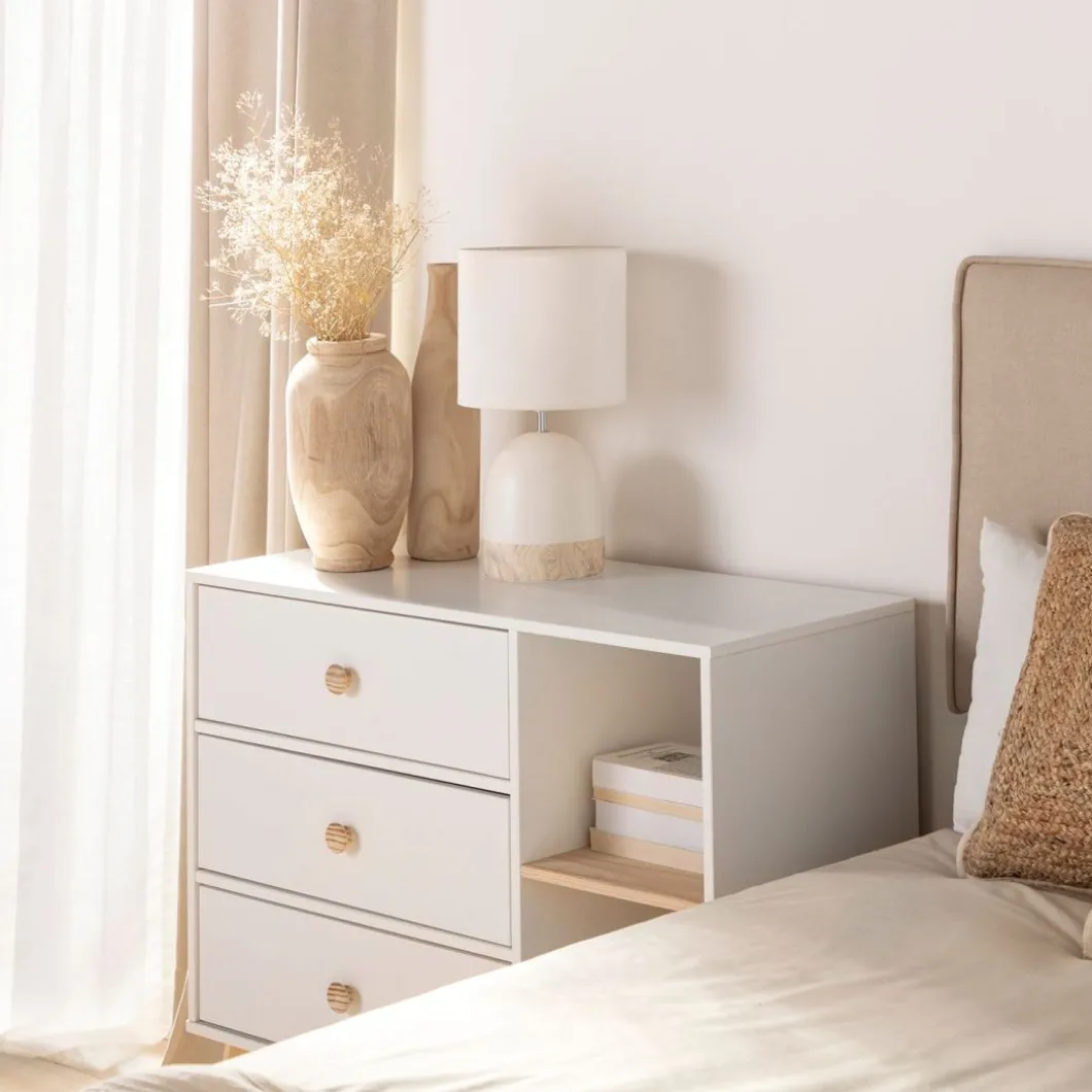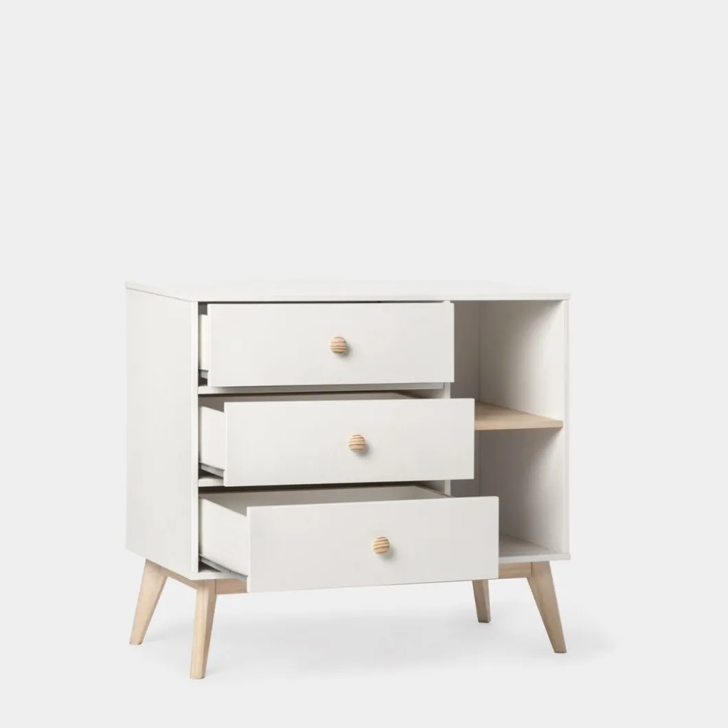 La cómoda lacada en blanco Luke es una buena solución para los problemas de almacenaje en el hogar. Cuenta con tres cajones de amplia capacidad y dos estantes en los que guardar objetos que queremos tener a la vista. Además, cuenta con dos opciones de tiradores: uno en madera de pino y otro en blanco. ¡Escoge el que más te guste!