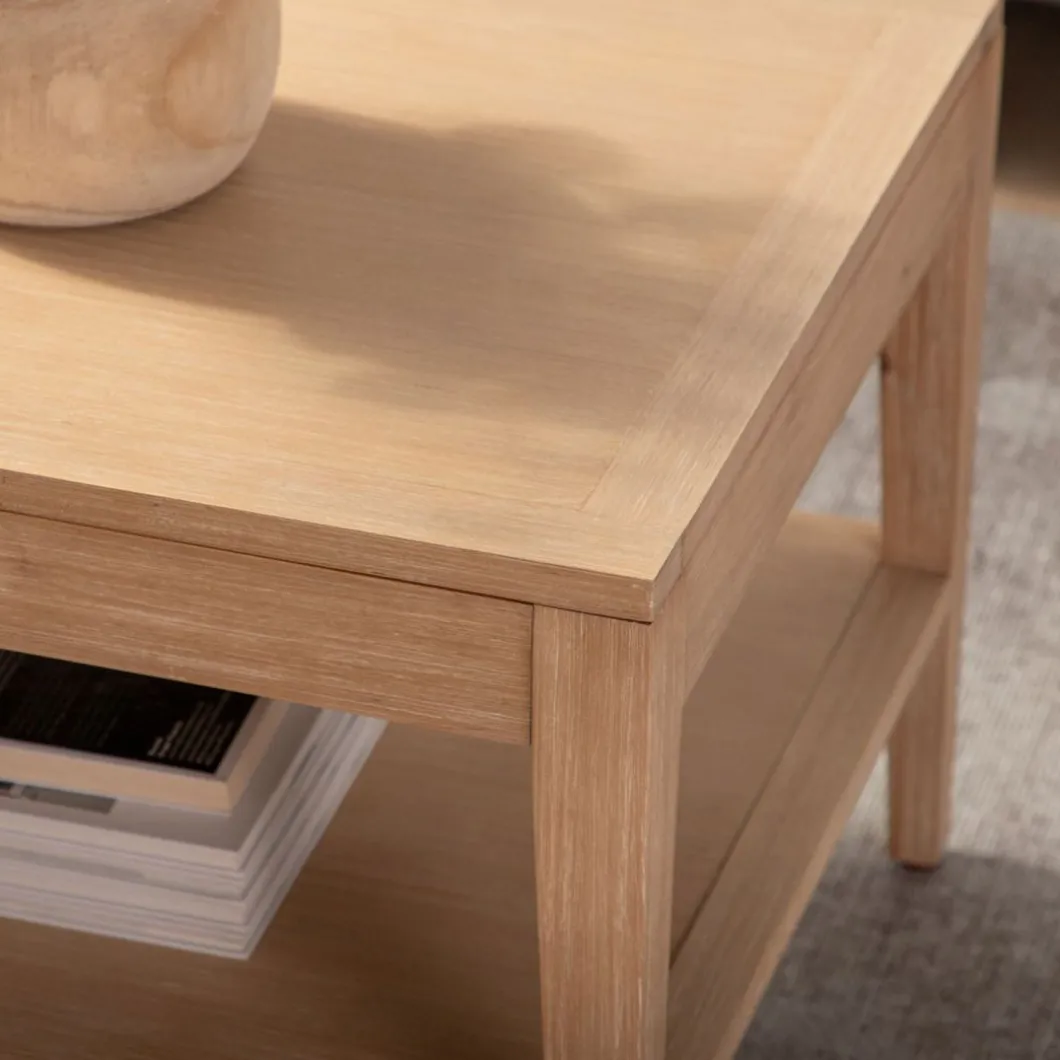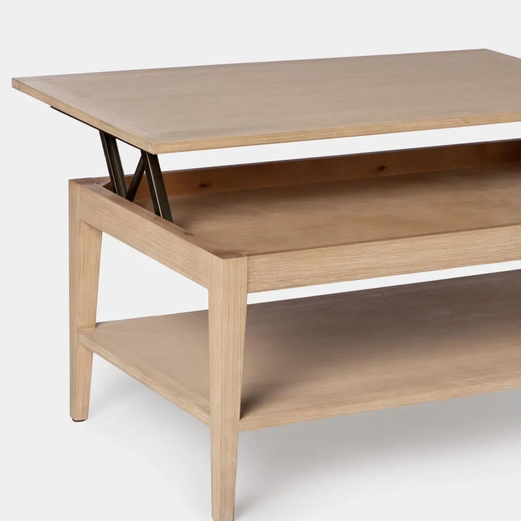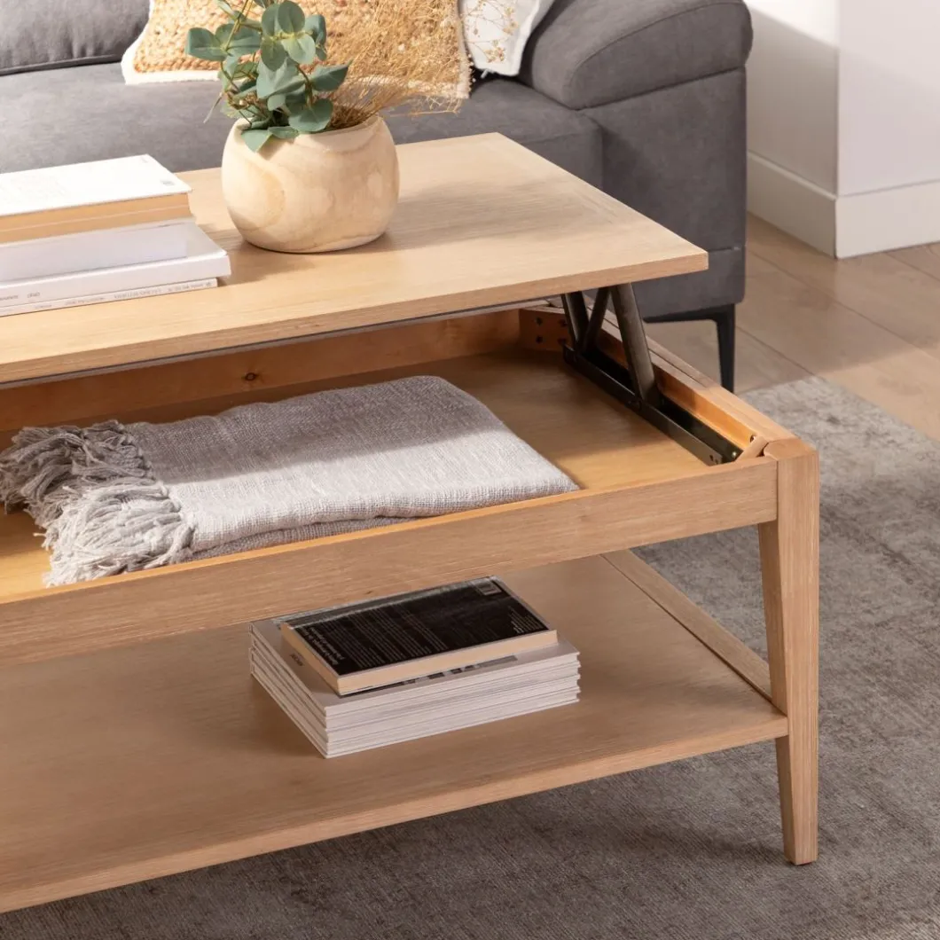 La mesa de centro elevable Mara en madera natural es una pieza esencial para completar cualquier salón/comedor. Es una mesa práctica y funcional que cuenta con un estante y un amplio cajón. Además, su sobre es elevable, lo que te permite comer o cenar comodamente desde el sofá. Está disponible en varios acabados.