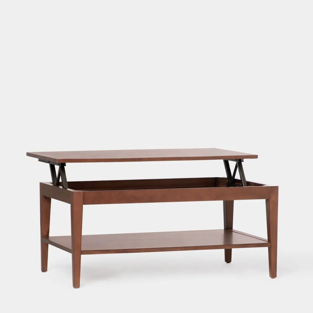 La mesa de centro elevable Mara en madera color castaño es una pieza esencial para completar cualquier salón/comedor. Es una mesa práctica y funcional que cuenta con un estante y un amplio cajón. Además, su sobre es elevable, lo que te permite comer o cenar comodamente desde el sofá. Está disponible en varios acabados.