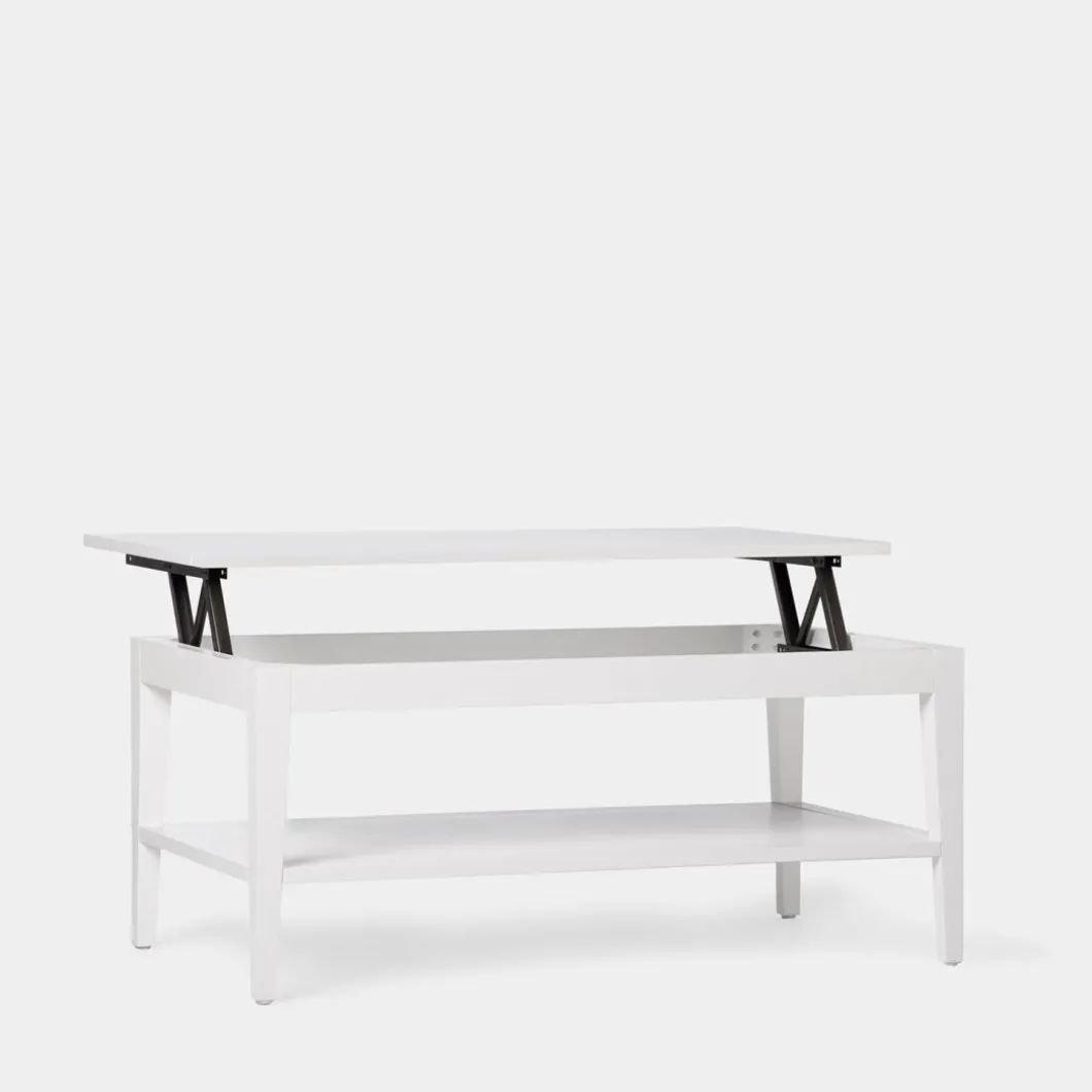 La mesa de centro elevable Mara en madera color blanco es una pieza esencial para completar cualquier salón/comedor. Es una mesa práctica y funcional que cuenta con un estante y un amplio cajón. Además, su sobre es elevable, lo que te permite comer o cenar comodamente desde el sofá. Está disponible en varios acabados.