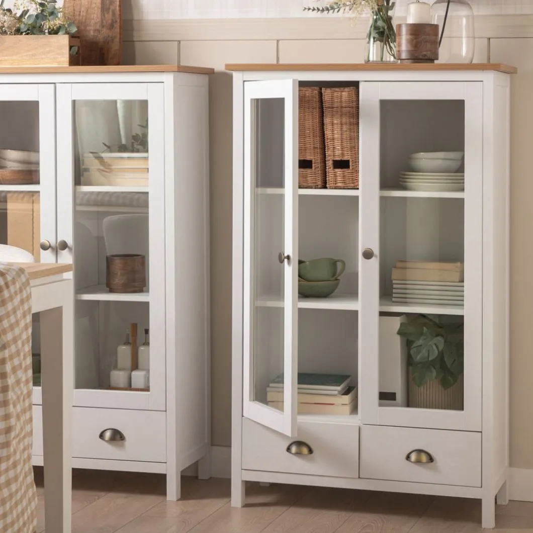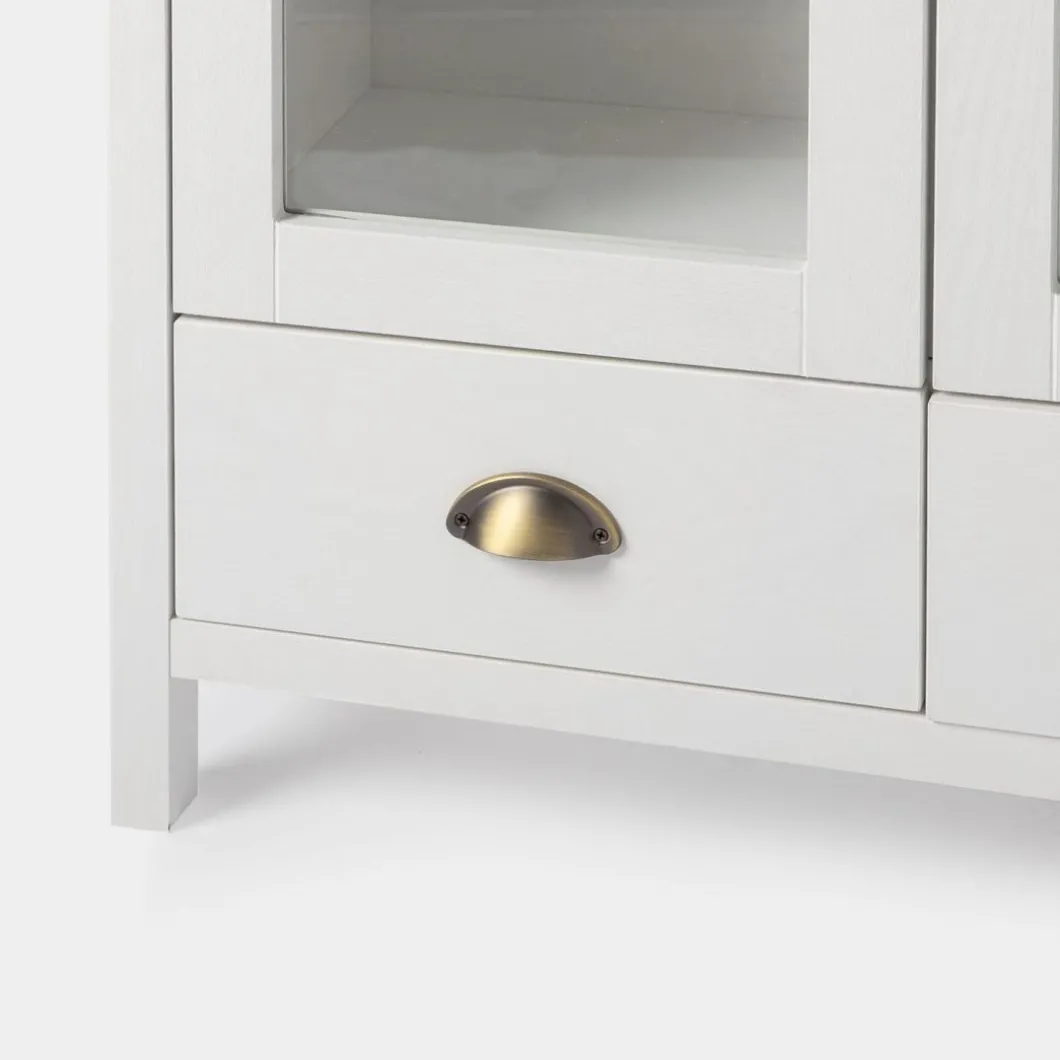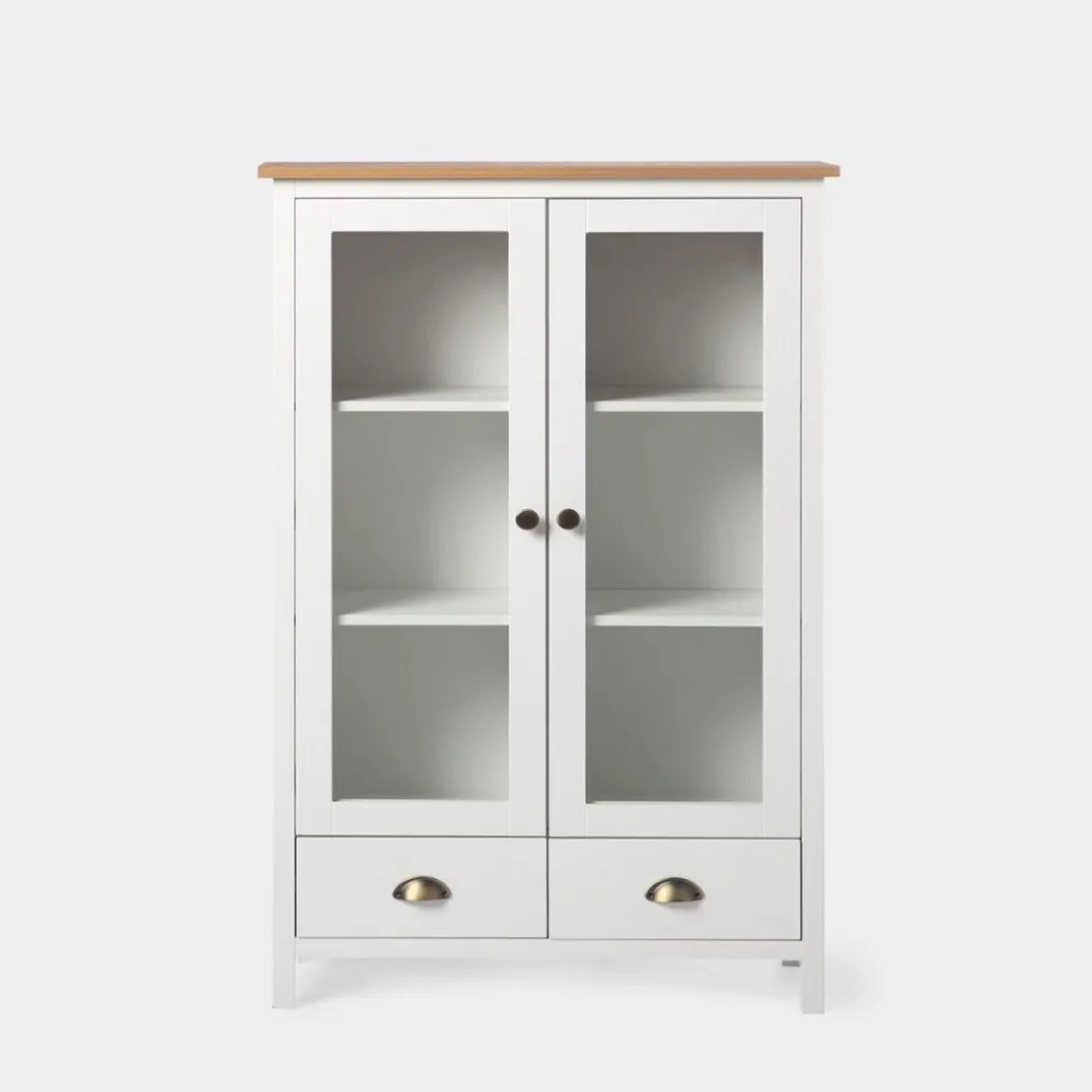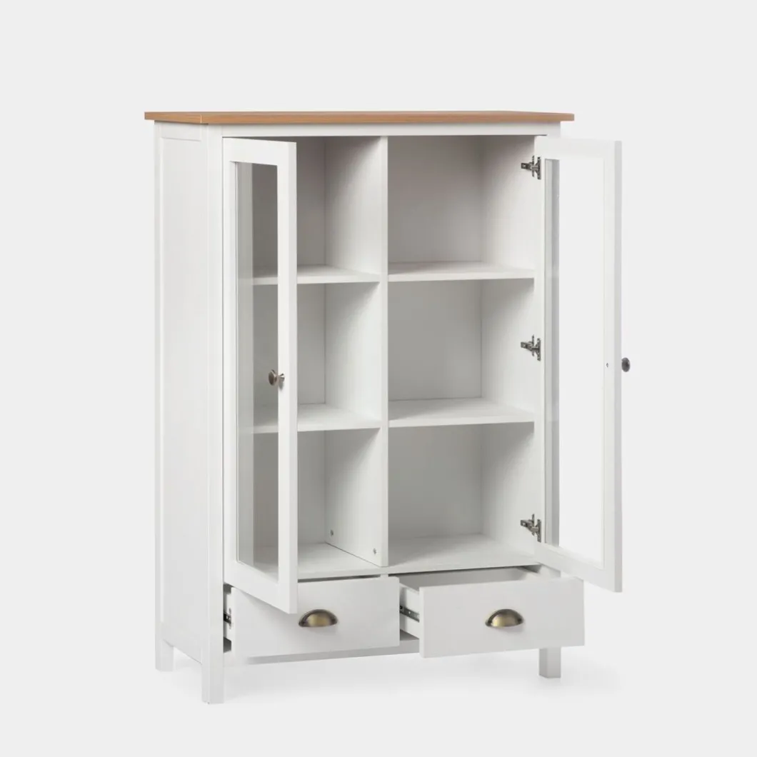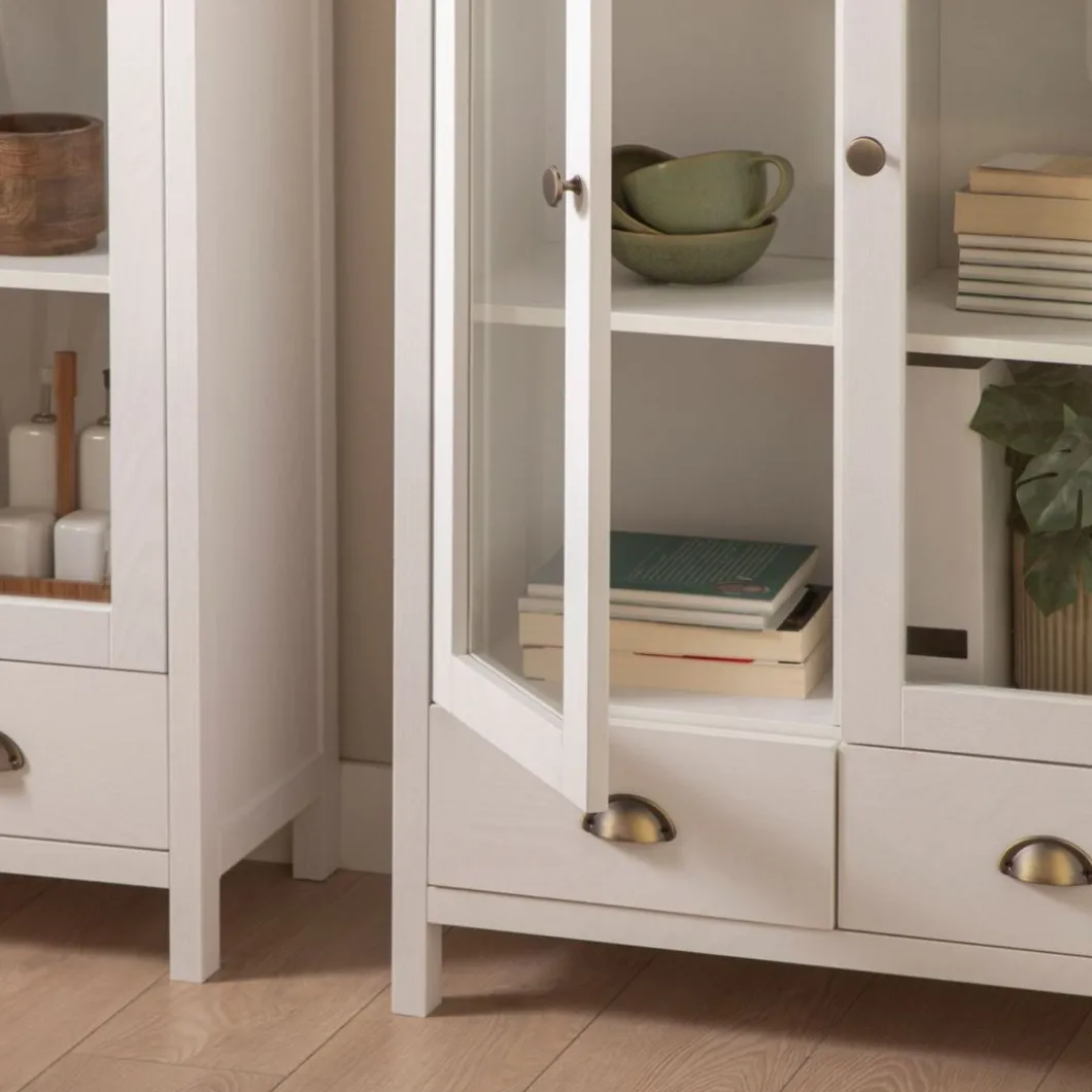 La vitrina estrecha blanca Marais es un clásico que encaja a la perfección en cualquier estilo decorativo. Cuenta con dos amplias puertas acristaladas en las que podrás exponer tu mejor vajilla. Además, también cuenta con un cajón inferior en el que podrás almacenar aquello que no quieras que esté a la vista. Este cajón cuenta con un sistema de cierre con retención que evita que se den golpes al cerrarse e impide la apertura involuntaria. Para mayor estabilidad del mueble, aconsejamos su anclaje a la pared.