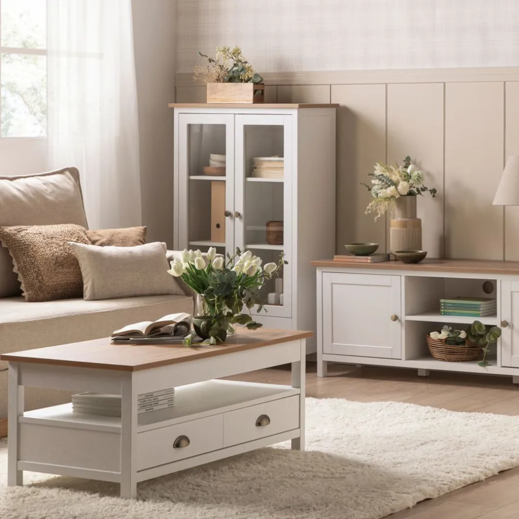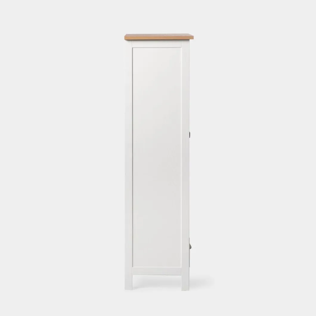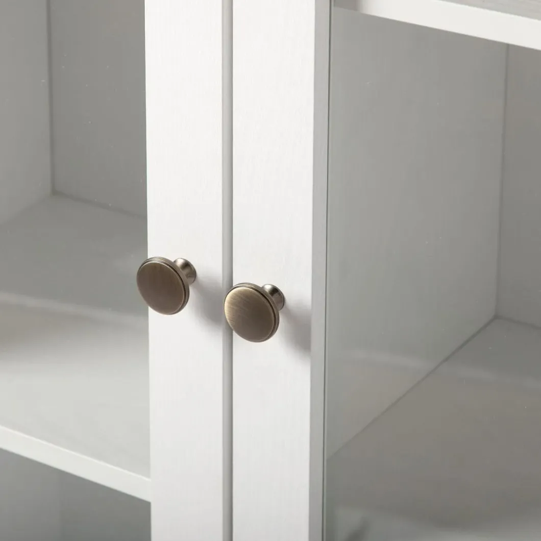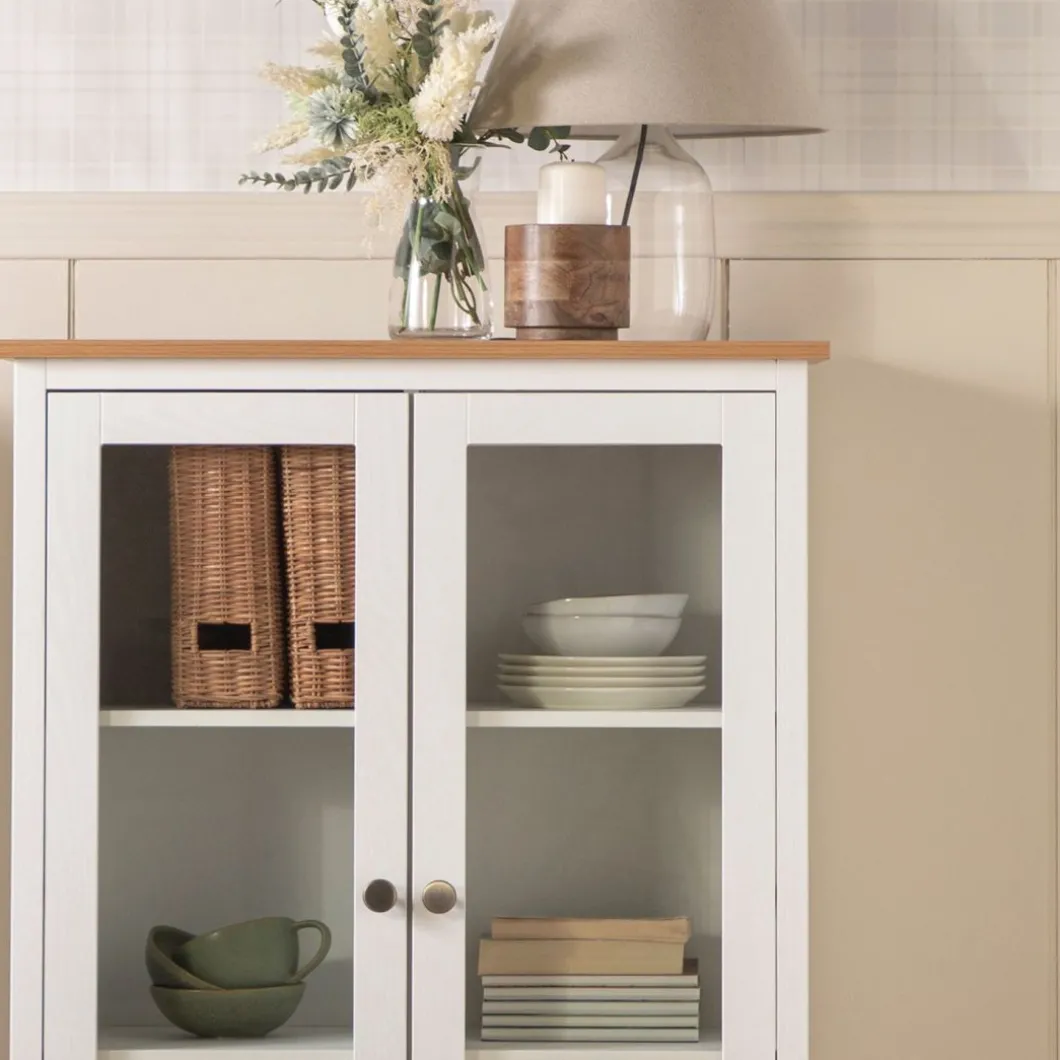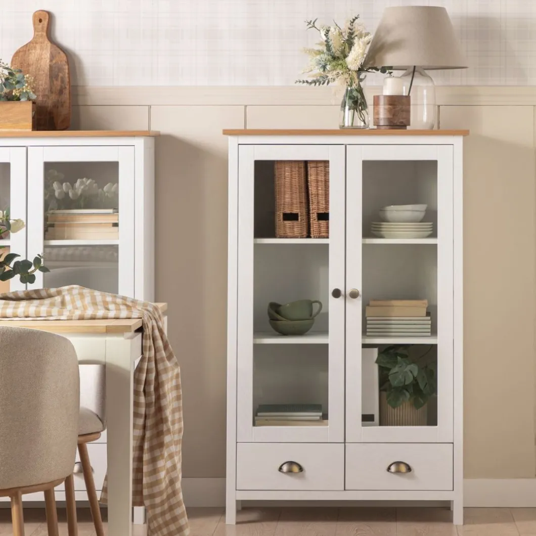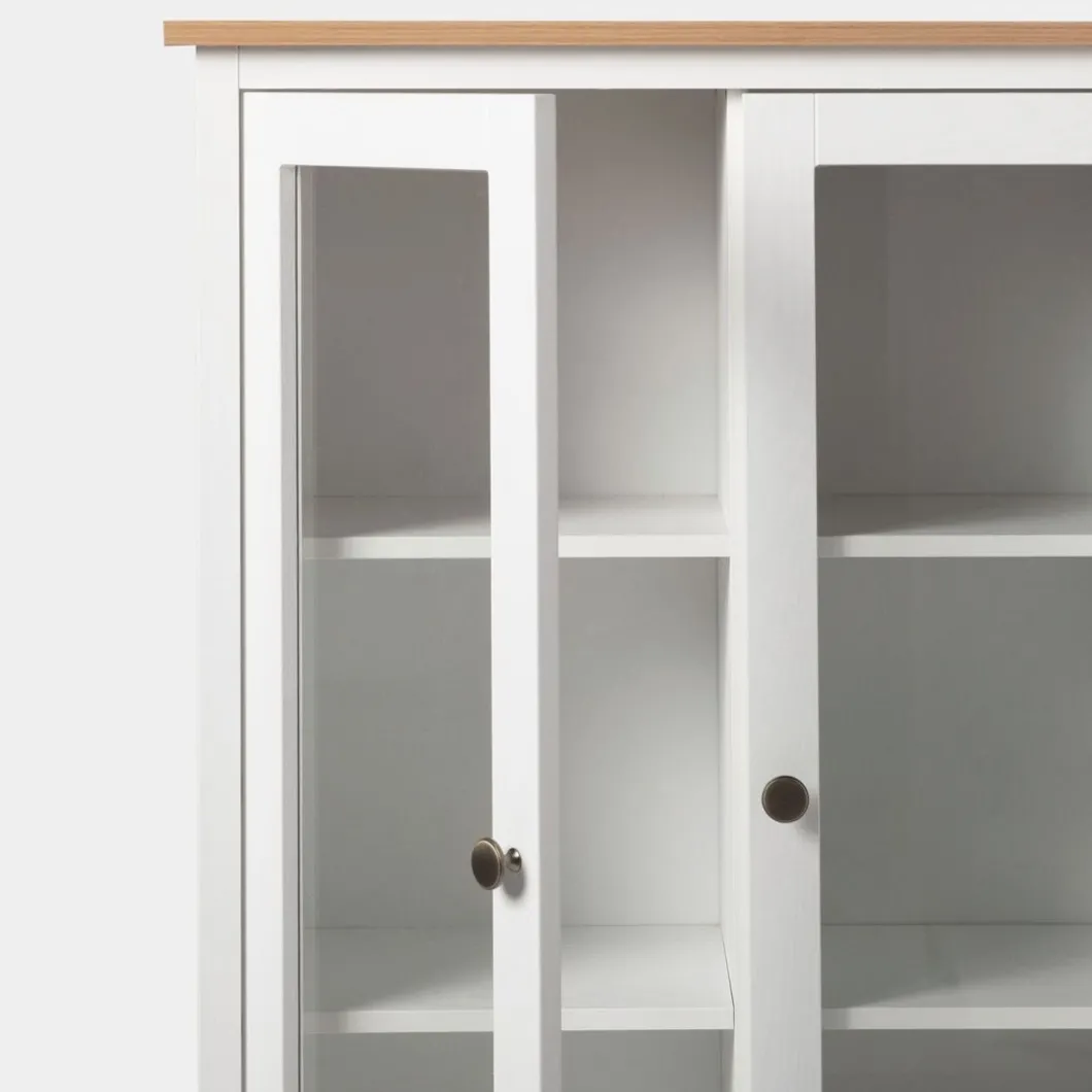 La vitrina estrecha blanca Marais es un clásico que encaja a la perfección en cualquier estilo decorativo. Cuenta con dos amplias puertas acristaladas en las que podrás exponer tu mejor vajilla. Además, también cuenta con un cajón inferior en el que podrás almacenar aquello que no quieras que esté a la vista. Este cajón cuenta con un sistema de cierre con retención que evita que se den golpes al cerrarse e impide la apertura involuntaria. Para mayor estabilidad del mueble, aconsejamos su anclaje a la pared.