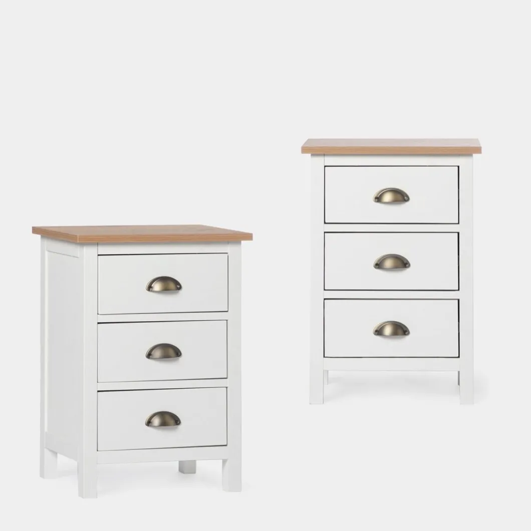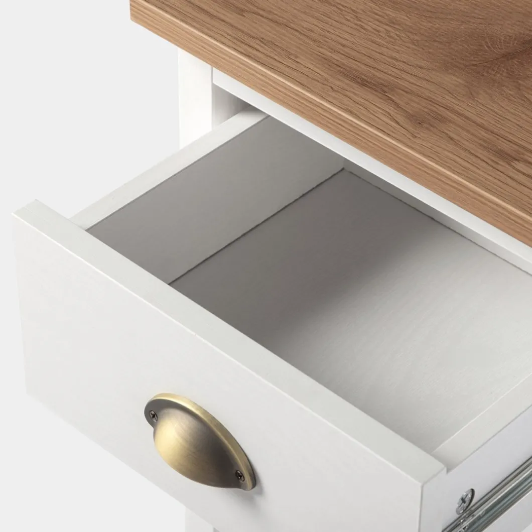 La mesita de noche blanca de 3 cajones Marais es la pieza perfecta para conseguir almacenaje extra y mantener tu dormitorio limpio y ordenado. Gracias a su diseño sencillo y atemporal encaja en cualquier estilo decorativo. Sus tres cajones cuentan con un sistema de cierre con retención que evita que se den golpes al cerrar e impide la apertura involuntaria. Combínala con la cómoda Marais y crea un dormitorio lleno de encanto.