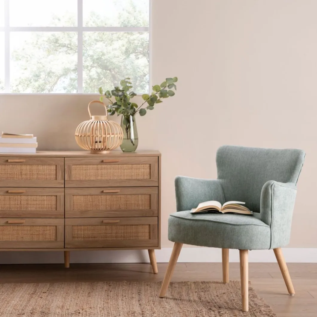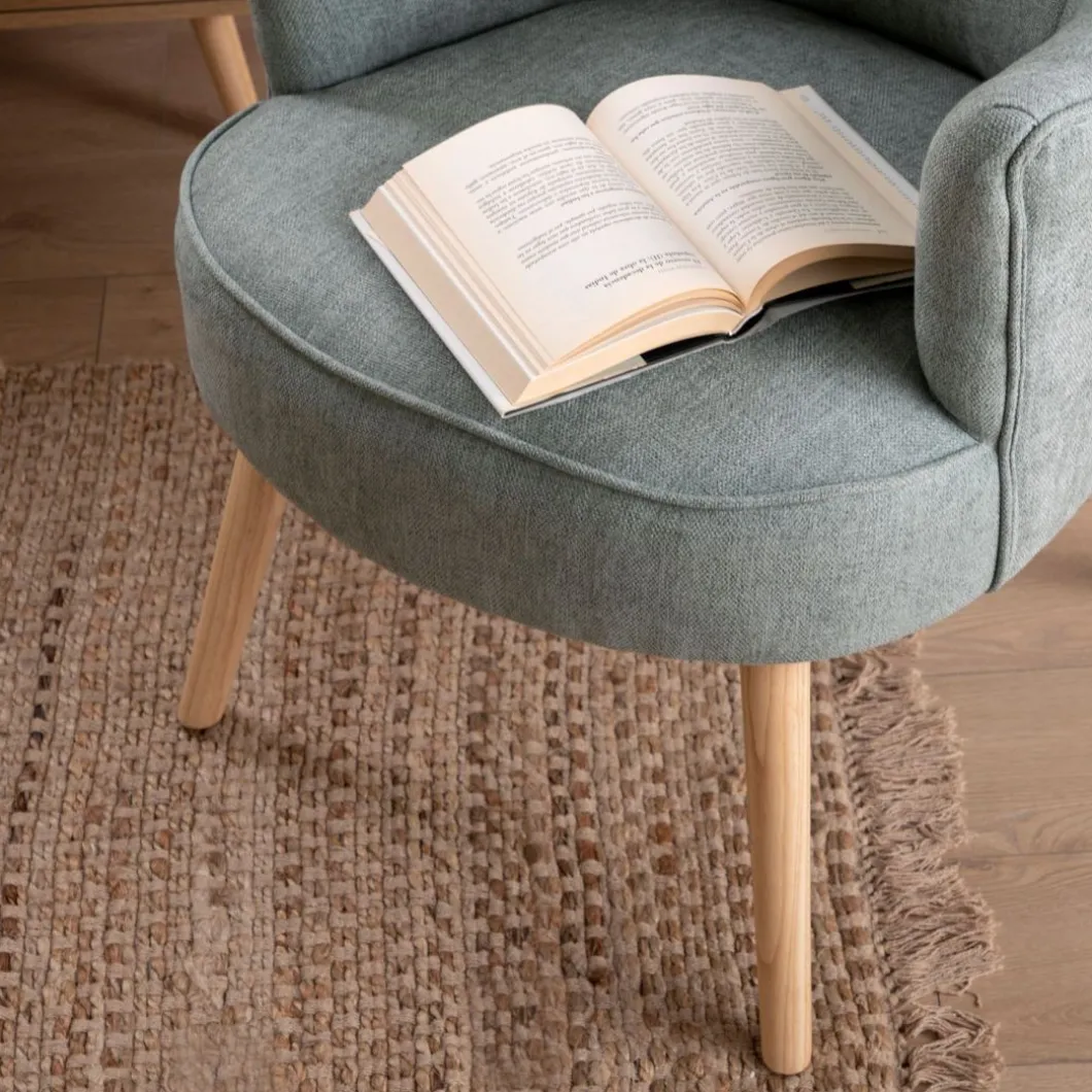 La butaca de lectura Megan tapizada en color verde con pata en madera natural es la pieza que necesitas para crear el rincón de lectura o de descanso perfecto. Está disponible en diferentes colores y acabados para que puedas escoger el que mejor encaje con tu estilo.