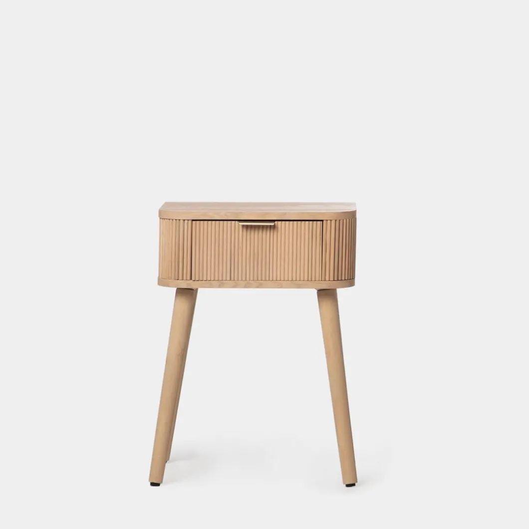 Transforma tu dormitorio en un espacio cálido y acogedor con la mesita de noche Mina, elaborada en chapa de pino y madera de roble. Cuenta con un amplio cajón en el que podrás guardar todos aquellos objetos que no quieres tener a la vista.
