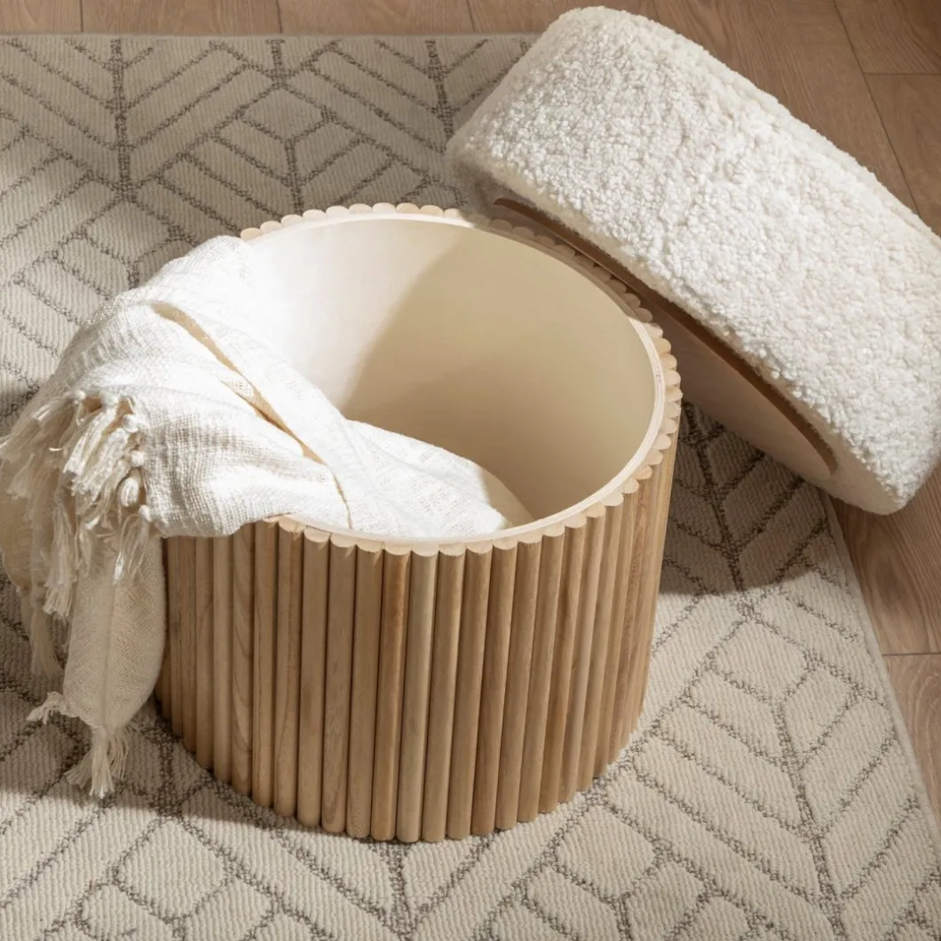 El puf redondo Naira, tapizado en borreguito blanco, es la opción ideal para darle el toque final a la decoración de tu hogar. Su diseño práctico incluye un espacio de almacenaje en su interior, ideal para guardar mantas, cojines y otros objetos, manteniéndolos organizados y fuera de la vista. Con Naira, fusiona estilo y funcionalidad para crear un ambiente acogedor y ordenado en tu hogar.