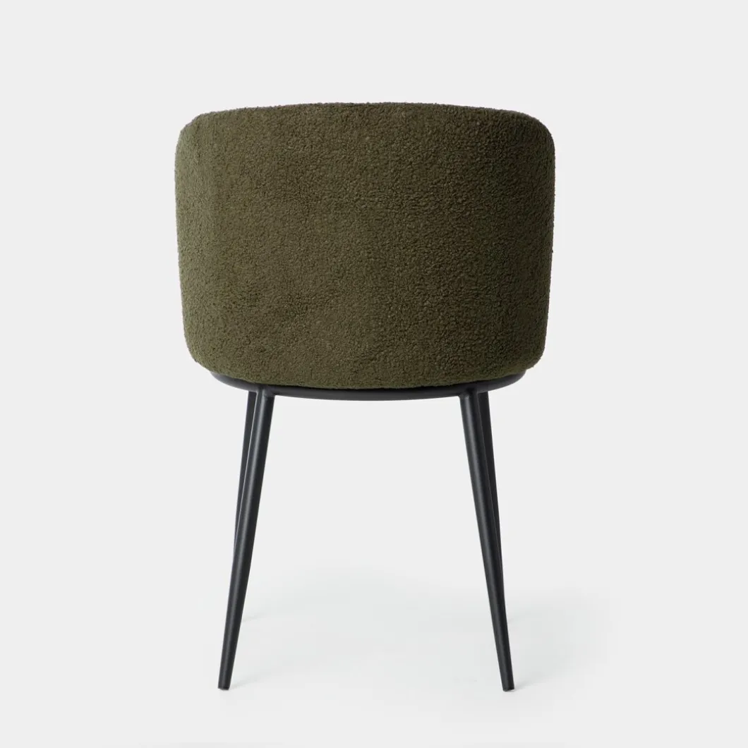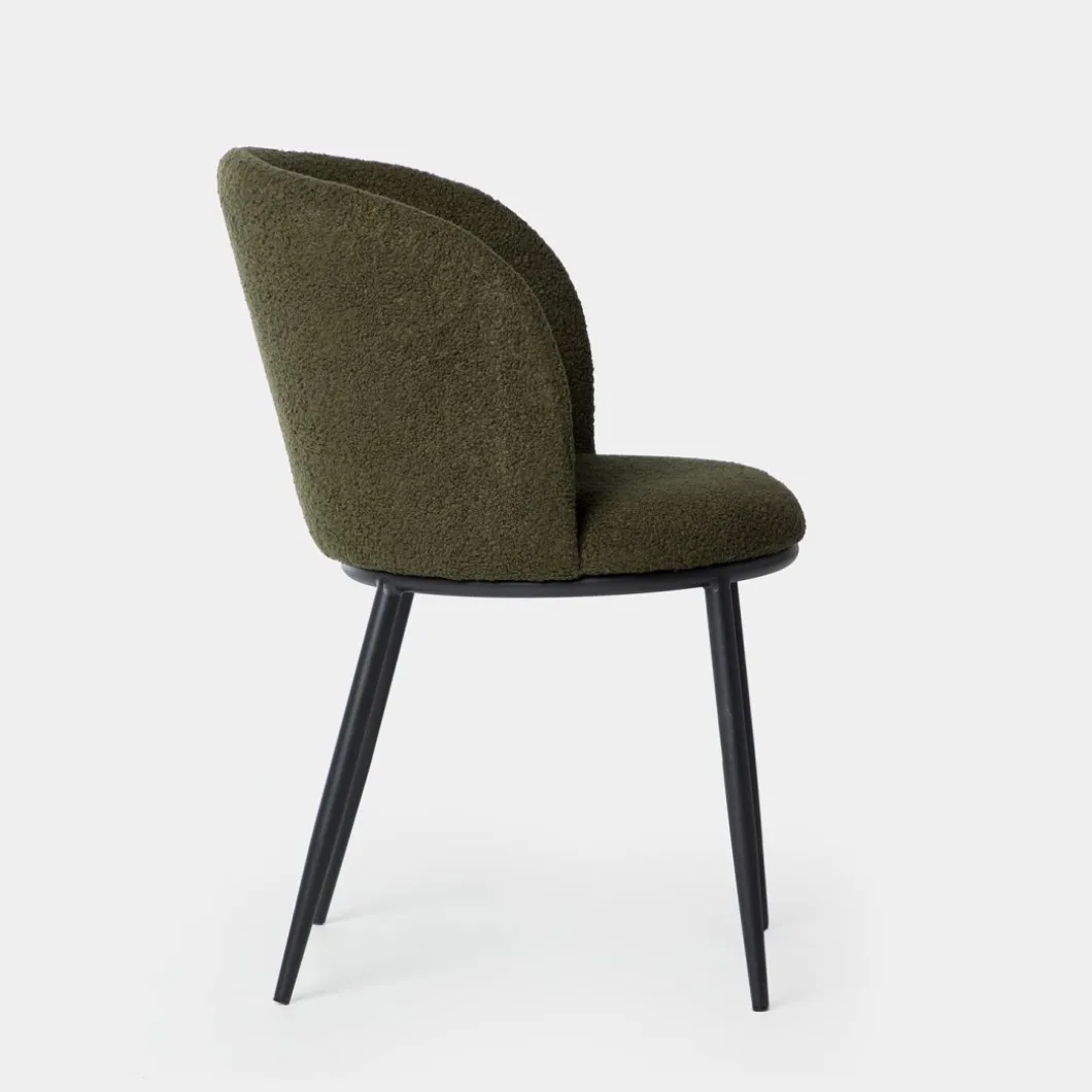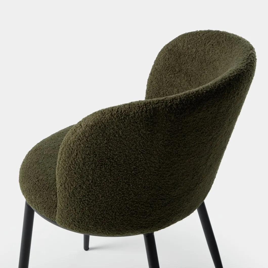 La silla de comedor Nolan tapizada en borreguito verde con pata metálica negra es la pieza ideal para completar la decoración de tu hogar. Su respaldo curvado envuelve a la perfección la espalda y aporta una gran sensación de confort y comodidad. Su tapizado en borreguito derrocha tendencia y estilo.