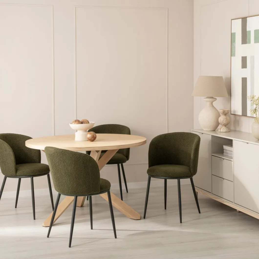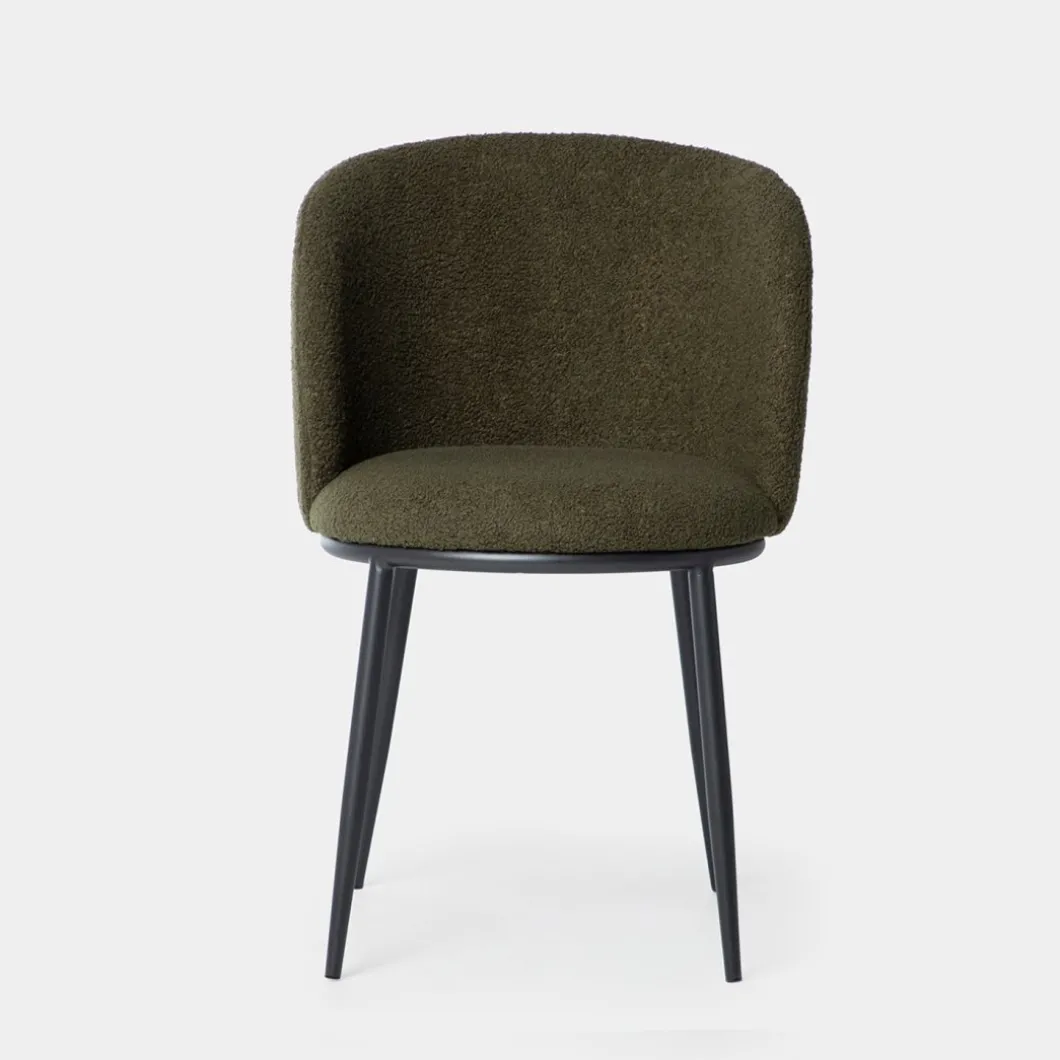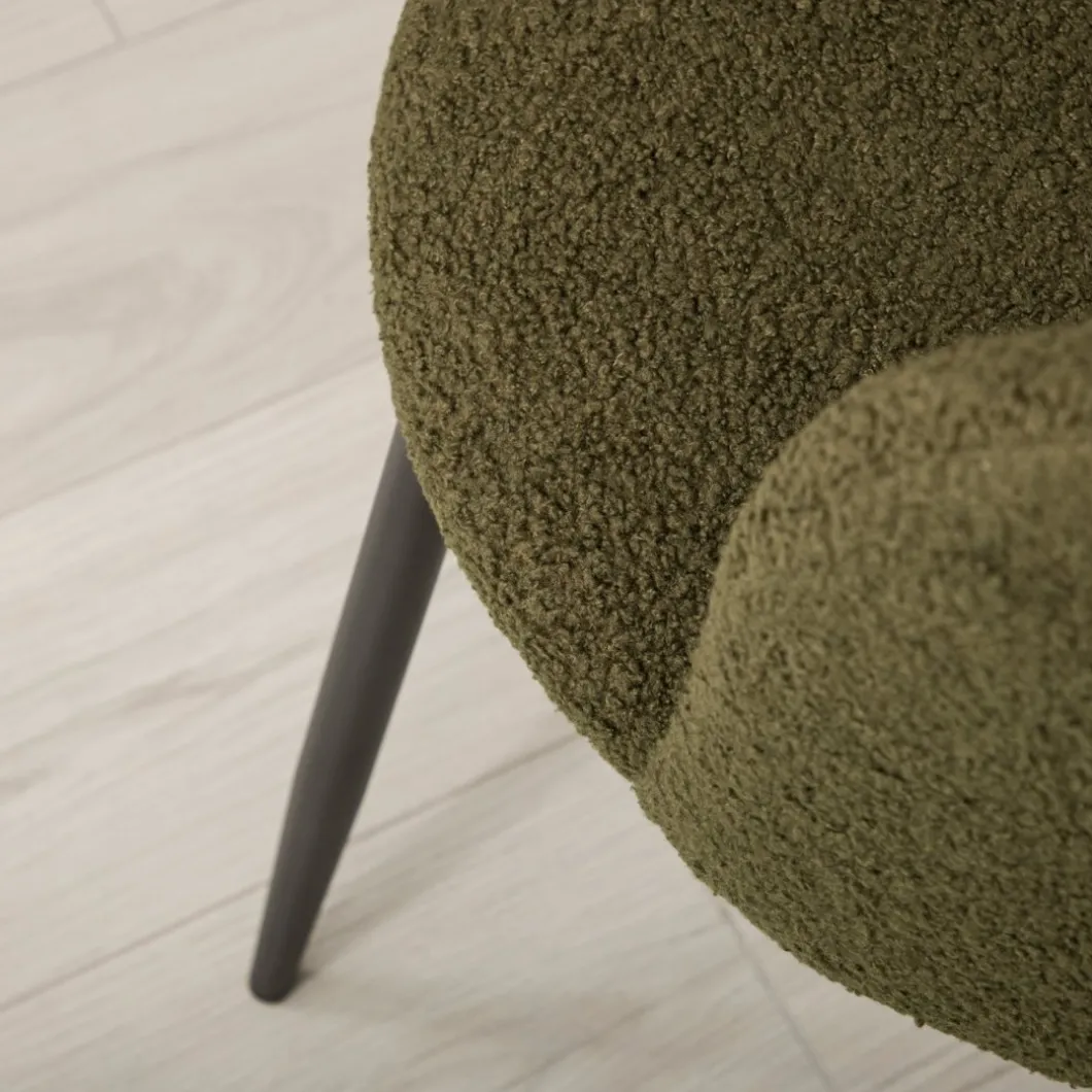 La silla de comedor Nolan tapizada en borreguito verde con pata metálica negra es la pieza ideal para completar la decoración de tu hogar. Su respaldo curvado envuelve a la perfección la espalda y aporta una gran sensación de confort y comodidad. Su tapizado en borreguito derrocha tendencia y estilo.