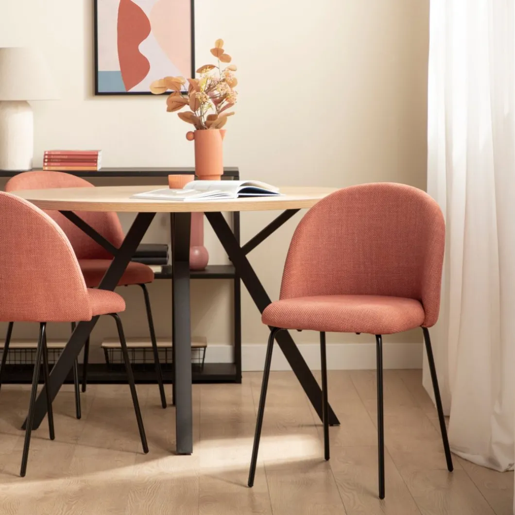 La silla de comedor Olivia tapizada en terracota y pata metálica negra tiene un diseño elegante y sencillo inspirado en los años 50. Su respaldo corto y redondeado unido al diseño de sus patas cónicas despuntadas recuerdan a esos modelos de sillería sofisticados y funcionales adaptables a cualquier estilo. Elige entre una de nuestras tonalidades de tapizados disponibles y haz de esta silla un elemento distintivo de tu salón, comedor o escritorio.