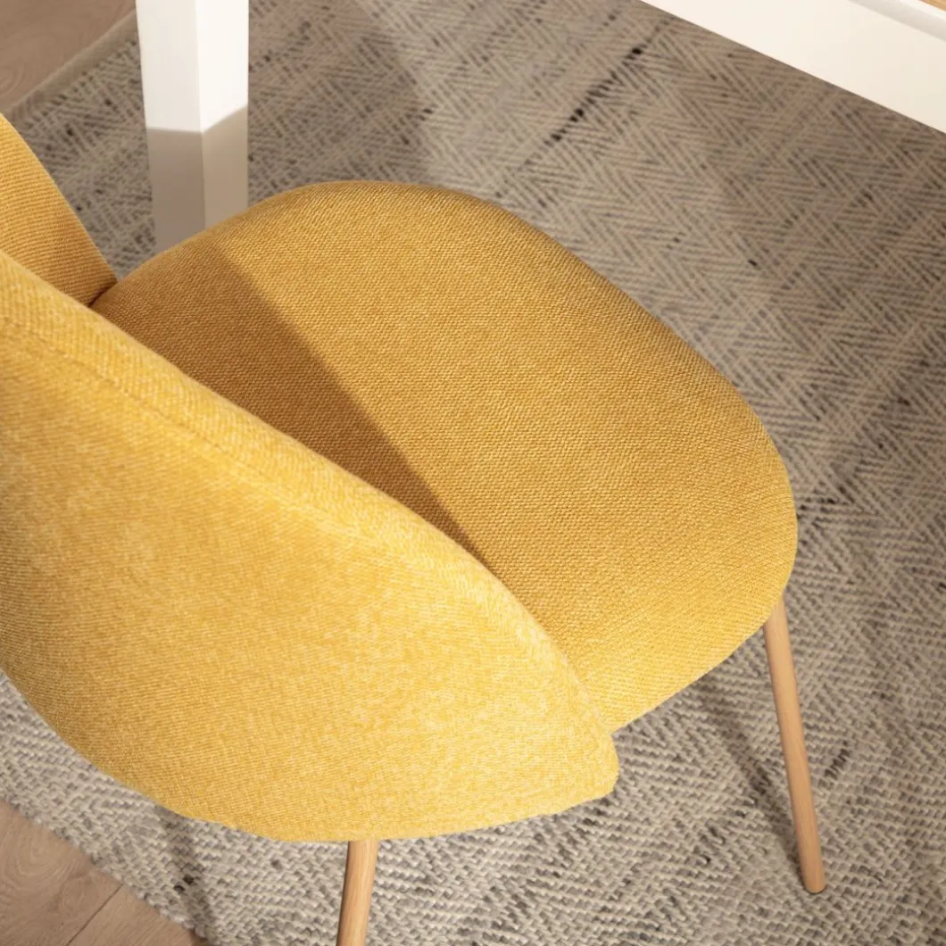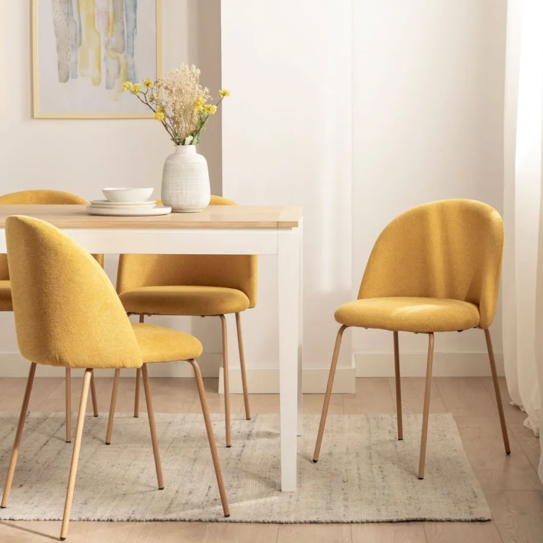¡Aprovéchate de este pack! La silla de comedor Olivia tapizada en color mostaza y pata metálica en color natural tiene un diseño elegante y sencillo inspirado en los años 50. Su respaldo corto y redondeado unido al diseño de sus patas cónicas despuntadas recuerdan a esos modelos de sillería sofisticados y funcionales adaptables a cualquier estilo.