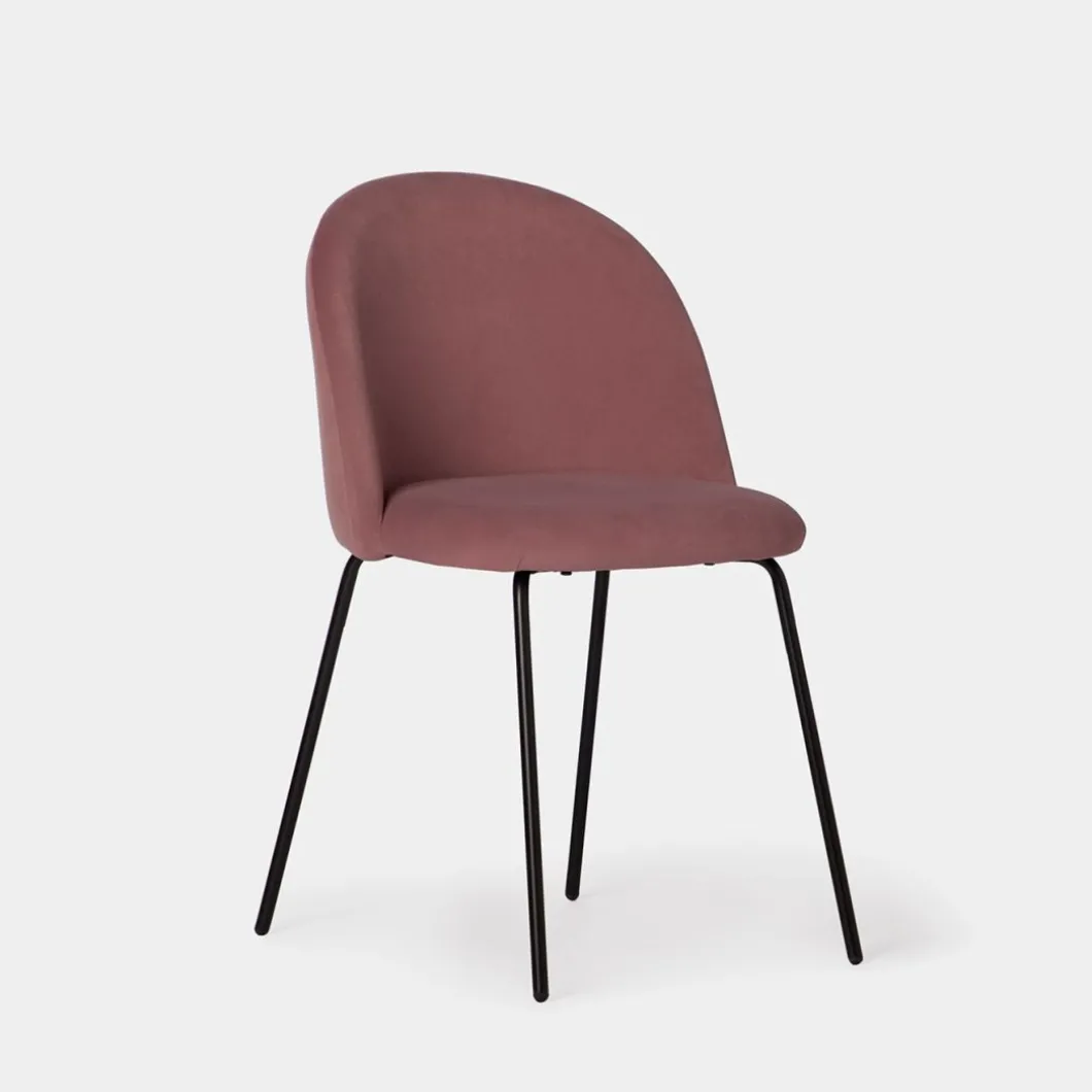 La silla de comedor Olivia en terciopelo rosa y pata metálica negra tiene un diseño elegante y sencillo inspirado en los años 50. Su respaldo corto y redondeado unido al diseño de sus patas cónicas despuntadas recuerdan a esos modelos de sillería sofisticados y funcionales adaptables a cualquier estilo.
