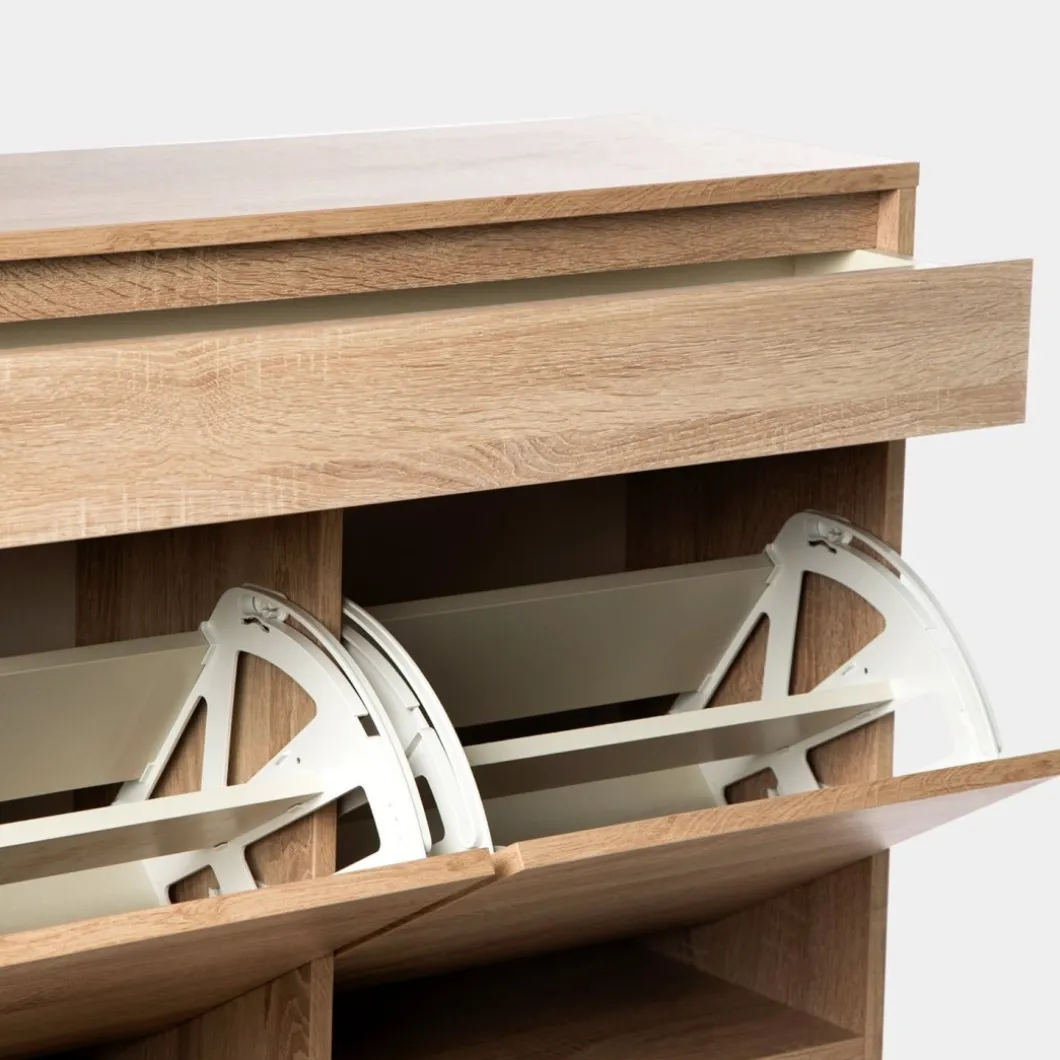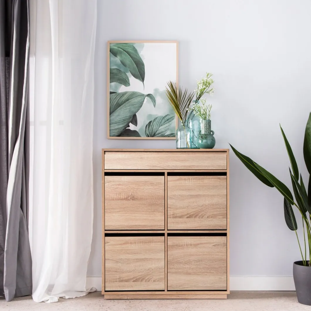 El zapatero Oslo es la solución perfecta para mantener tus zapatos organizados con estilo. Su diseño compacto lo convierte en la opción ideal para pasillos, entradas o dormitorios. Equipado con 4 puertas y un cajón en la parte superior, este versátil mueble tiene capacidad para almacenar hasta 16 pares de zapatos. Cada compartimento cuenta con separadores ajustables y/o extraíbles, permitiéndote adaptarlo fácilmente para botas u otros calzados voluminosos. Para garantizar su estabilidad, se recomienda fijarlo a la pared.